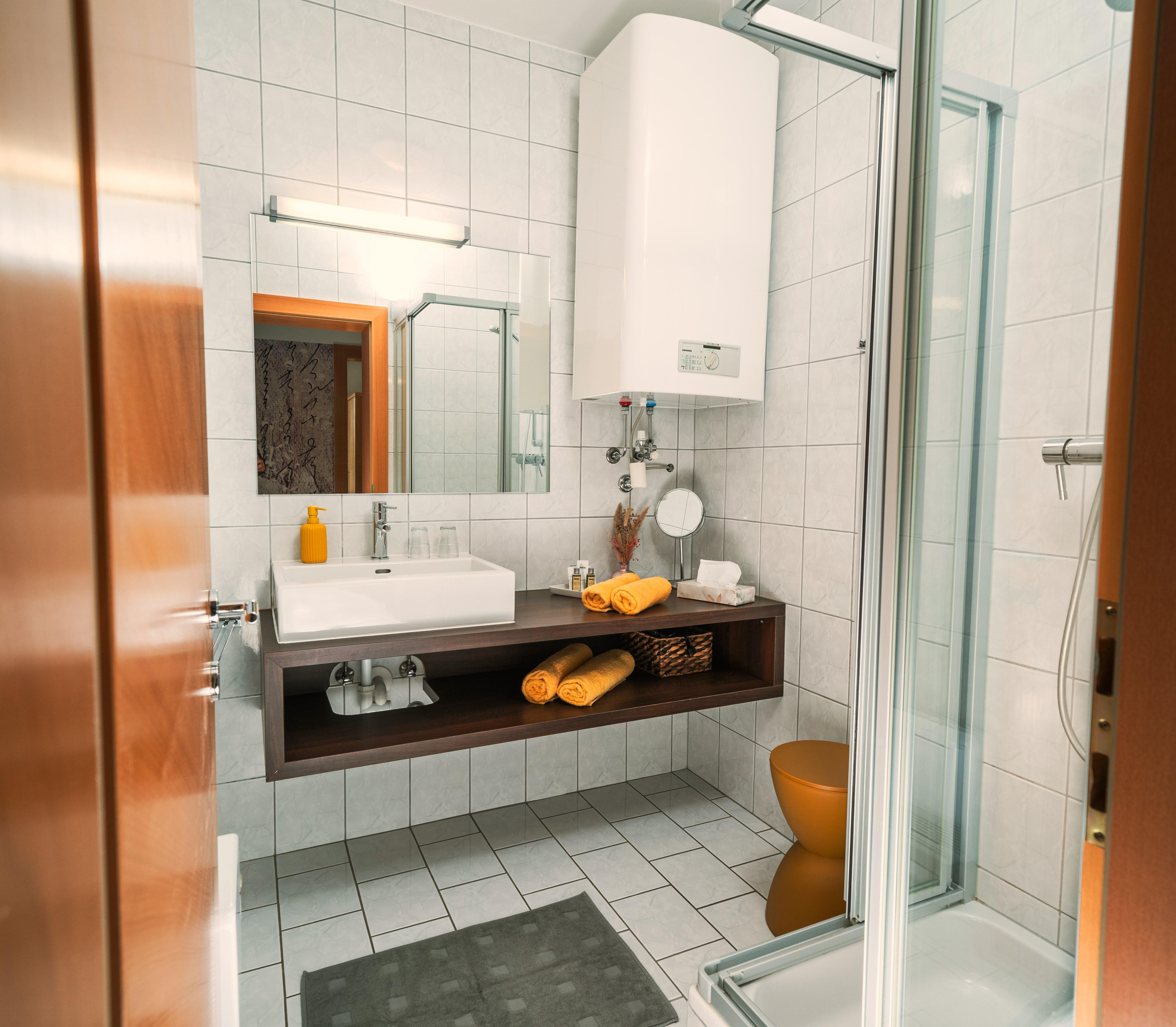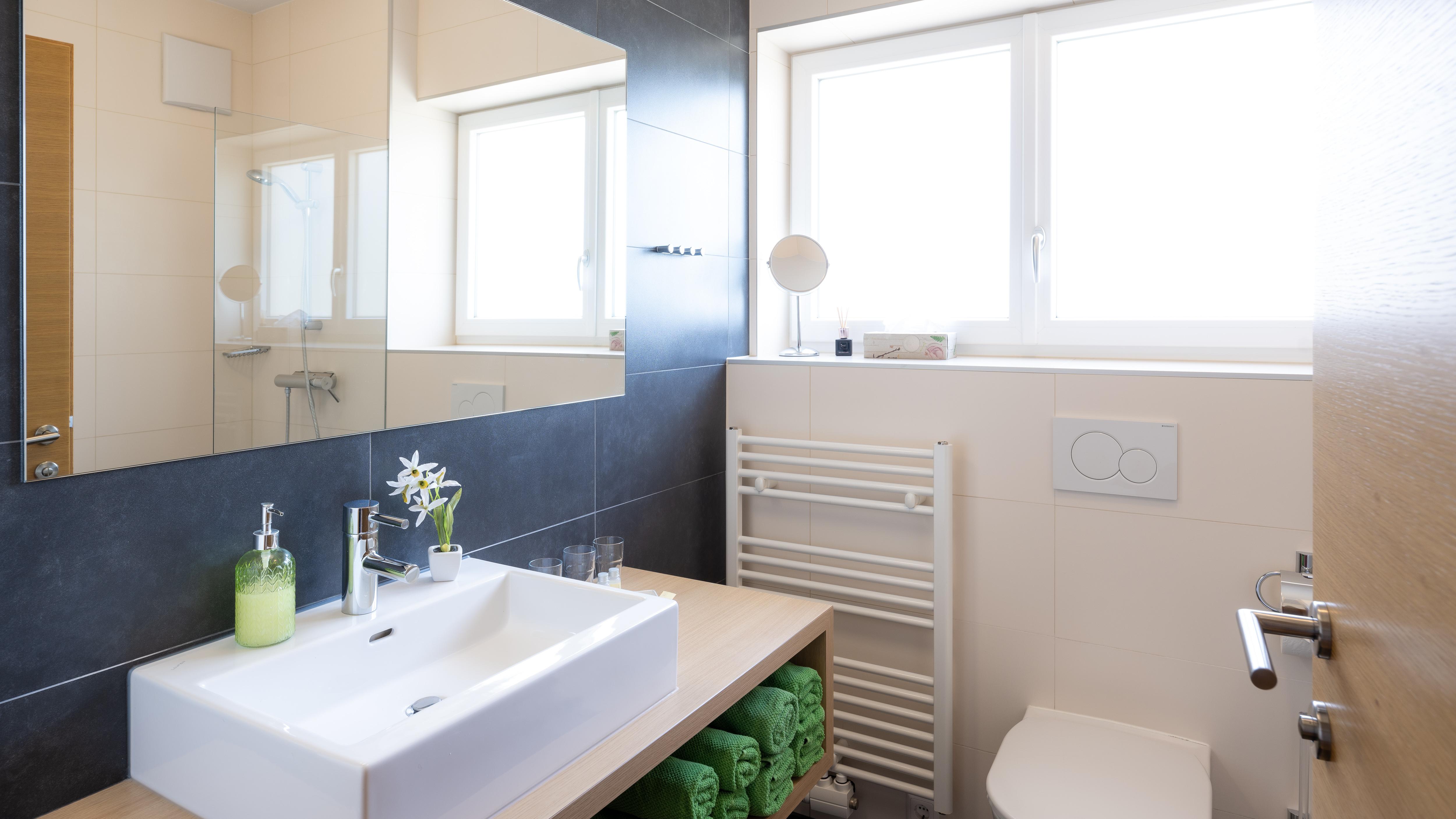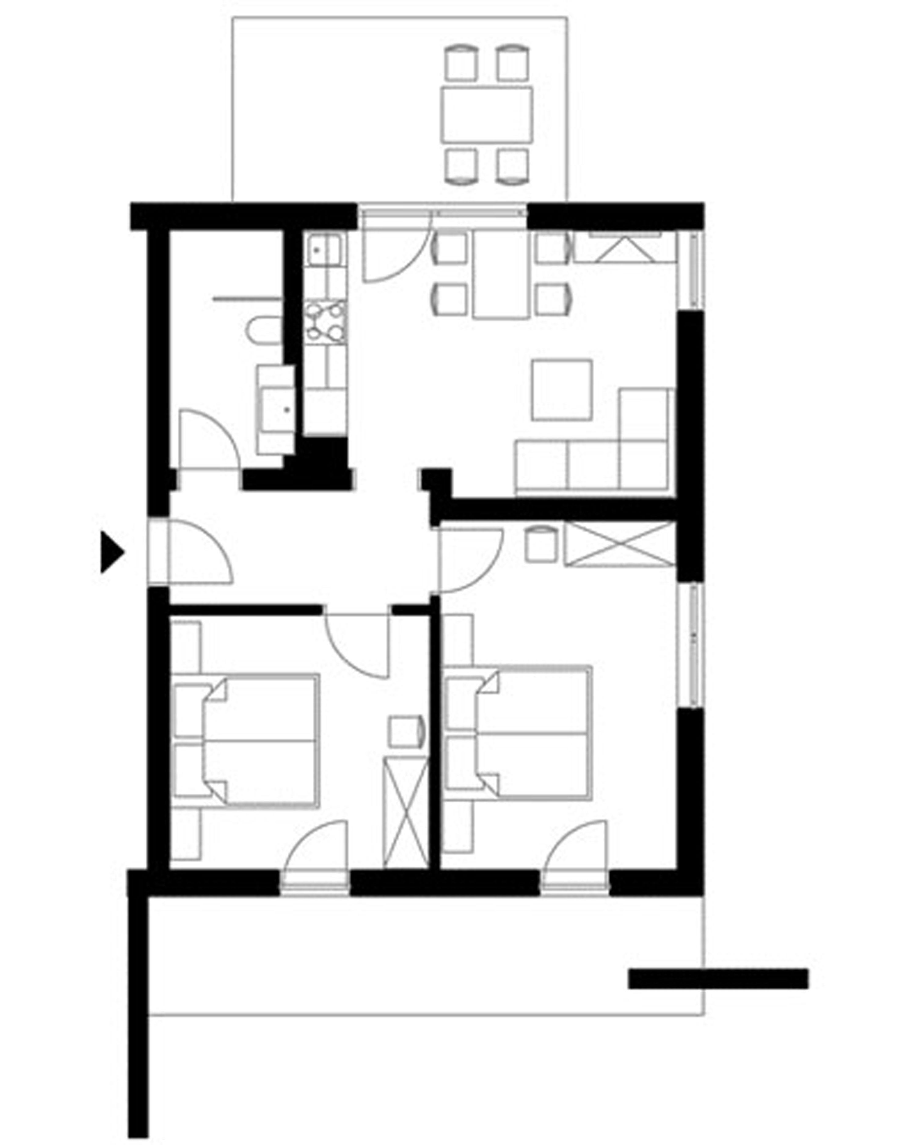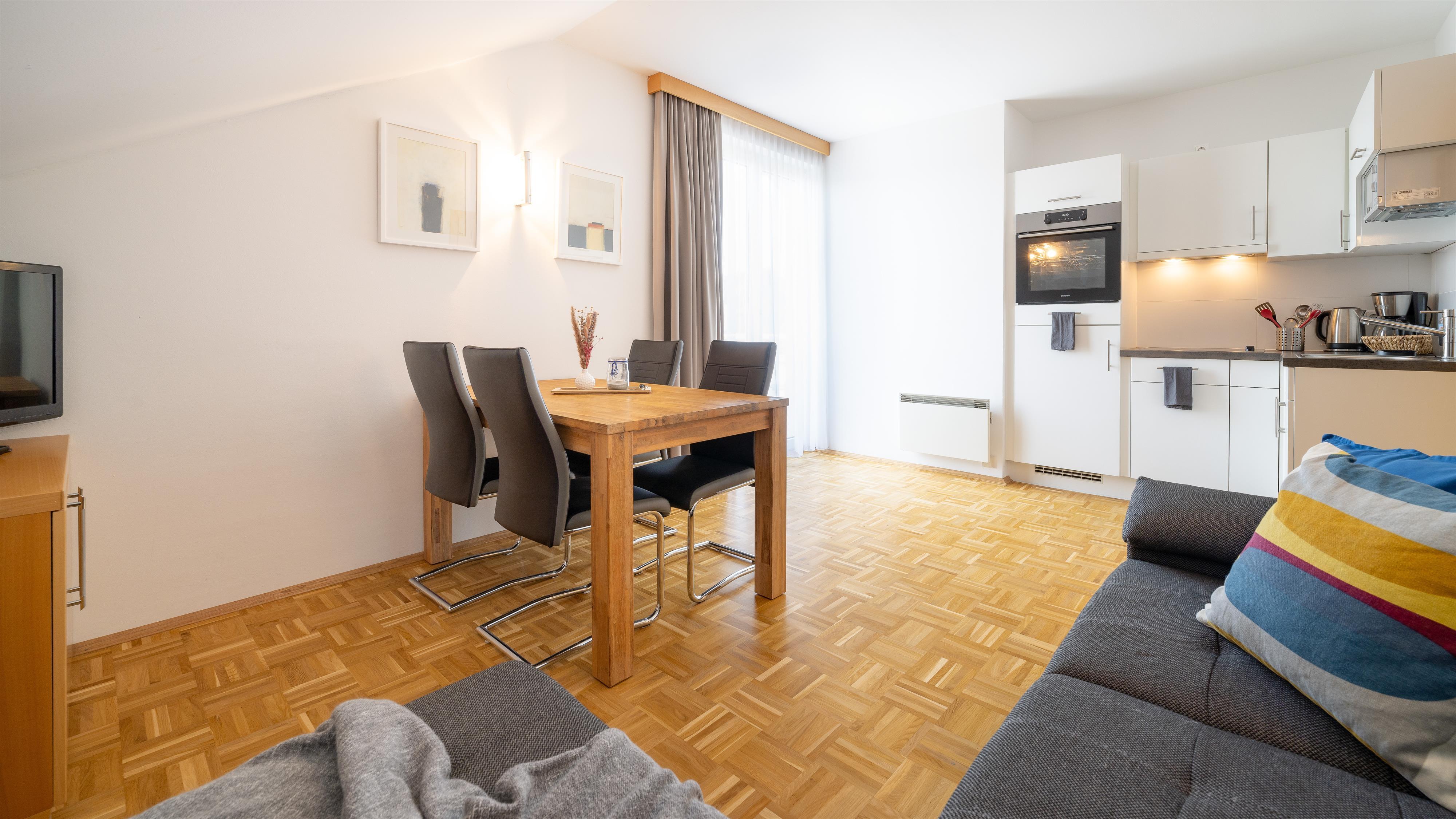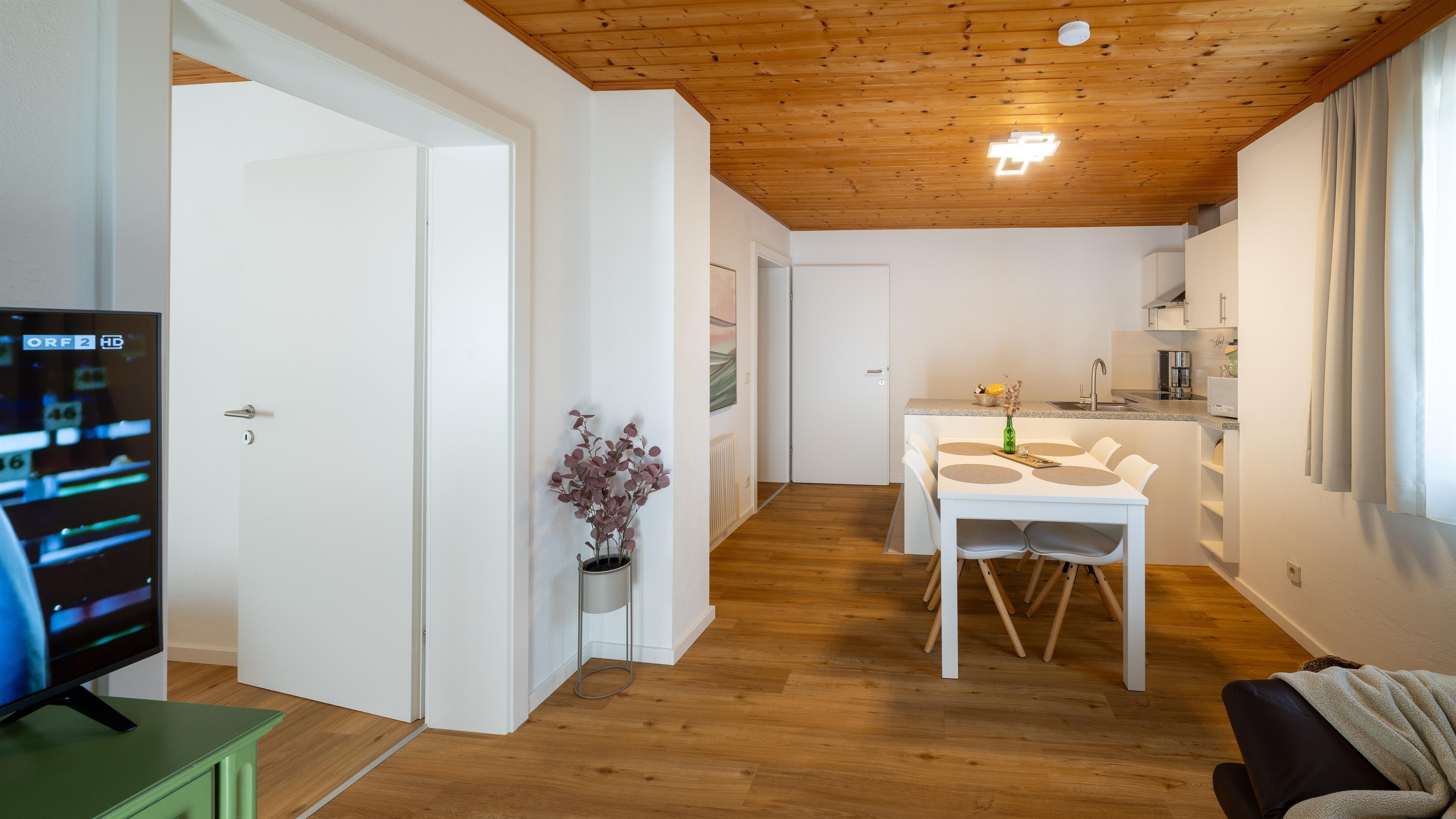 Die Wohnungen bestehen aus einem Vorraum, zwei Doppelzimmer, Badezimmer/WC,Fön, einem Wohnzimmer mit ausziehbarer Couchgarnitur, Esstisch, LCD-TV mit Musikkanal, Internet über W-LAN, komplett ausgestatteter Küche mit Mikrowelle, Geschirrspüler, Backofen, Kaffeemaschine, Sodastream uvm. sowie einer großen Terrassen mit Terrassenmöbel, 2 Sonnenliegen und einen Griller. Bett- u. Tischwäsche, Geschirr- u. Handtücher werden bereitgestellt. Auf Wunsch Zustellbett, Kinderbett (Gitterbett) und Hochstuhl. Waschservice gegen Gebühr im Haus.