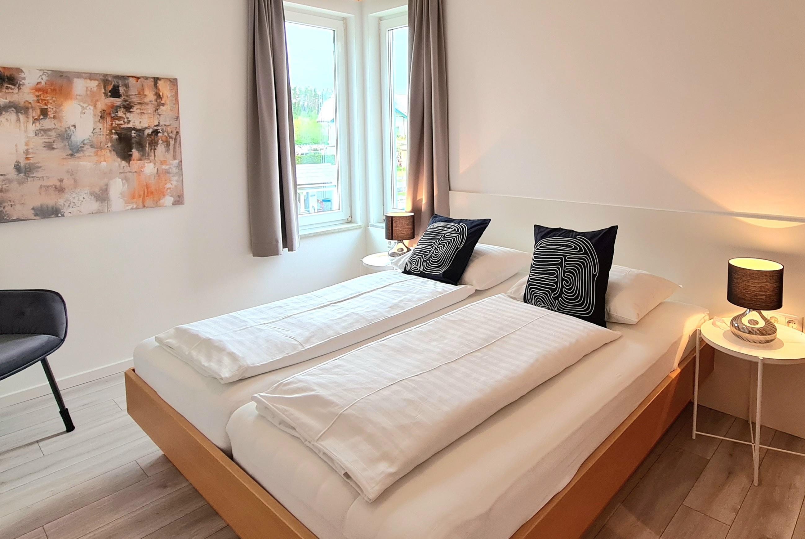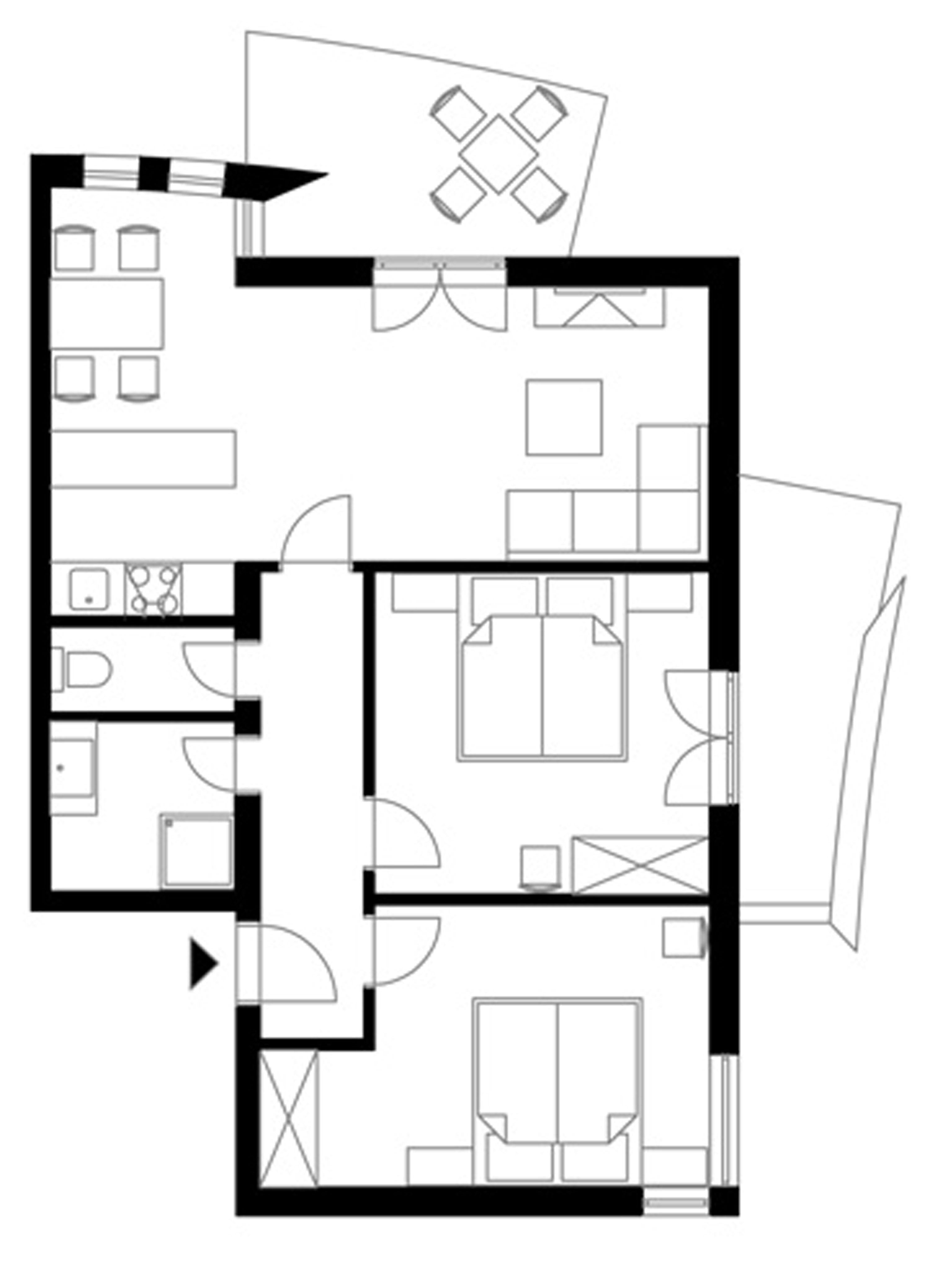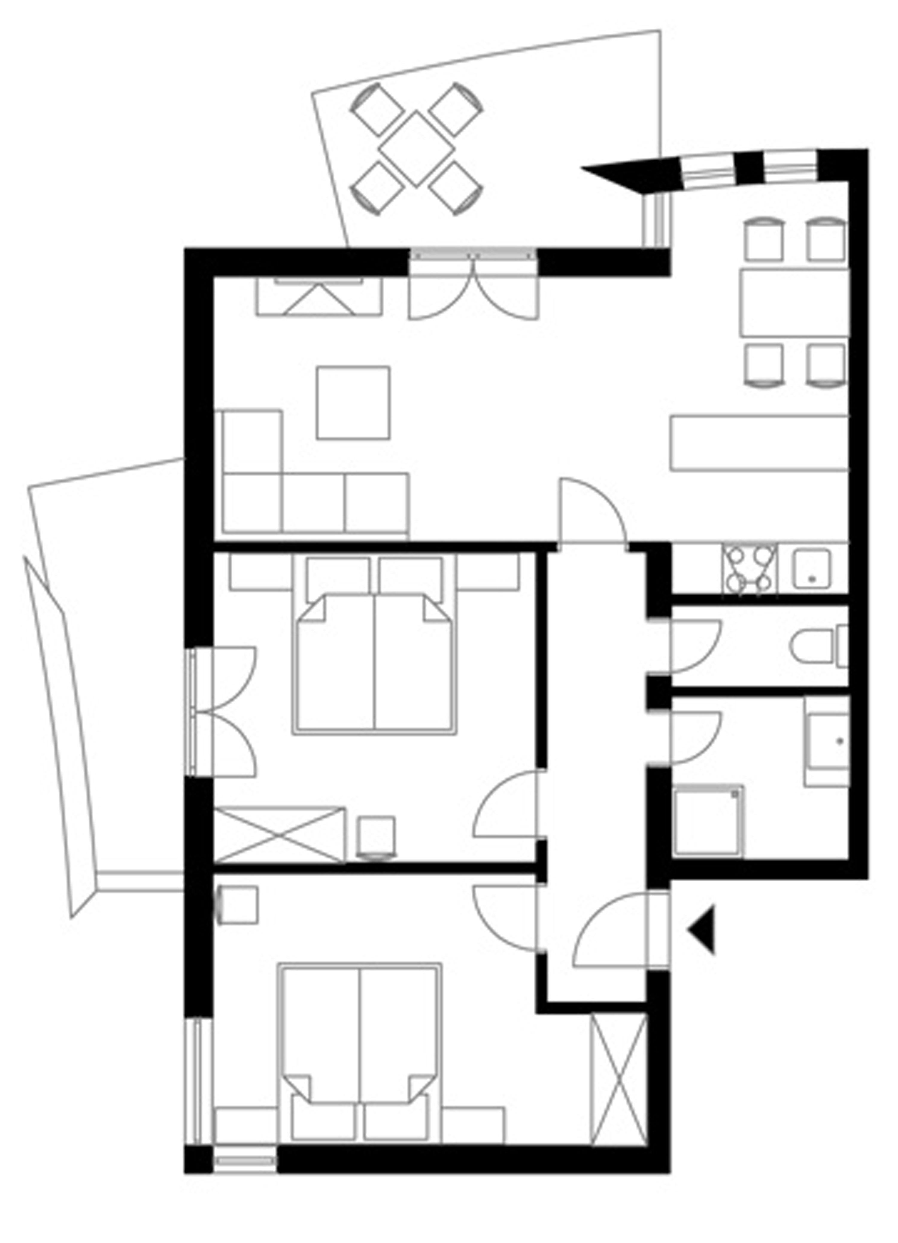 Die Wohnungen bestehen aus einem Vorraum, zwei Doppelzimmern, Dusche, sep. WC,Fön, einem Wohnzimmer mit ausziehbarer Couchgarnitur, Esstisch, LCD-TV mit Musikkanal, Internet über W-LAN, komplett ausgestatteter Küche mit Mikrowelle, Geschirrspüler, Backofen, Kaffeemaschine uvm. sowie zwei großen Balkonen mit Terrassenmöbel. Bett- u. Tischwäsche, Geschirr- u. Handtücher werden bereitgestellt. Auf Wunsch Zustellbett, Kinderbett (Gitterbett) und Hochstuhl. Waschservice gegen Gebühr im Haus.