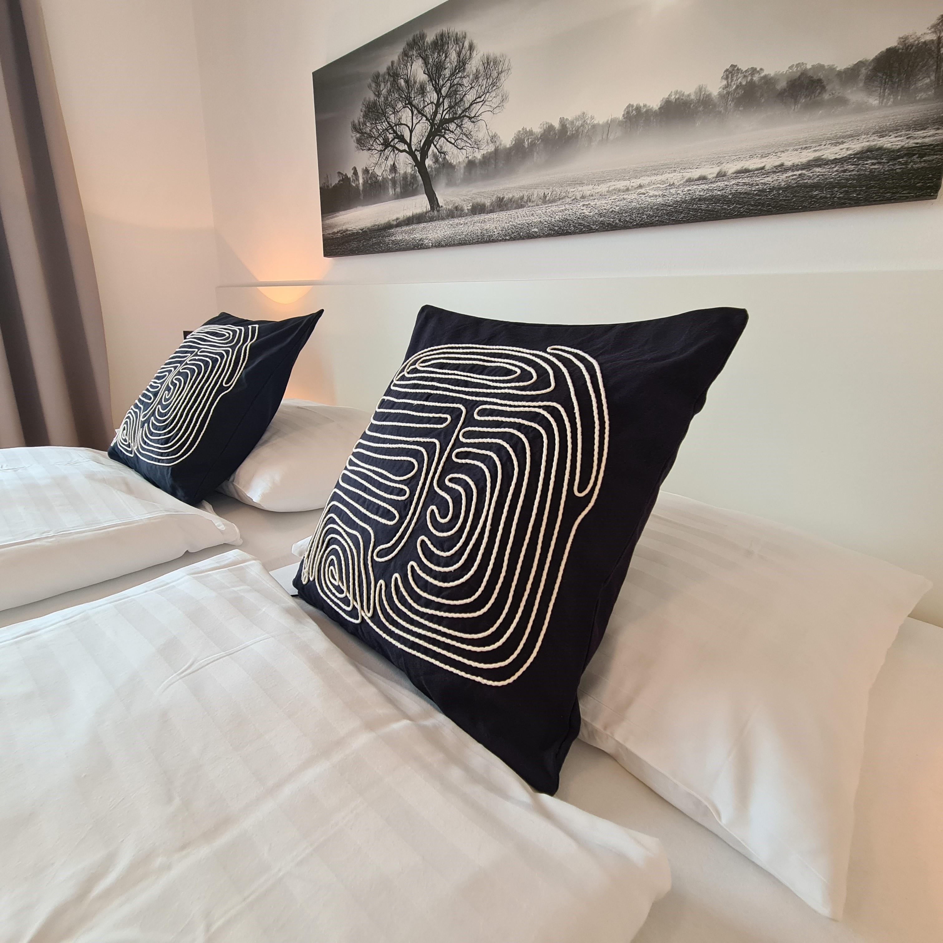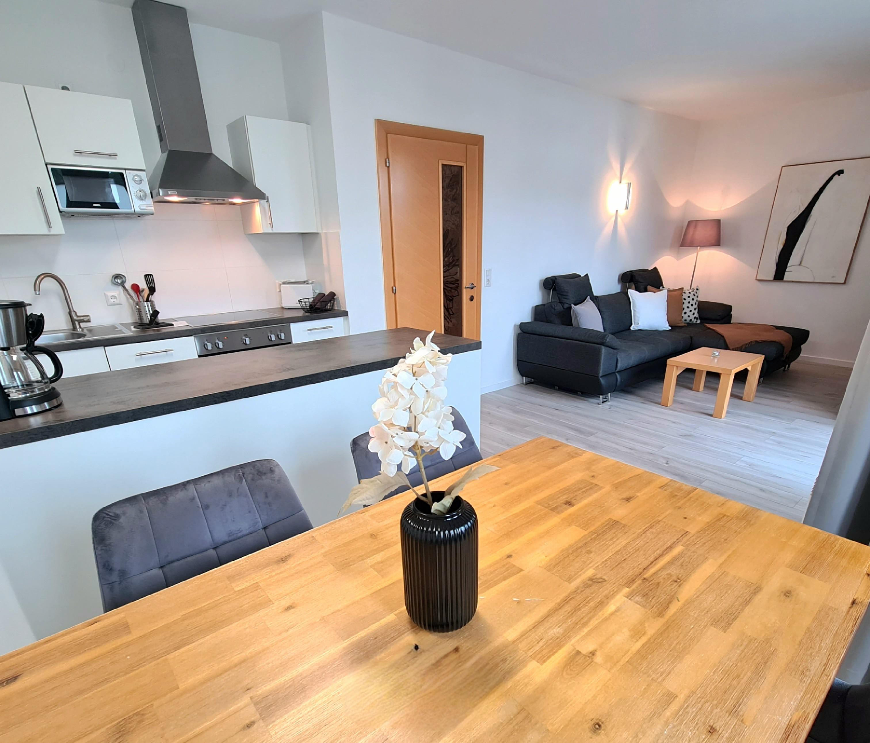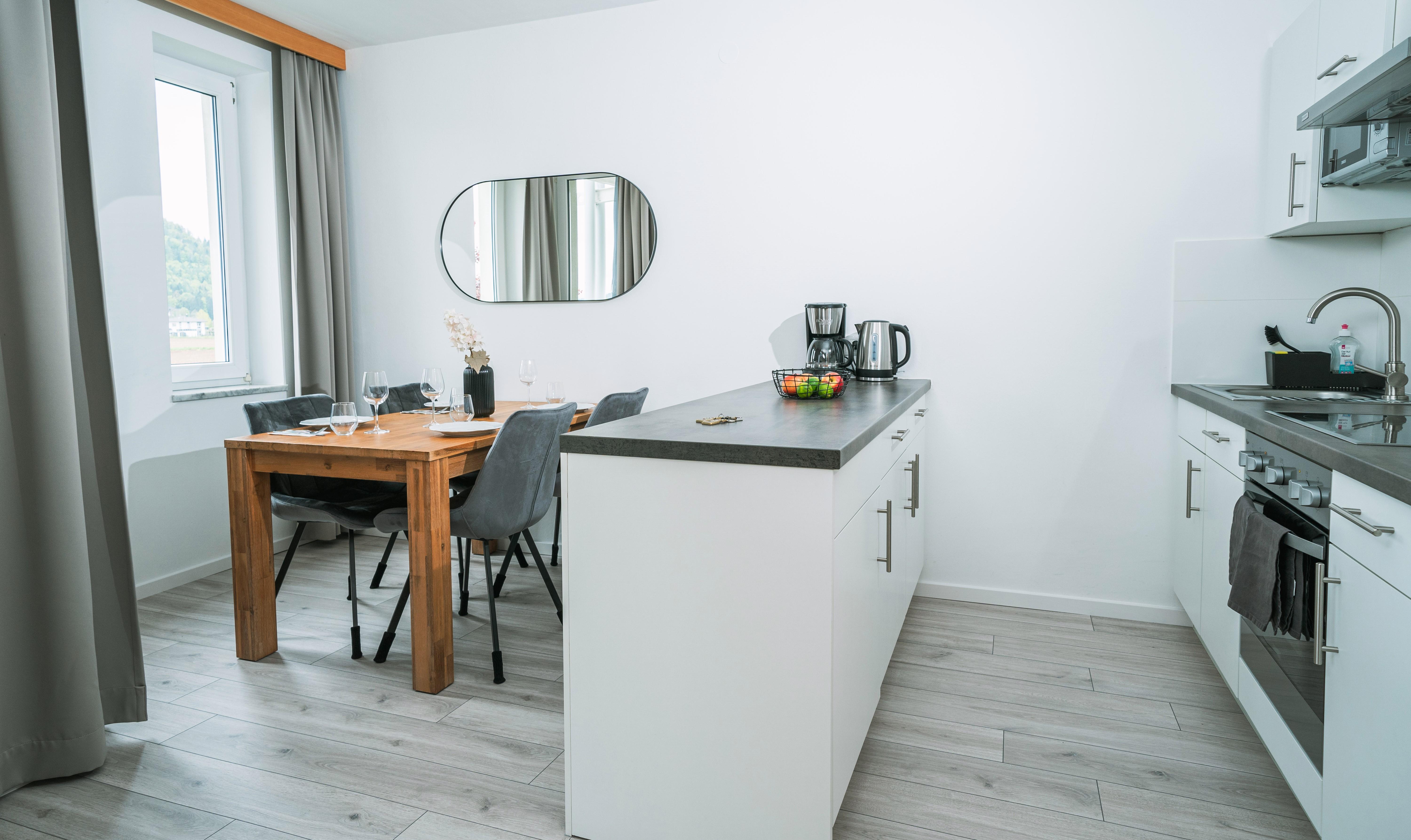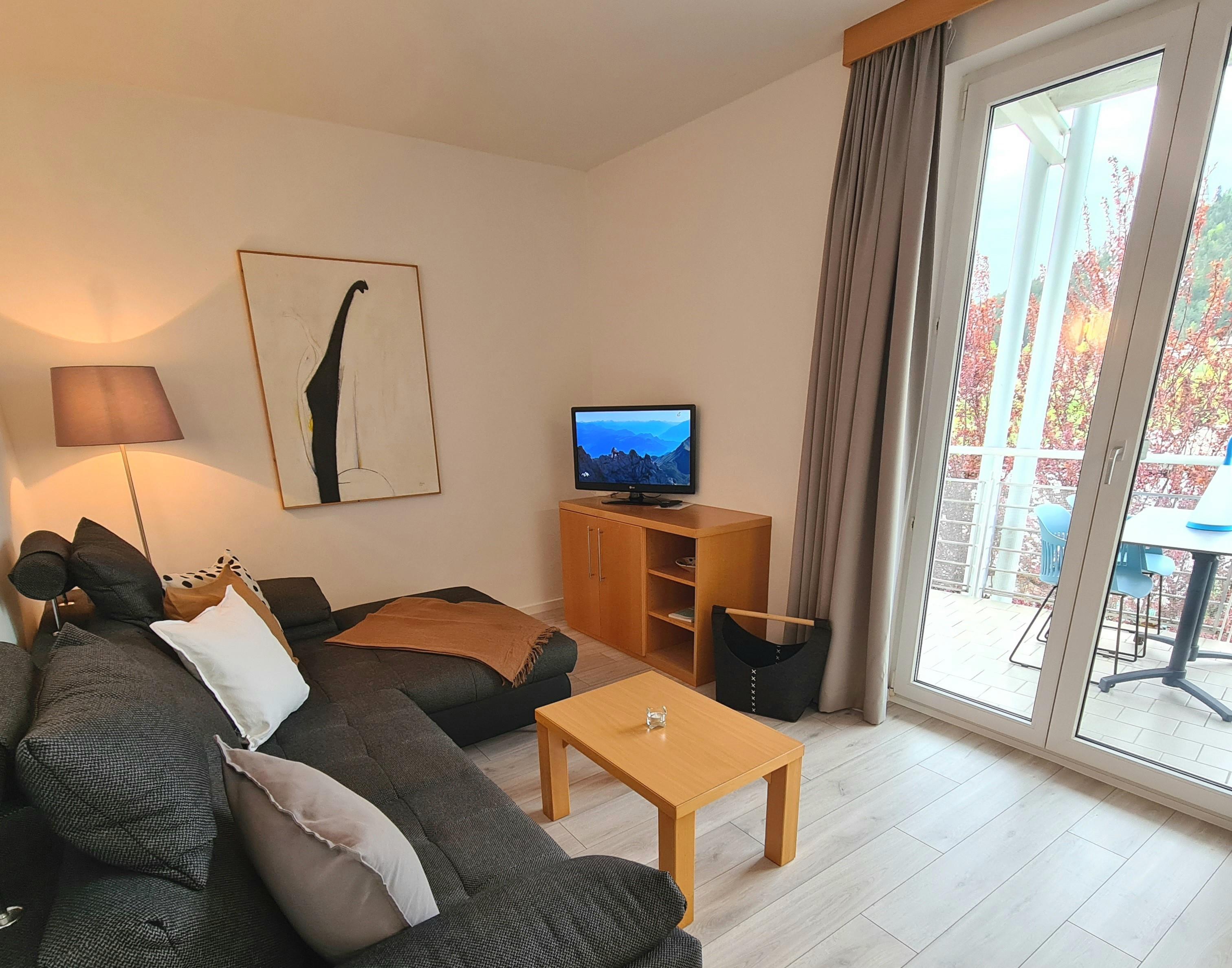 Die Wohnungen bestehen aus einem Vorraum, zwei Doppelzimmern, Dusche, sep. WC,Fön, einem Wohnzimmer mit ausziehbarer Couchgarnitur, Esstisch, LCD-TV mit Musikkanal, Internet über W-LAN, komplett ausgestatteter Küche mit Mikrowelle, Geschirrspüler, Backofen, Kaffeemaschine uvm. sowie zwei großen Balkonen mit Terrassenmöbel. Bett- u. Tischwäsche, Geschirr- u. Handtücher werden bereitgestellt. Auf Wunsch Zustellbett, Kinderbett (Gitterbett) und Hochstuhl. Waschservice gegen Gebühr im Haus.