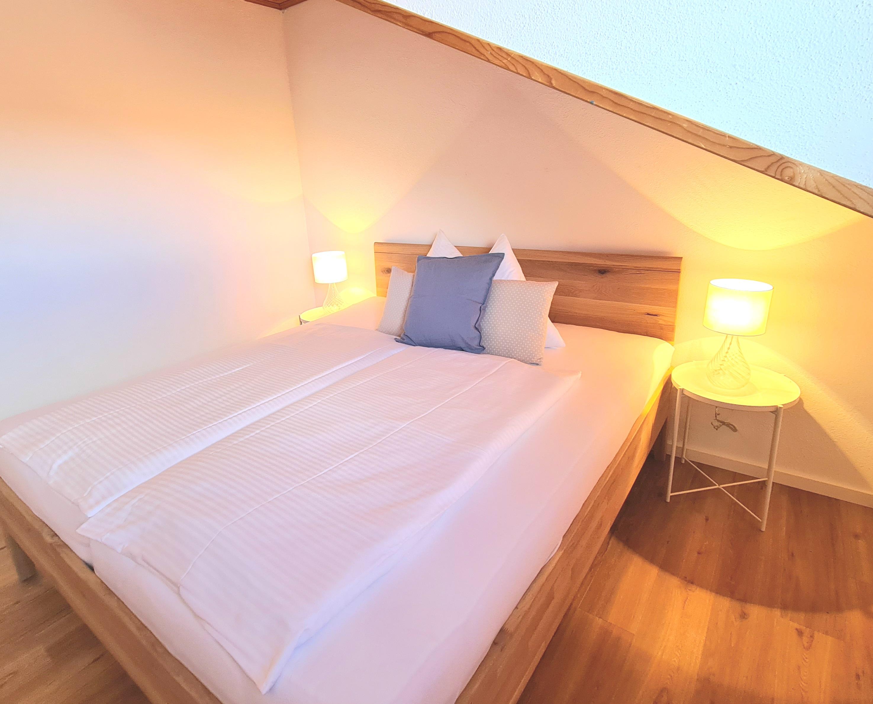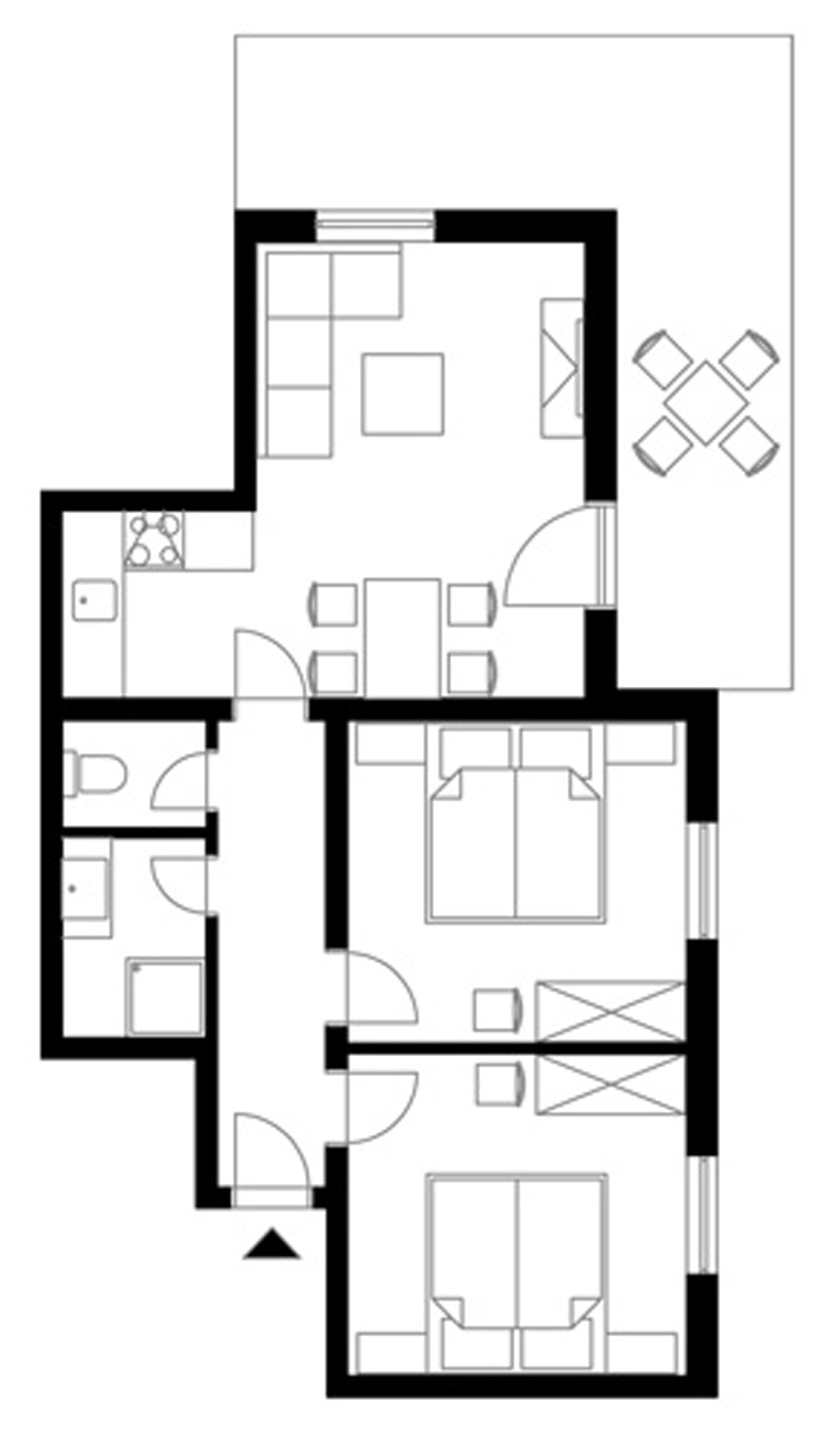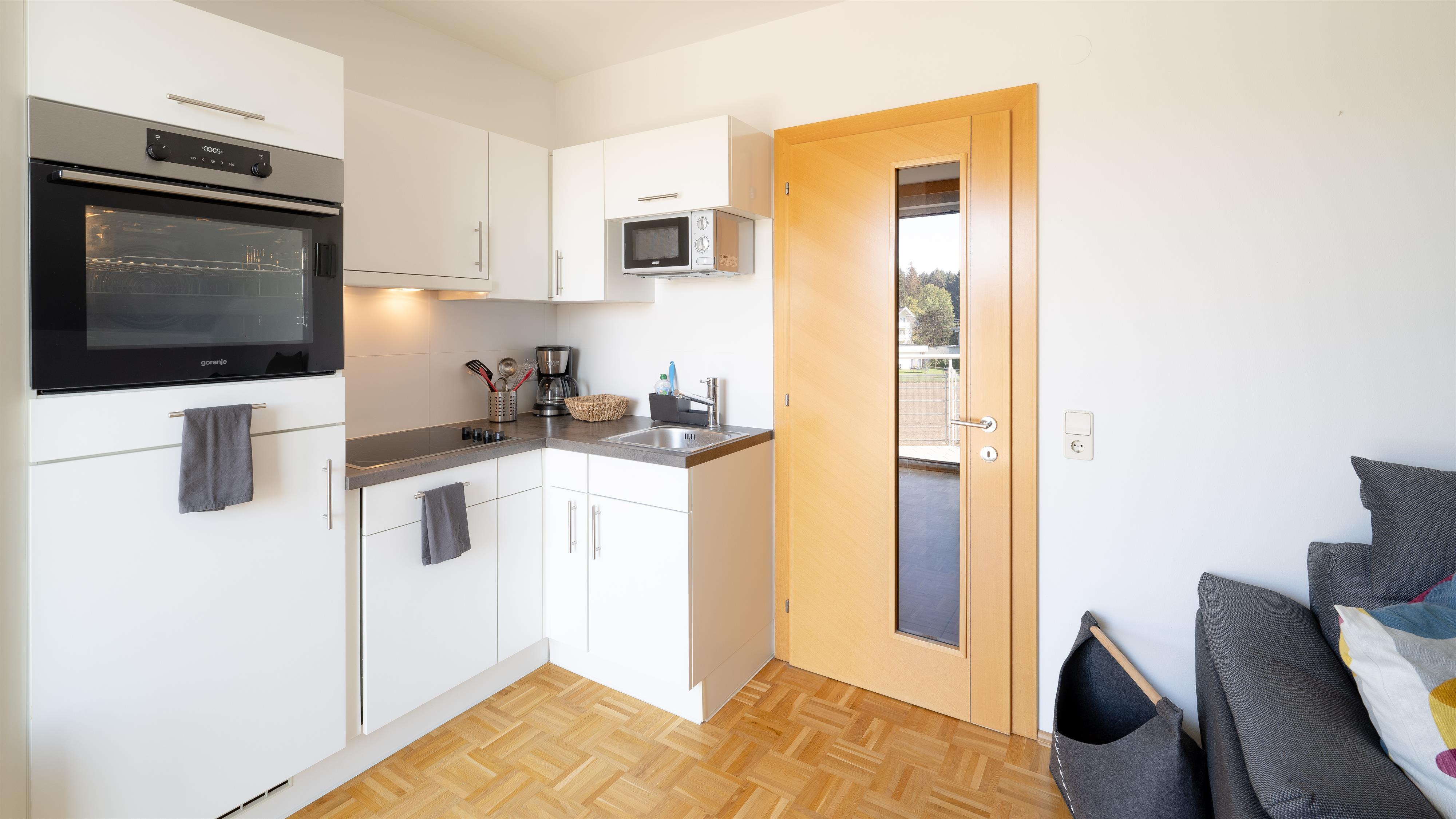 Die Wohnungen bestehen aus einem Vorraum, zwei Doppelzimmern, Dusche, sep. WC,Fön, Wohnzimmer (Schlafmöglichkeit für 1 Person), Esstisch, LCD-TV mit Musikkanal, Internet über W-LAN, komplett ausgestatteter Küche mit Mikrowelle, Geschirrspüler, Backofen, Kaffeemaschine uvm. sowie einem großen Balkon mit Terrassenmöbel. Bett- u. Tischwäsche, Geschirr- u. Handtücher werden bereitgestellt. Auf Wunsch Zustellbett (für 5. und 6. Person), Kinderbett (Gitterbett) und Hochstuhl. Waschservice gegen Gebühr im Haus.