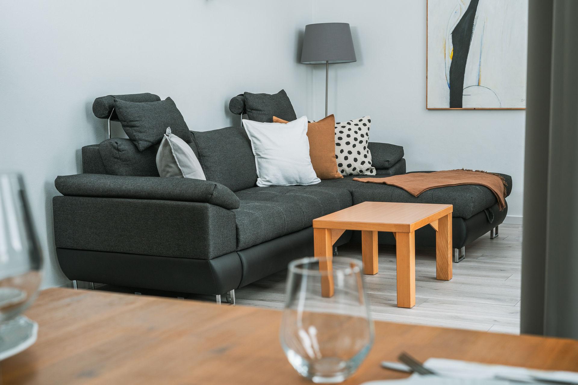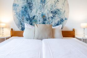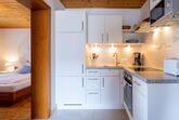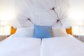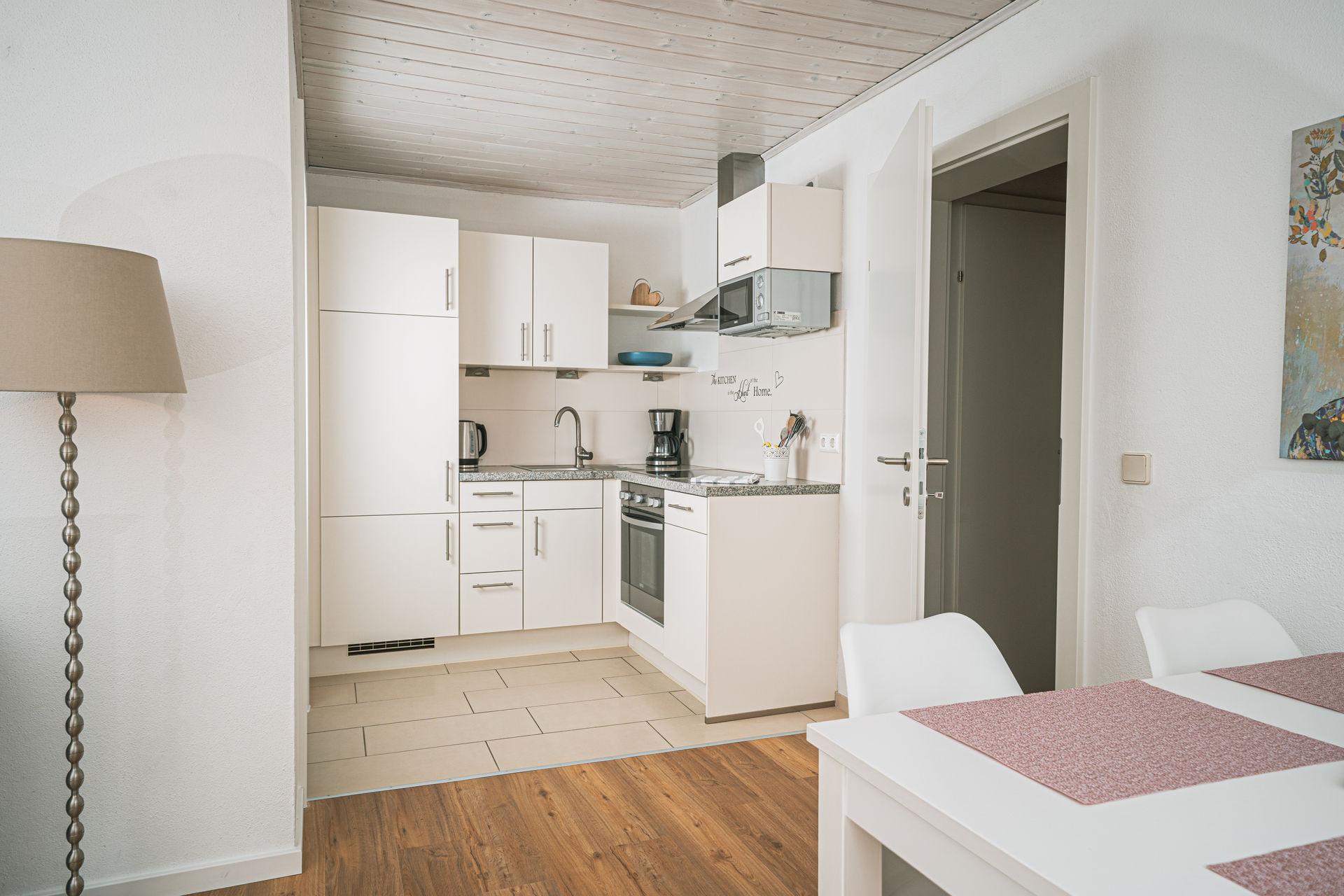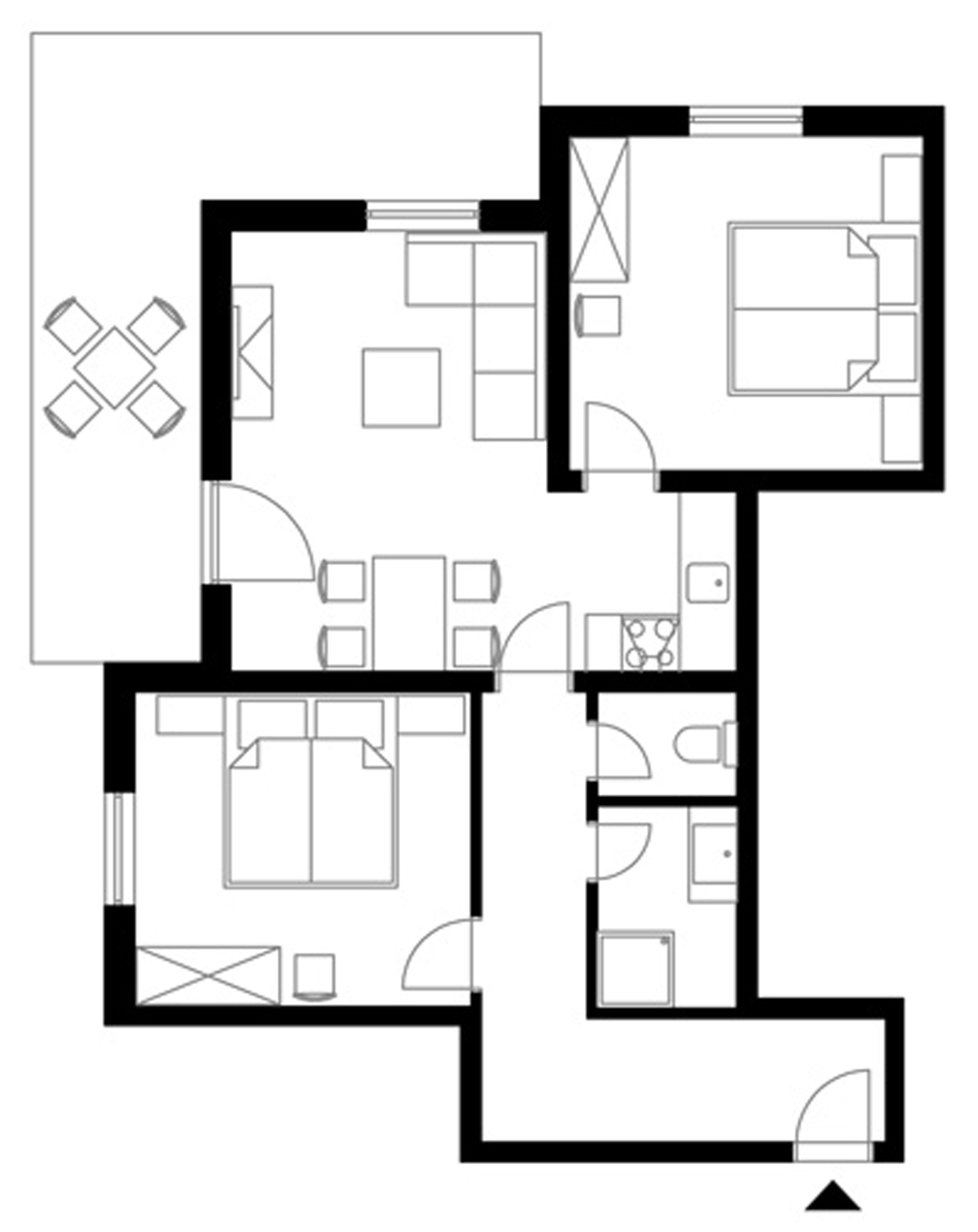 Die Wohnungen bestehen aus einem Vorraum, zwei Doppelzimmern, Dusche, sep. WC,Fön, Wohnzimmer (Schlafmöglichkeit für 1 Person), Esstisch, LCD-TV mit Musikkanal, Internet über W-LAN, komplett ausgestatteter Küche mit Mikrowelle, Geschirrspüler, Backofen, Kaffeemaschine uvm. sowie einem großen Balkon mit Terrassenmöbel. Bett- u. Tischwäsche, Geschirr- u. Handtücher werden bereitgestellt. Auf Wunsch Zustellbett (für 5. und 6. Person), Kinderbett (Gitterbett) und Hochstuhl. Waschservice gegen Gebühr im Haus.