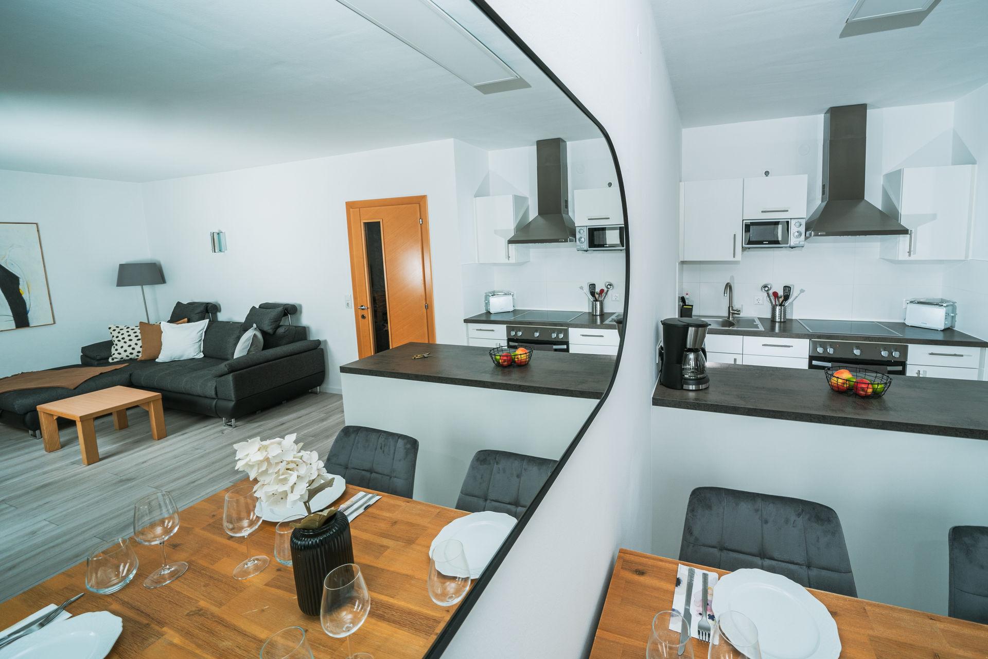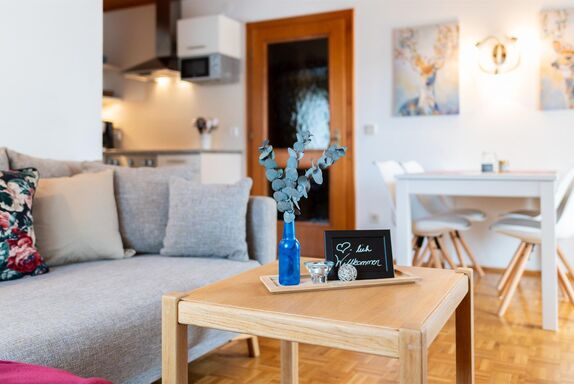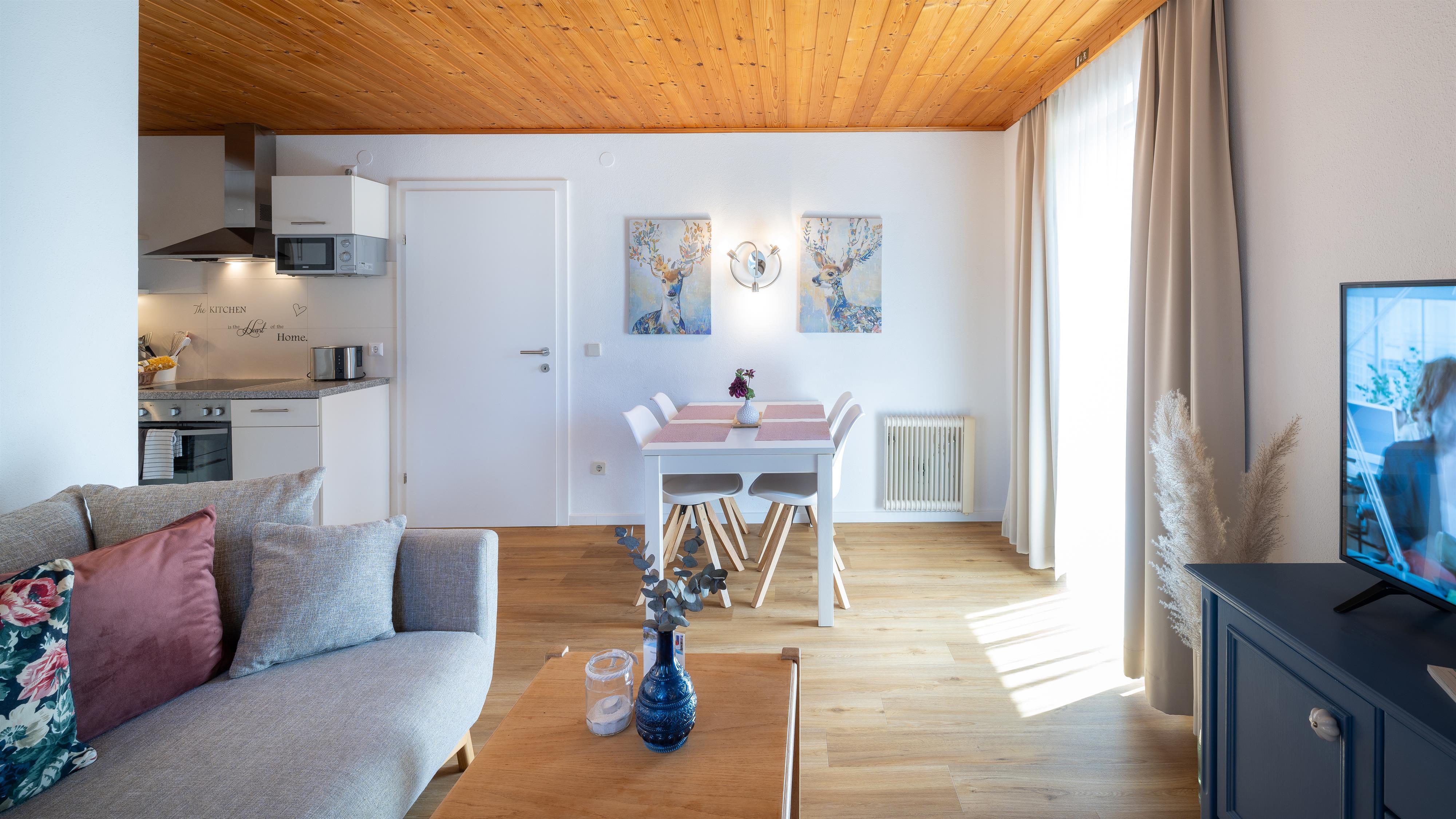 Die Wohnungen bestehen aus einem Vorraum, zwei Doppelzimmern, Dusche, sep. WC, Fön, Wohnzimmer (Schlafmöglichkeit für 1 Person), Esstisch, LCD-TV mit Musikkanal, Internet über W-LAN, komplett ausgestatteter Küche mit Mikrowelle, Geschirrspüler, Backofen, Kaffeemaschine, Sodastream uvm. sowie einer großen Terrasse mit Terrassenmöbel, 2 Sonnenliegen und einen Griller. Bett- u. Tischwäsche, Geschirr- u. Handtücher werden bereitgestellt. Auf Wunsch Zustellbett, Kinderbett (Gitterbett) und Hochstuhl. Waschservice gegen Gebühr im Haus.