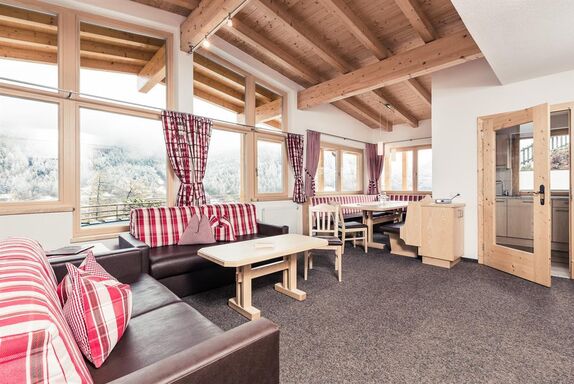 Appartement für 4-11 Personen mit ca. 116 m². Das Appartement verfügt über: 3 Dreibettzimmer, 1 Wohn-/Schlafzimmer, 2 Badezimmern (Dusche/Bad, WC), 1 separates WC, 1 separate Dusche, 1 Sitzbereich, 1 Küche. Annehmlichkeiten im Appartement sind: Terrasse (nach Süden ausgerichtet), Flat TV, Radio, Telefon, Gratis Wi-Fi, Safe, Staubsauger, Fön, Küche Grundausstattung, Handtücher (werden 1x pro Woche gewechselt), Bettwäsche.
