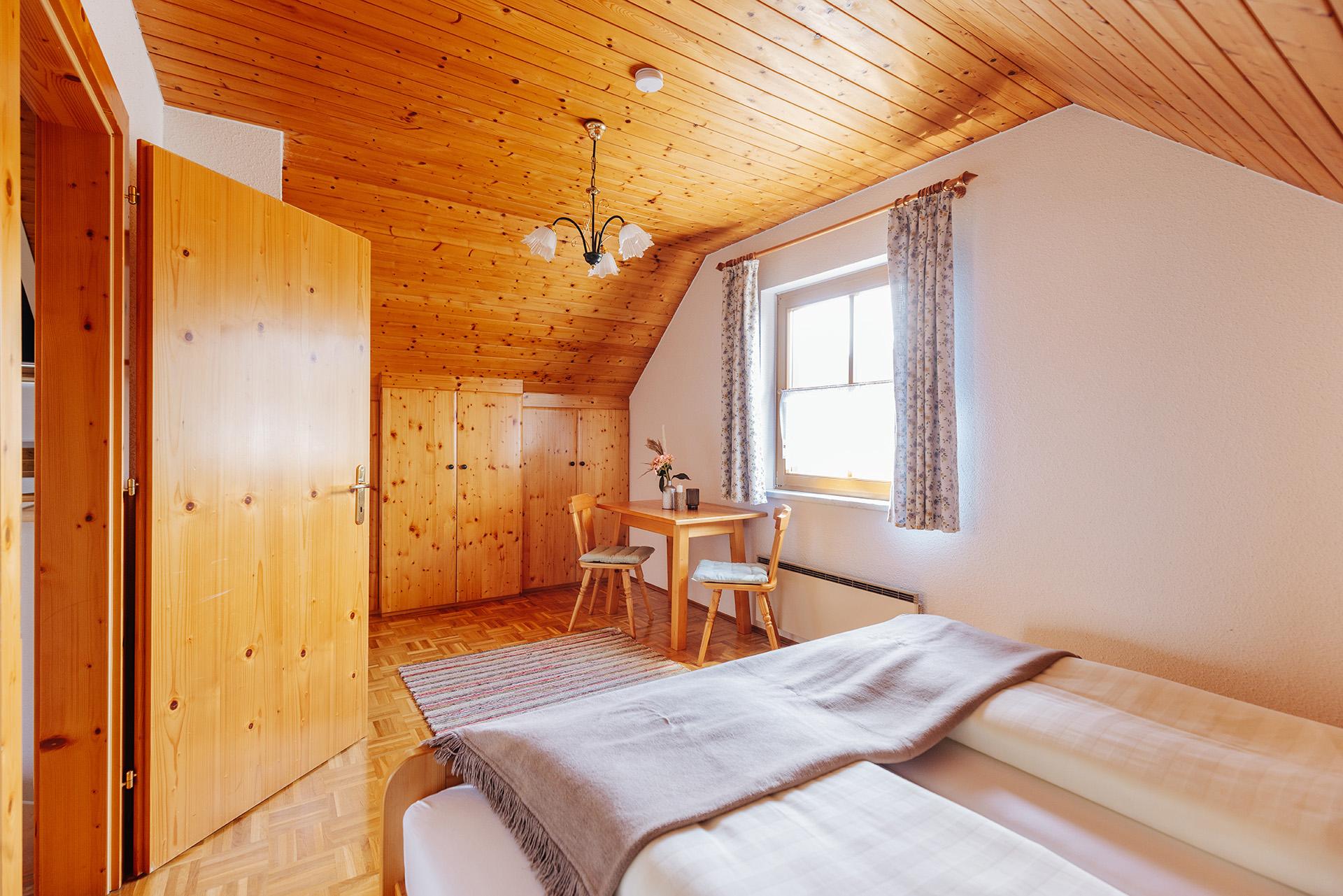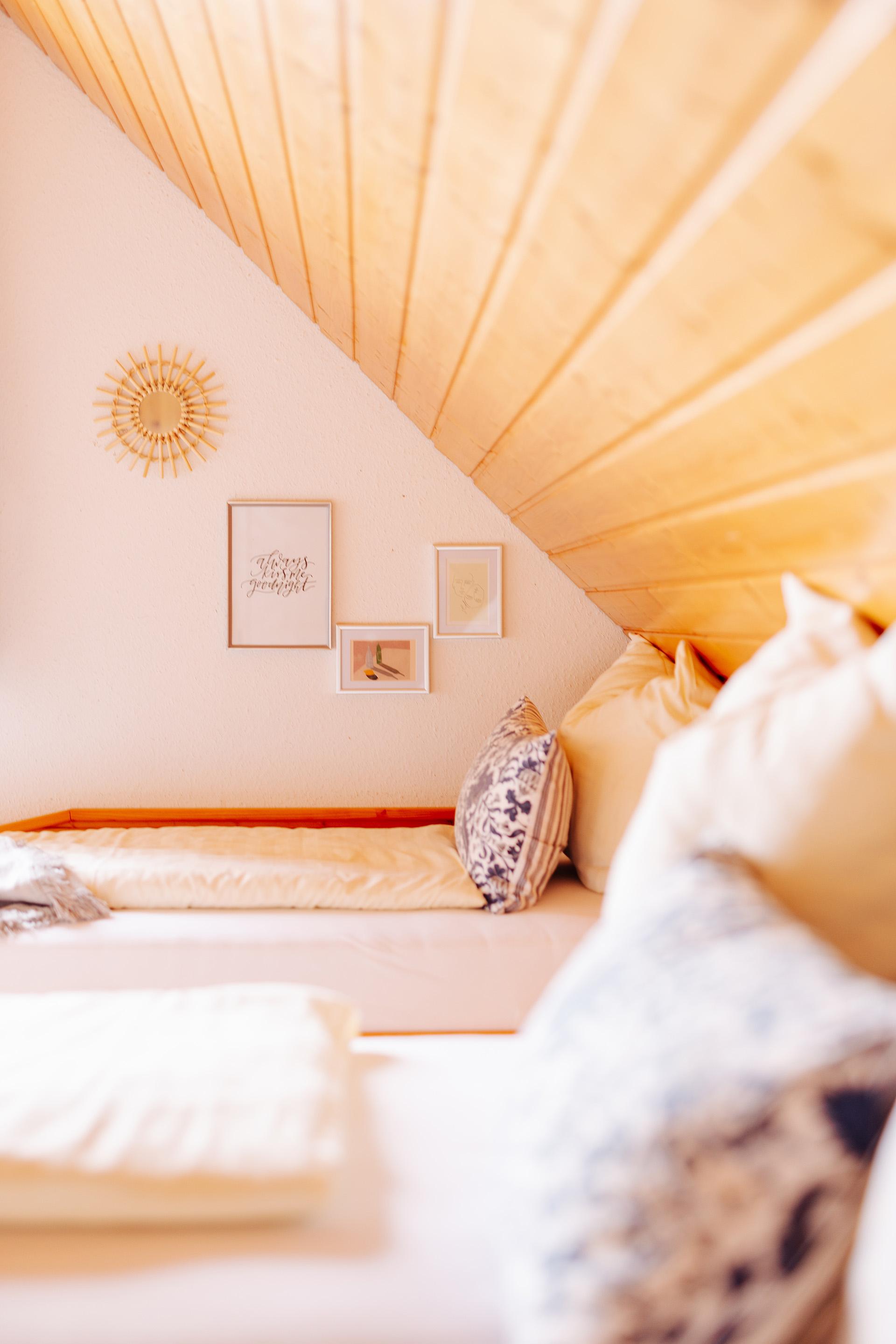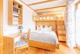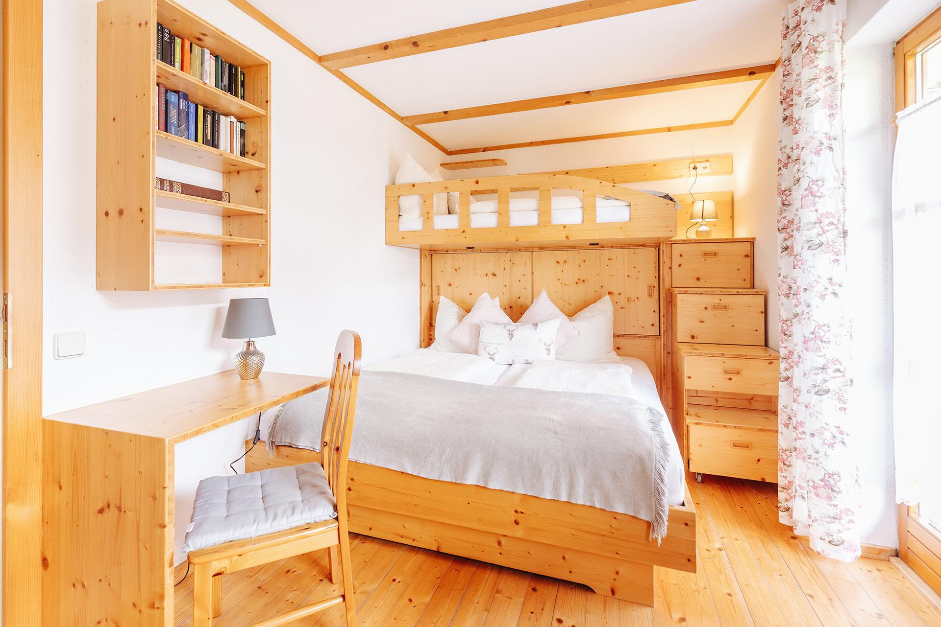 • Ein Schlafzimmer mit einem Doppelbett und einem Hochbett (140cm breite) mit Vollholzmöbel und Baumwollbettwäsche
