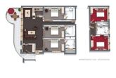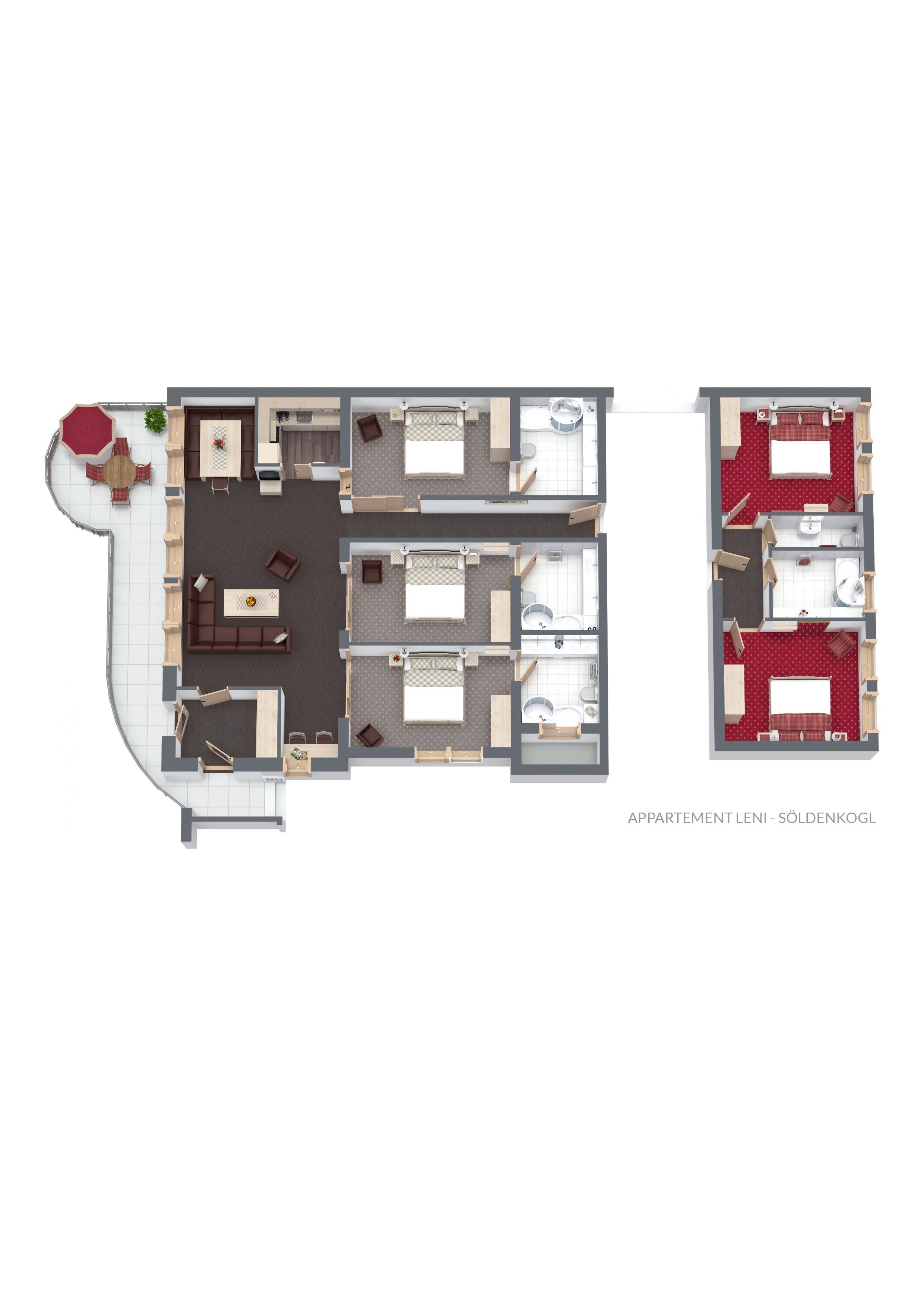 Das Appartement verfügt über: 5 Doppelzimmer, 4 Badezimmer (Bad mit integrierter Dusche, WC), 1 separates WC, 1 Wohn/Schlafzimmer mit ausziehbarer Couch, 1 Sitzbereich, 1 Küche. Annehmlichkeiten im ca. 156 m² Appartement sind: Flat TV, Radio, Telefon, Gratis Wi-Fi, Safe, Staubsauger, Fön, Küche Grundausstattung, Spültabs, Handtücher (werden 1x pro Woche gewechselt), Bettwäsche.