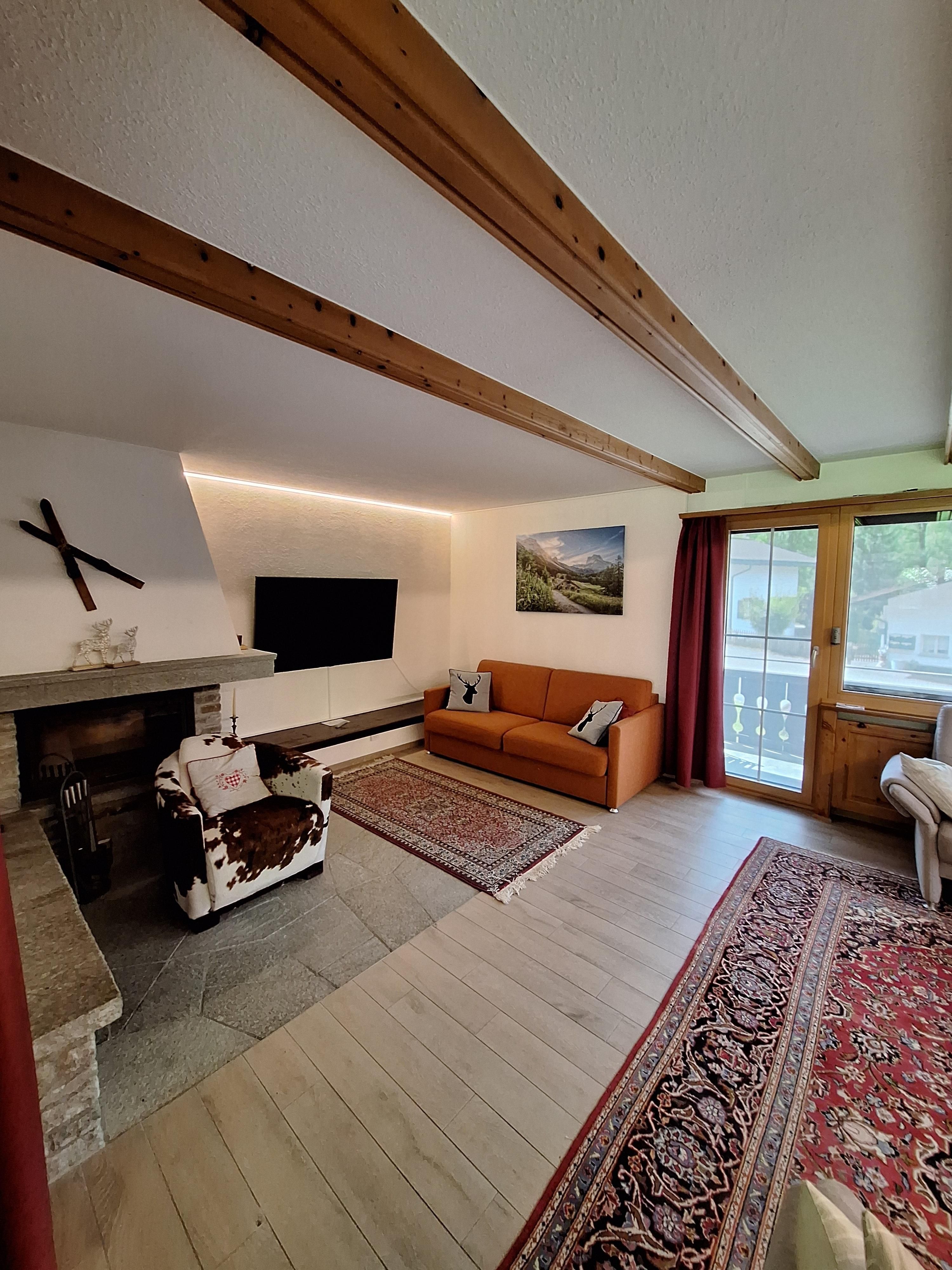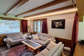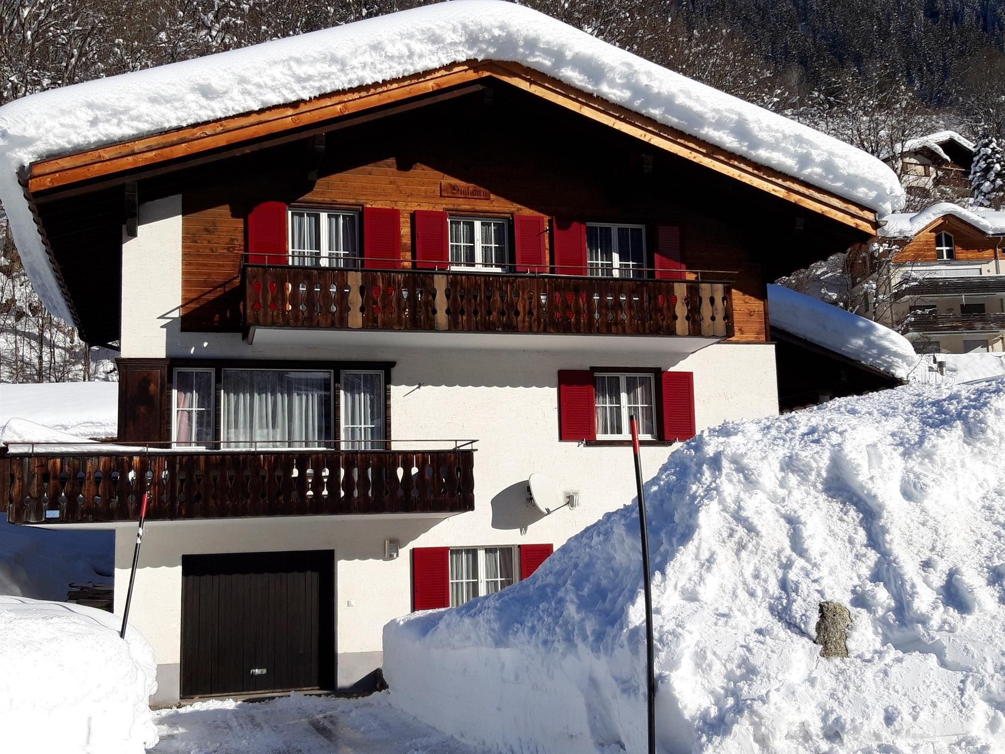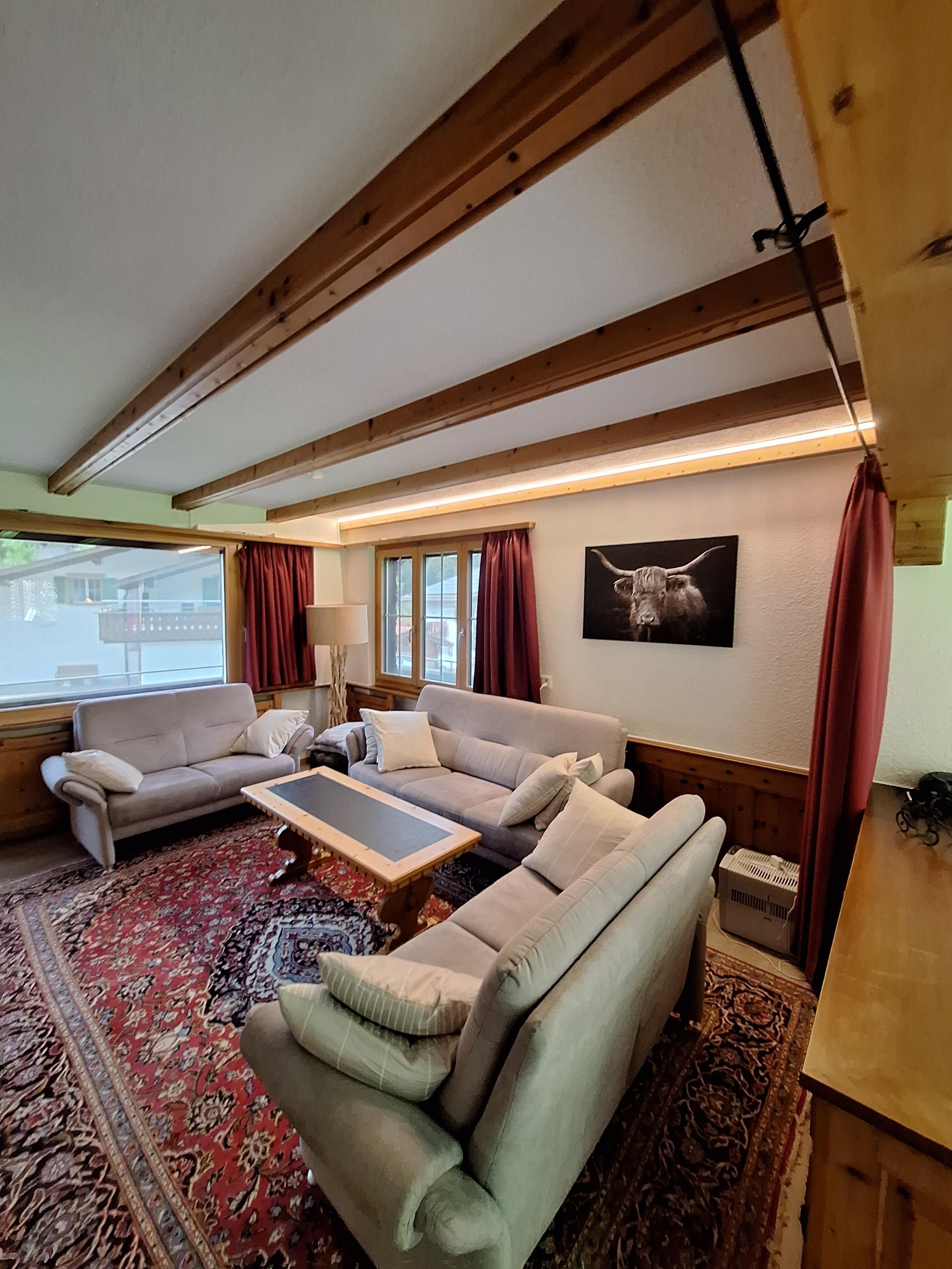 Komfortable 4 1/2 Zimmerwohnung (120m2); Garage + Autoabstellplatz 2-3 PW; gedeckter Sitzplatz mit Gartenmöbeln; beheizbare Ski und Skischuhschran k beim gedeckten Hauseingang; Wohnraum mit ausziehbar Doppelcouch, gemütlich eingerichtete Wohnlandschaft mit Cheminée, Fernseher, WLAN; gut ausgestattet Küche mit Elektro Herd, Backoffen, Mikrowelle, Kaffeemaschine Kühlschrank mit kleinem Gefrierfach, Geschirrwaschmaschine Küchenwäsche, großer Tisch- Eckbank; Racletteofen, Fonduegeschirr, Tischgrill, Eierkocher, Kaffeevollautomat, usw. ; 6-8 Betten eingeteilt in 3 Doppelschlafzimmer (Bett-Frottewäsche gegen Gebühr); Badewanne mit Duschwand, Waschmaschine, WC: separat WC; Dusche & WC im Untergeschoss; Kinderbett- Kinderstuhl (Trip-Trap) auf Anfrage; ganze Wohnung ist mit Plattenboden und Laminat Belag; Haustiere nach Absprache. Ladestation für Elektroautos (CHF 50.--/Woche)