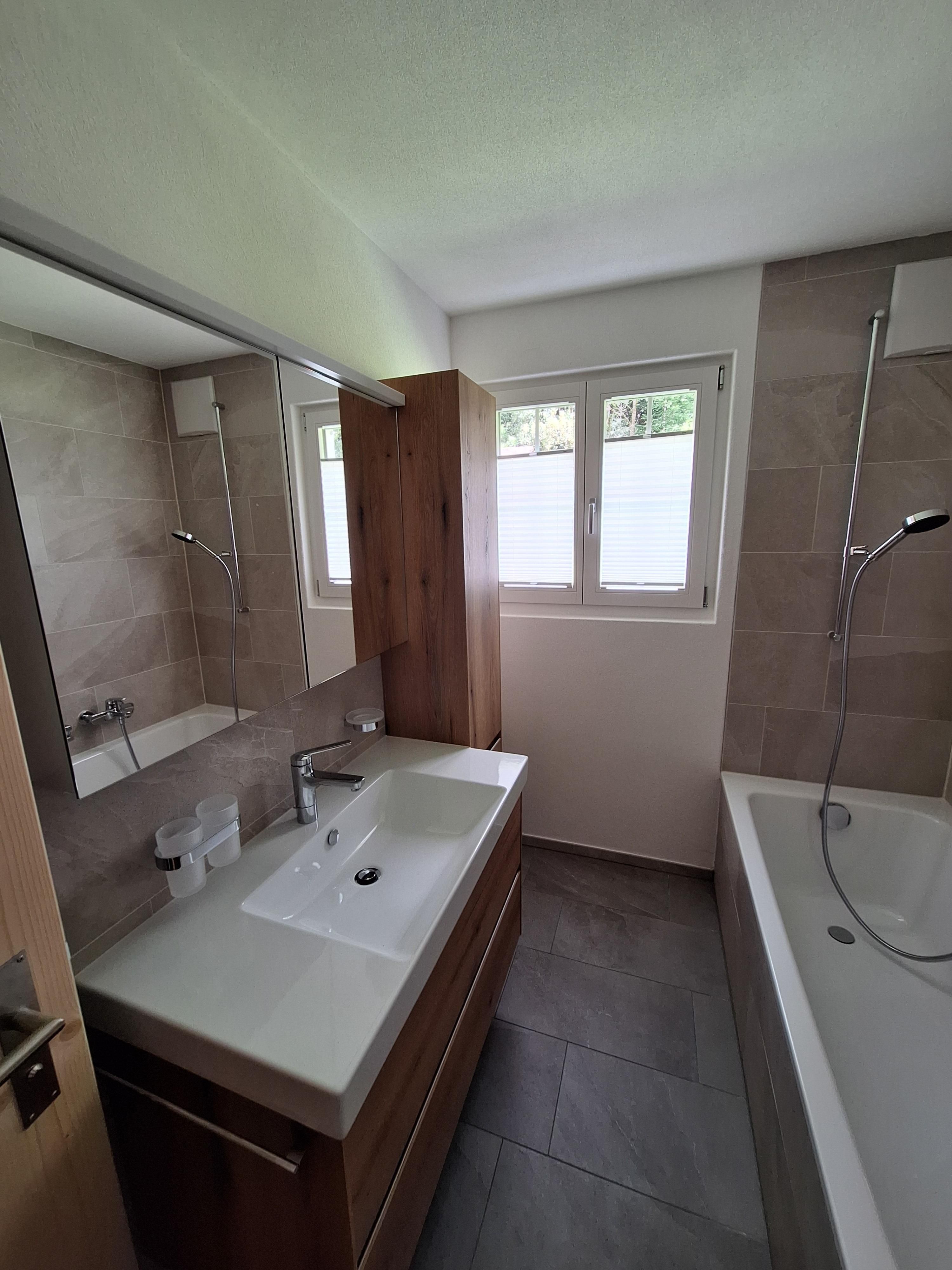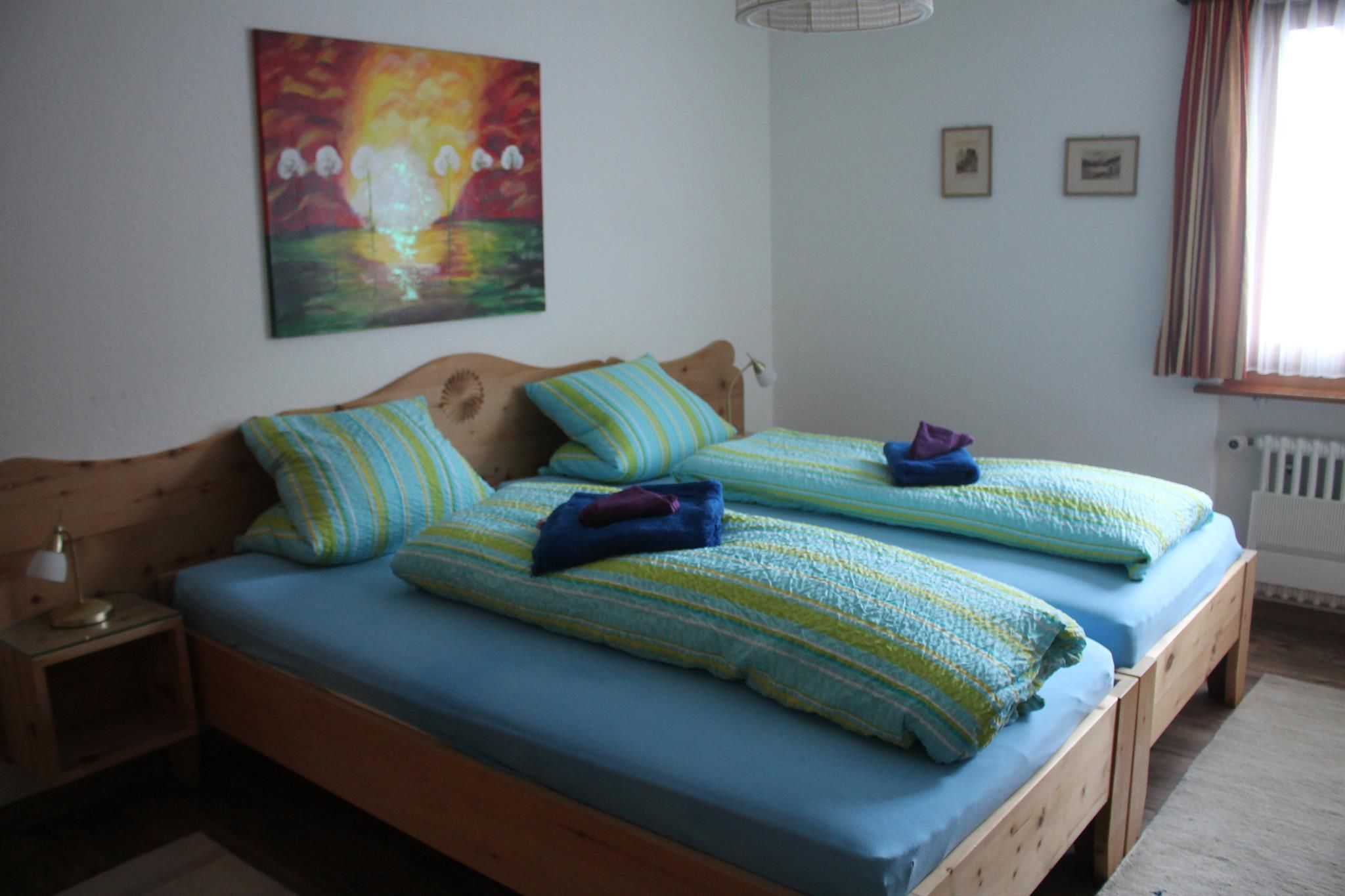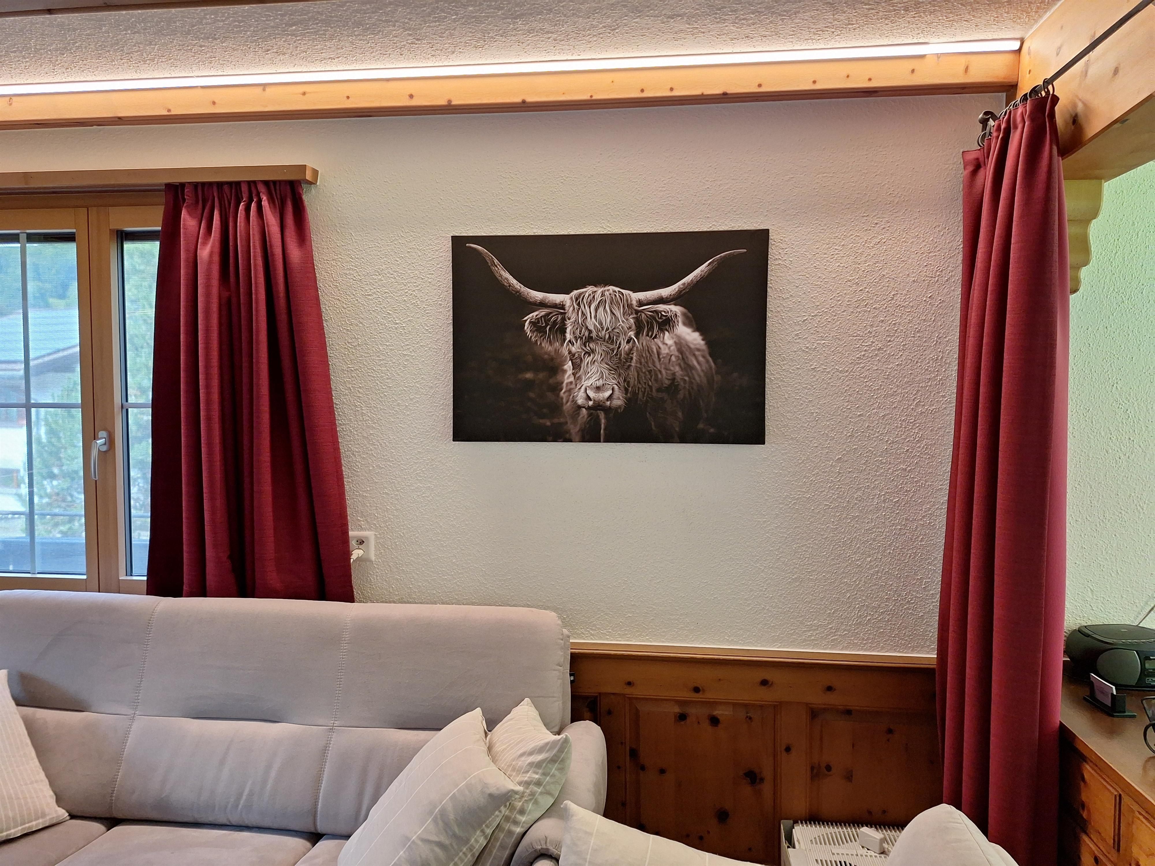 Komfortable 4 1/2 Zimmerwohnung (120m2); Garage + Autoabstellplatz 2-3 PW; gedeckter Sitzplatz mit Gartenmöbeln; beheizbare Ski und Skischuhschran k beim gedeckten Hauseingang; Wohnraum mit ausziehbar Doppelcouch, gemütlich eingerichtete Wohnlandschaft mit Cheminée, Fernseher, WLAN; gut ausgestattet Küche mit Elektro Herd, Backoffen, Mikrowelle, Kaffeemaschine Kühlschrank mit kleinem Gefrierfach, Geschirrwaschmaschine Küchenwäsche, großer Tisch- Eckbank; Racletteofen, Fonduegeschirr, Tischgrill, Eierkocher, Kaffeevollautomat, usw. ; 6-8 Betten eingeteilt in 3 Doppelschlafzimmer (Bett-Frottewäsche gegen Gebühr); Badewanne mit Duschwand, Waschmaschine, WC: separat WC; Dusche & WC im Untergeschoss; Kinderbett- Kinderstuhl (Trip-Trap) auf Anfrage; ganze Wohnung ist mit Plattenboden und Laminat Belag; Haustiere nach Absprache. Ladestation für Elektroautos (CHF 50.--/Woche)