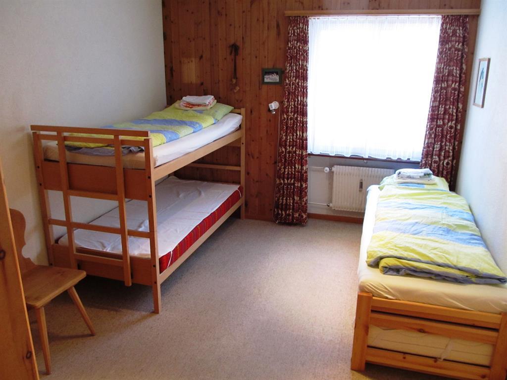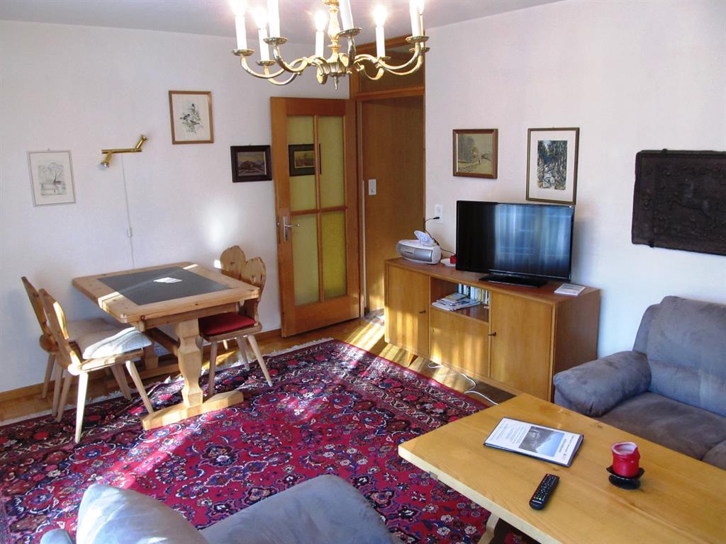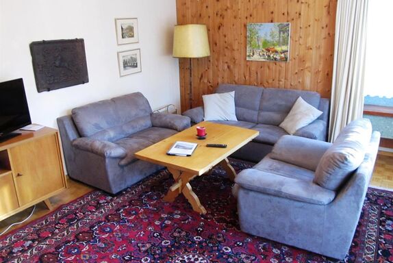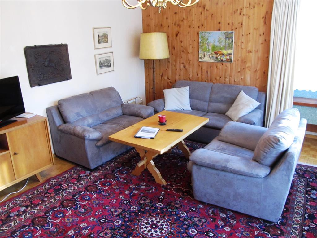 3 ½ Zimmerwohnungen (ca. 75m 2) im 1. Stock; Mehrfamilienhaus mit Lift; Balkon Südwest; Autoabstellplatz in Garage; Mitbenützung des Skiraumes, Waschmaschine; Küche mit Backofen, 4-Plattenherd, Kühlschrank mit Tiefgefrierfach, Geschirrspülmaschine; Bad, sep. WC; 1 Schlafzimmer mit 1 Doppelbett zwei Matratzen, 1 Schlafzimmer mit 1 Kajütenbett und 1 normales Bett; Wohnzimmer mit Polstergruppe, Essecke, Telefon, Internet und WLAN, Digital-TV; Bettwäsche, Frotteewäsche, Küchentücher, Duvet nordisch; Abfallsäcke blau; Haustiere nicht erlaubt; Nichtraucher-Wohnung!