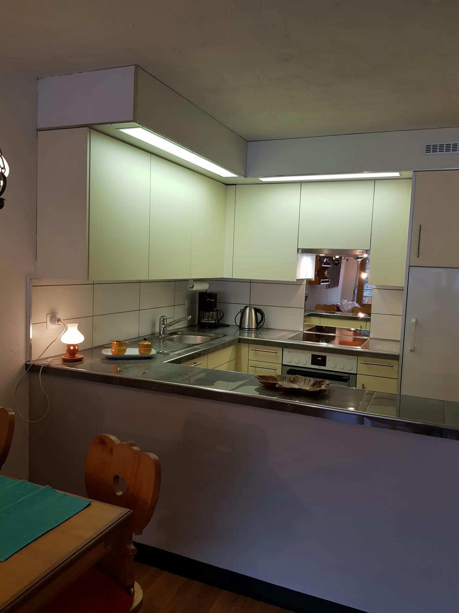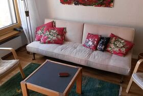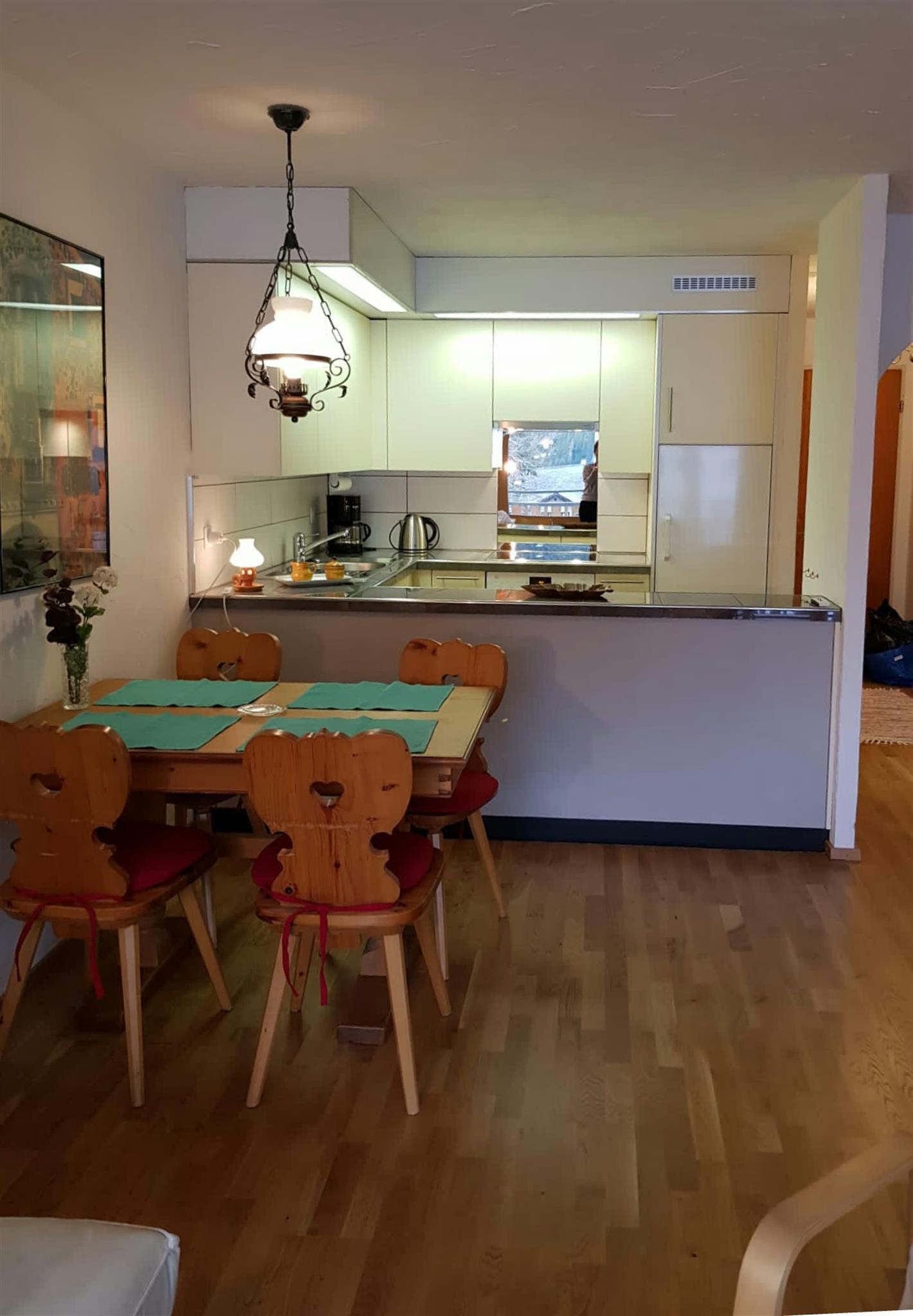 1,5-Zimmer-Wohnung (44m2) in 2. OG in einem neu renoviertem (2018) Mehrfamilienhaus an sehr ruhiger Lage; reservierter Parkplatz vor dem Haus; grosser Süd-Balkon mit schöner Aussicht; neue Fenster, Elektro-Raffstoren; neues Eichenparkett und Küche (2020) mit neuem Geschirr und Besteck, Ceranfeldherd, Geschirrspüler, Toaster, Raclette Geschirr, Fondue-Set und eine Filter Kaffeemaschine; Wohn- und Esszimmer mit einem Schrankbett für 2 Personen, Bettsofa für ein Kind; renoviertes Bad mit Dusche und Glastrennwand , separates renoviertes WC; TV HD/Digital, High speed WLAN, Radio; Nichtraucherwohnung; Haustiere auf Anfrage; Geschäfte in unmittelbarer Nähe.