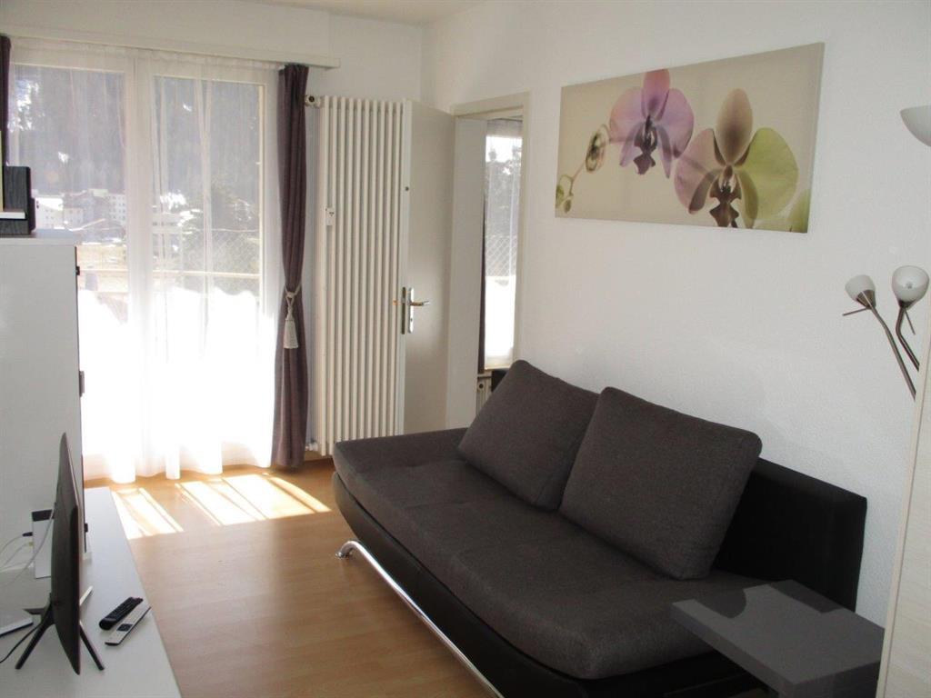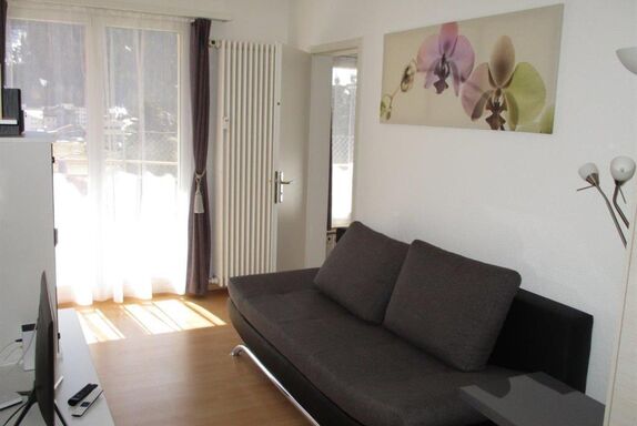 2 Zimmerwohnung (ca. 36 m2) im 4. Stock, Mehrfamilienhaus mit Lift, Balkon mit Aussicht auf die Berge, Autoabstellplatz hinter dem Haus, Mitbenützung des Skiraums, der Waschmaschine und des Trockenraumes. Küche mit Essecke, Backofen, 4-Plattenglaskeramikherd, Kühlschrank mit Tiefgefrierfach, Mikrowelle, Racletofen, Fondueset; Dusche/WC; Schlafzimmer mit 2 Einzelbetten; Wohnzimmer mit ausziehbarer Schlafcouch, Stereo, TV, WLAN; Bettwäsche, Frotteewäsche, Küchentücher, Duvet nordisch; Abfallsäcke blau. Haustiere nicht erlaubt. Nichtraucher-Wohnung!