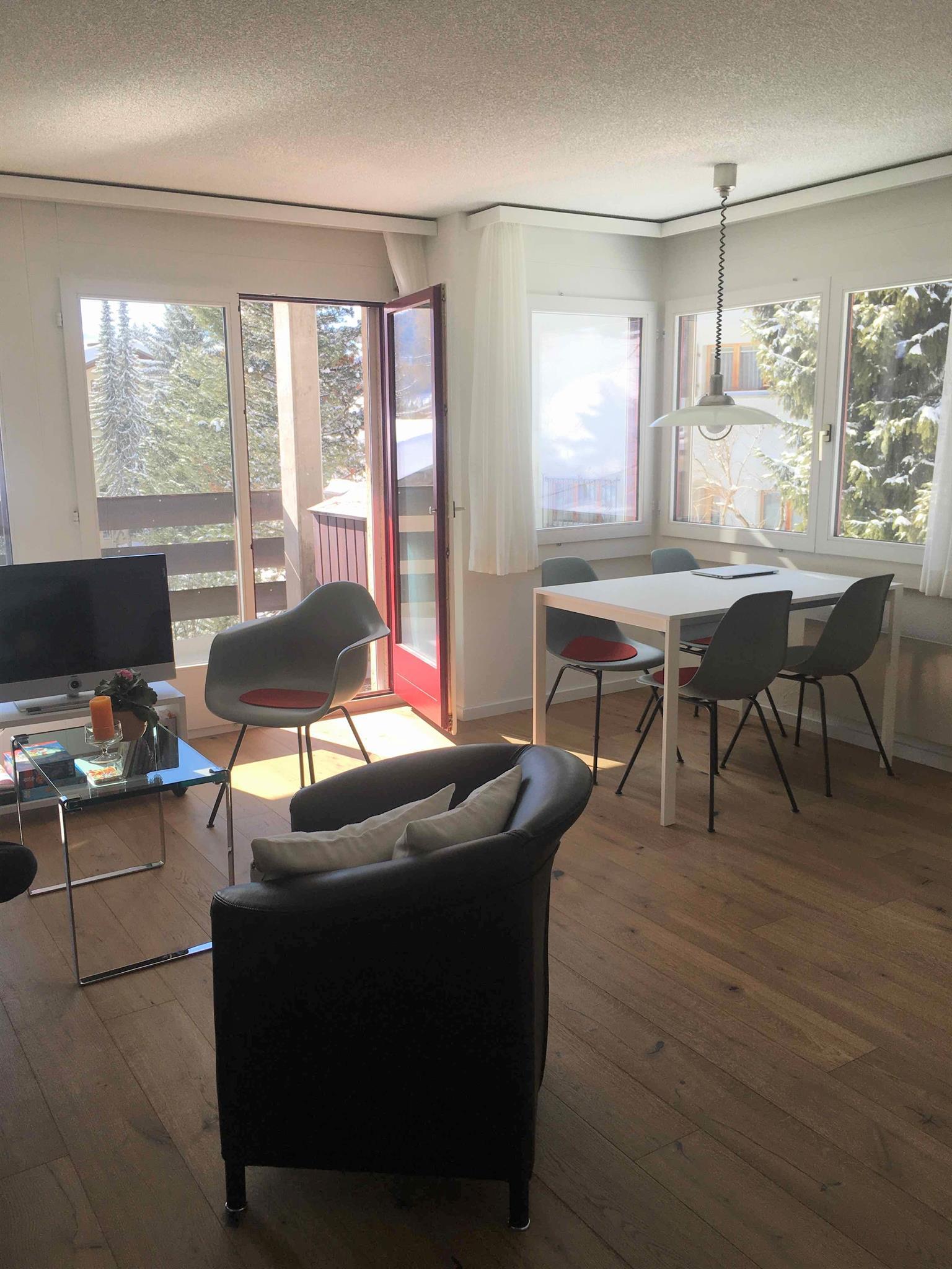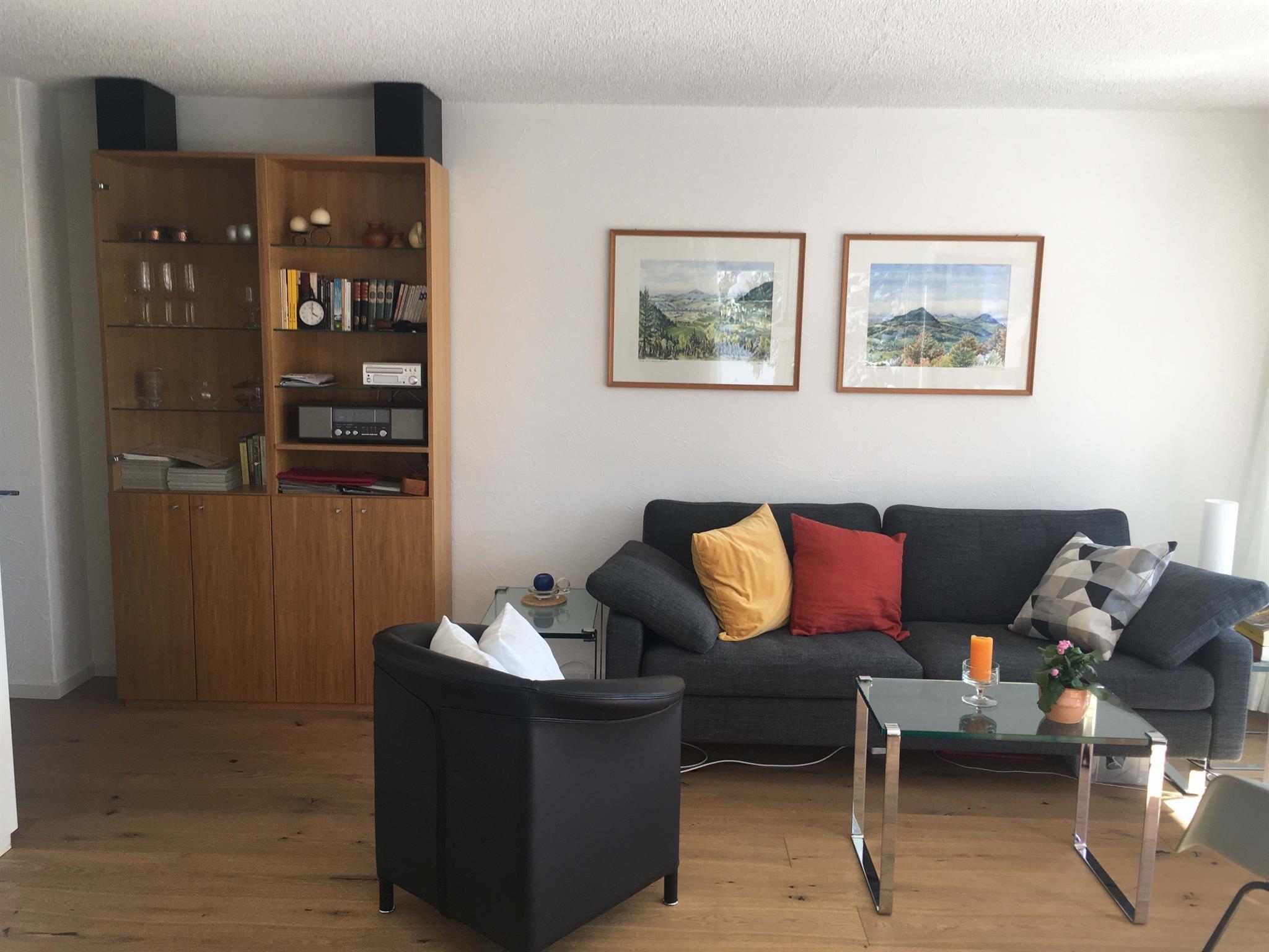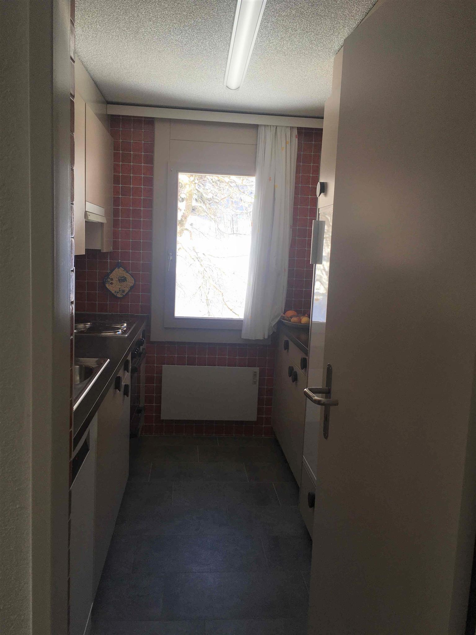 2-Zimmerwohnung (ca. 58 m2) renoviert im Sommer 2019 im 2. Stock; Mehrfamilienhaus mit Lift; Parkplatz in Einstellhalle (Höhe max. 2.05); Wohnung mit Balkon; zur Mitbenützung: Skiraum; separate Küche mit Backofen, Kühlschrank, Geschirrspühlmaschine und Kaffeemaschine; Wohn-Esszimmer; 1 Schlafzimmer mit Doppelbett; Bad und separates WC; Bettwäsche, Küchentücher, Frotteewäsche, Wolldecken, Duvet Nordisch, Radio, Fernseher, WLAN, 1 Abfallsack (blau), WC-Papier; ganze Wohnung mit Parkettboden; Haustiere sind nicht erlaubt. Die Wohnung wird nur an Nichtraucher vermietet!