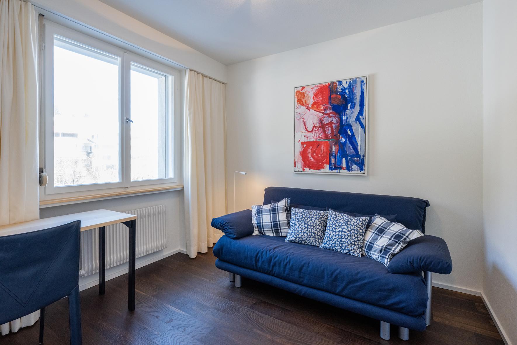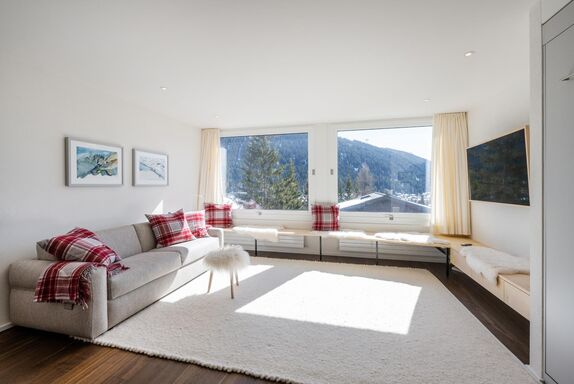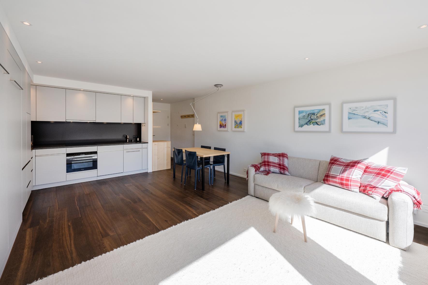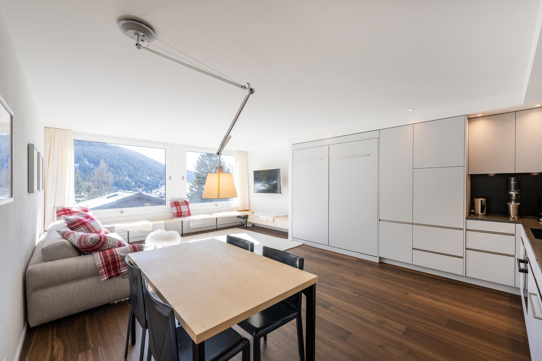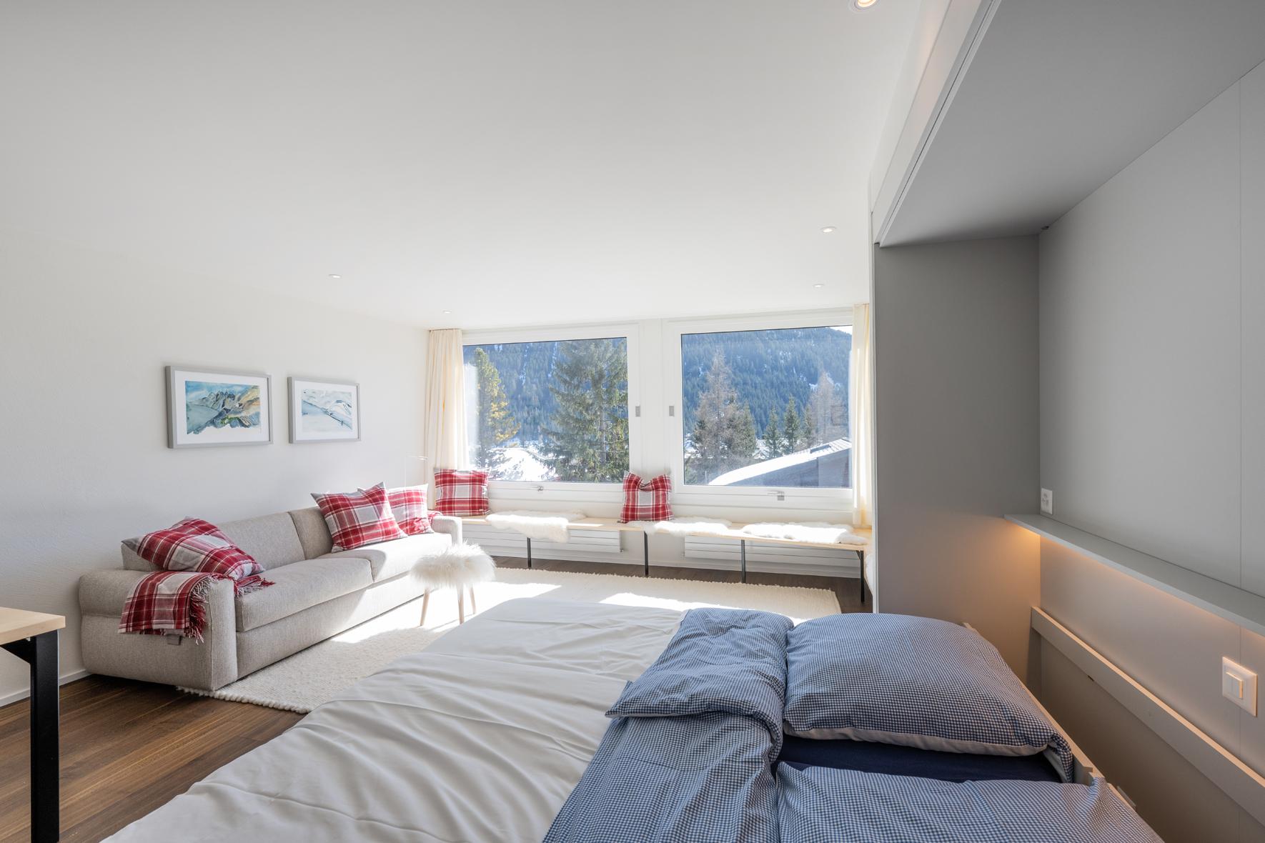Sehr schöne, helle, in 2021 renovierte 1½- Zimmerwohnung Nr. 8, Etage 1, ideal für 2 bis 3 Personen, ca. 40 m2, Panoramasicht auf Davoser Berge. Wohnraum mit ausklappbaren Betten als zwei Einzelbetten (2 x 90 200) oder als Doppelbett (180 x 200) nutzbar, TV, WLAN. Zusätzlich lässt sich ein bequemes Sofa als Schlafsofa (160x200) nutzen. ein zweites Zimmer liegt außerhalb der eigentlichen Wohnung, gegenüber der Wohnungstür, nutzbar als Arbeits-, Kinder-, Rückzugs- oder zweites Schlafzimmer mit Schlafsofa (140 x 200). Somit gibt es Schlafmöglichkeiten, Bettwäsche, Frotteewäsche, Duvets nordisch für insgesamt 6 Personen. Ebenfalls neu sind komplett ausgestattete offene Küche mit 4-Platten Glaskeramikherd, Kühlschrank, Backofen mit Mikrowelle, Geschirrspüler, Kapselkaffeemaschine, Küchentüchern, sowie ein modernes Duschbad/WC. Mitbenützung der Waschküche, Skiraum, Aufzug/Lift. Parkplatzmiete möglich auf Anfrage. Nichtraucher Wohnung. Haustiere sind nicht gestattet.