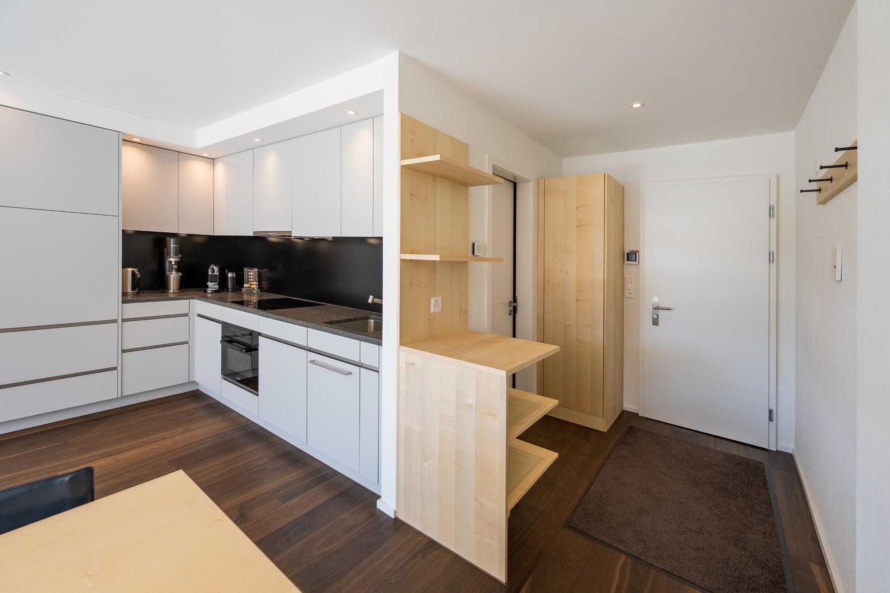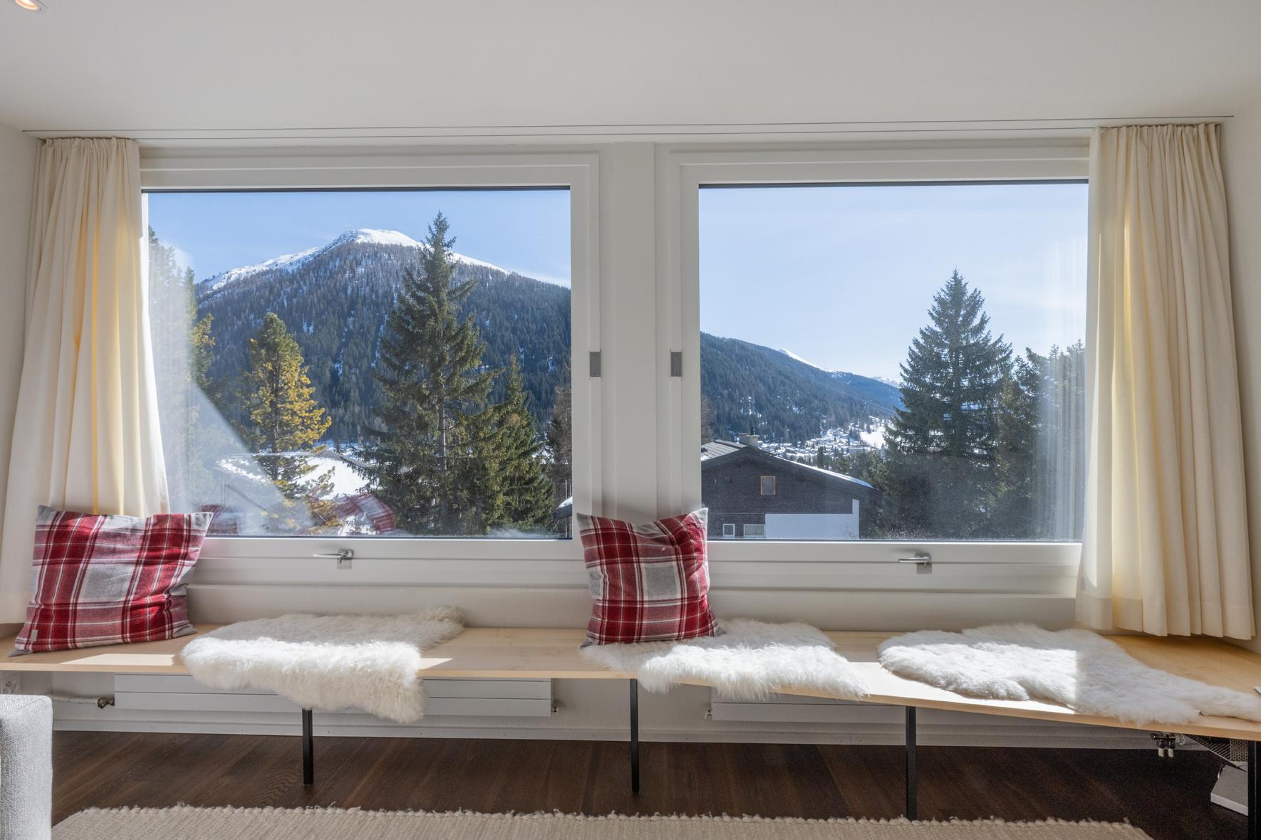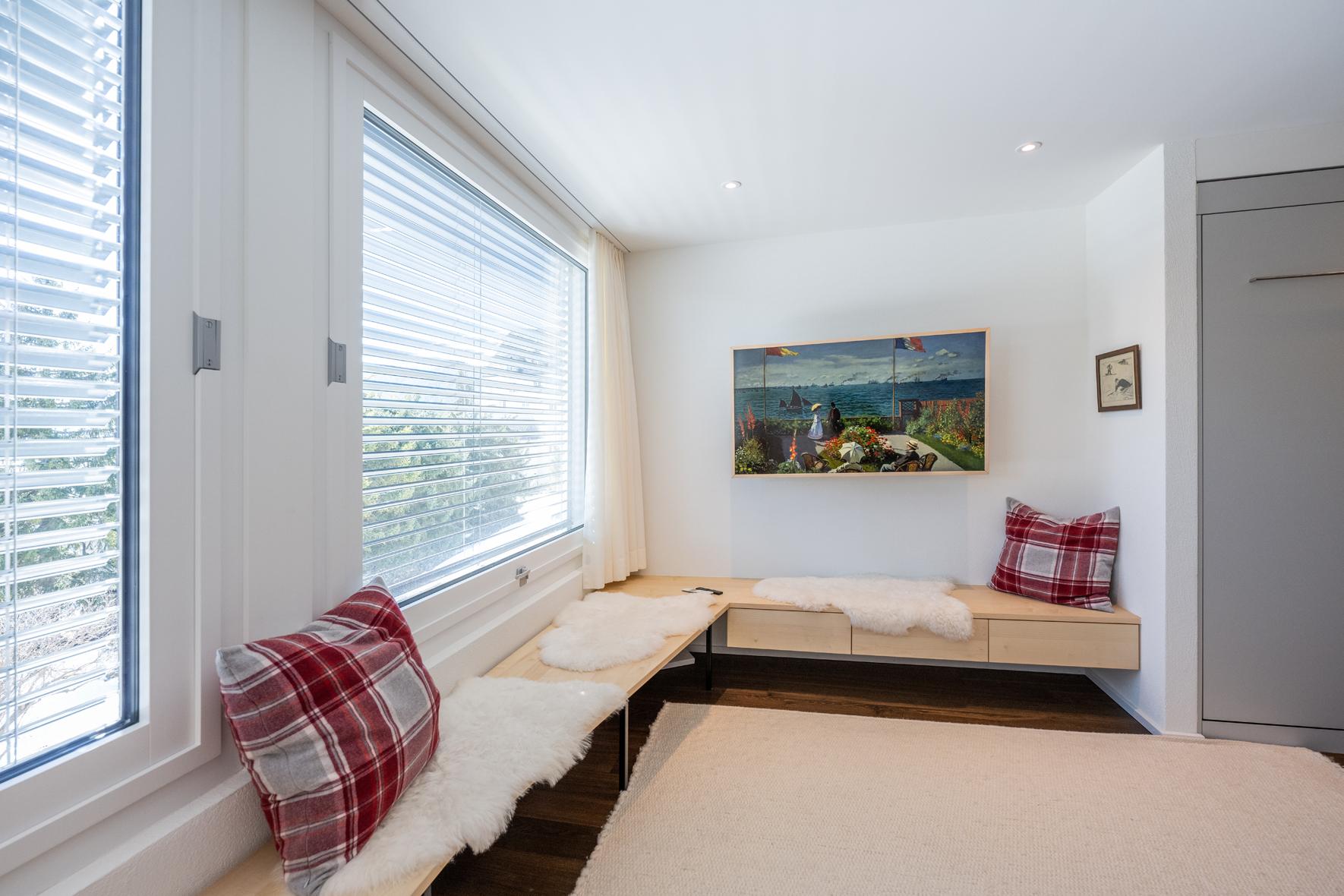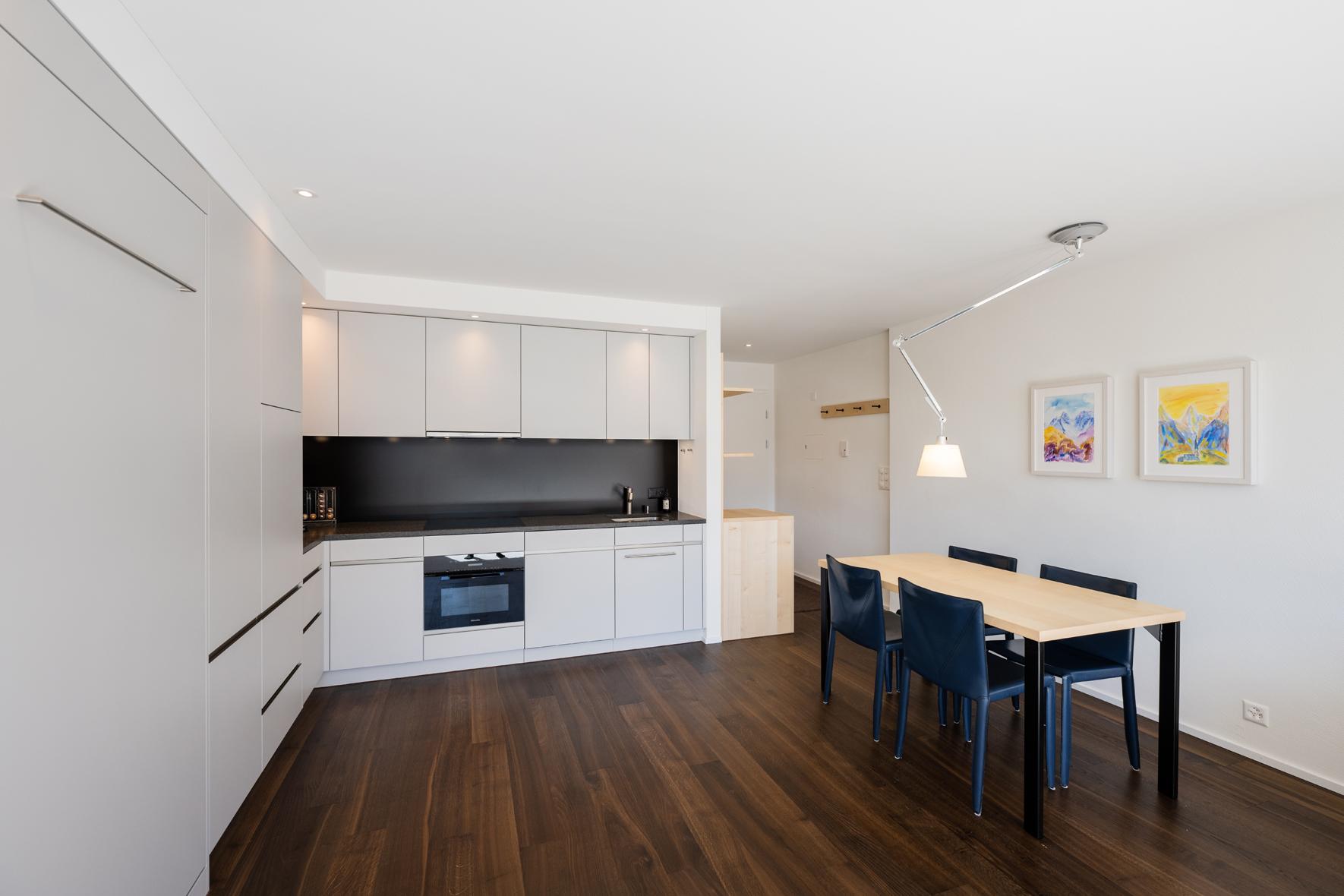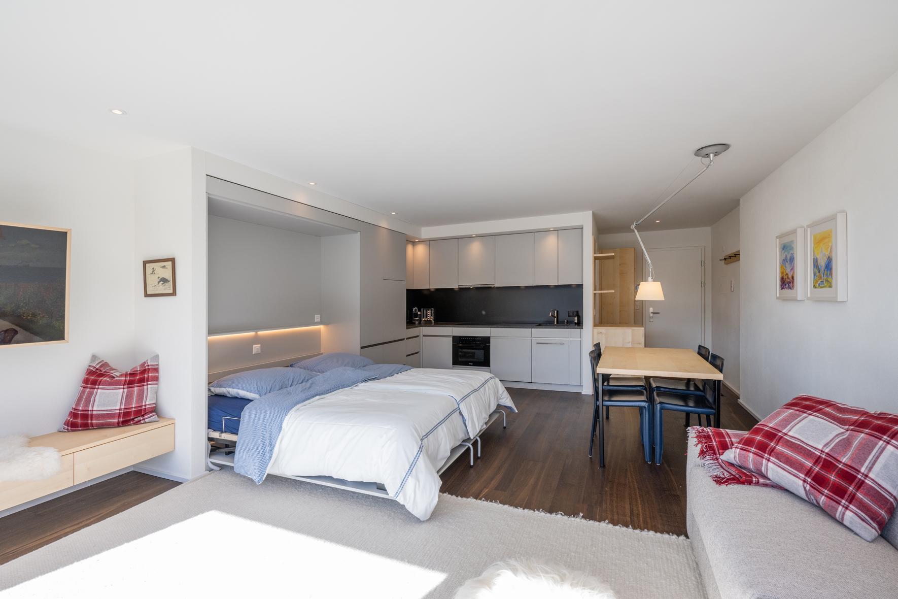 Sehr schöne, helle, in 2021 renovierte 1½- Zimmerwohnung Nr. 8, Etage 1, ideal für 2 bis 3 Personen, ca. 40 m2, Panoramasicht auf Davoser Berge. Wohnraum mit ausklappbaren Betten als zwei Einzelbetten (2 x 90 200) oder als Doppelbett (180 x 200) nutzbar, TV, WLAN. Zusätzlich lässt sich ein bequemes Sofa als Schlafsofa (160x200) nutzen. ein zweites Zimmer liegt außerhalb der eigentlichen Wohnung, gegenüber der Wohnungstür, nutzbar als Arbeits-, Kinder-, Rückzugs- oder zweites Schlafzimmer mit Schlafsofa (140 x 200). Somit gibt es Schlafmöglichkeiten, Bettwäsche, Frotteewäsche, Duvets nordisch für insgesamt 6 Personen. Ebenfalls neu sind komplett ausgestattete offene Küche mit 4-Platten Glaskeramikherd, Kühlschrank, Backofen mit Mikrowelle, Geschirrspüler, Kapselkaffeemaschine, Küchentüchern, sowie ein modernes Duschbad/WC. Mitbenützung der Waschküche, Skiraum, Aufzug/Lift. Parkplatzmiete möglich auf Anfrage. Nichtraucher Wohnung. Haustiere sind nicht gestattet.