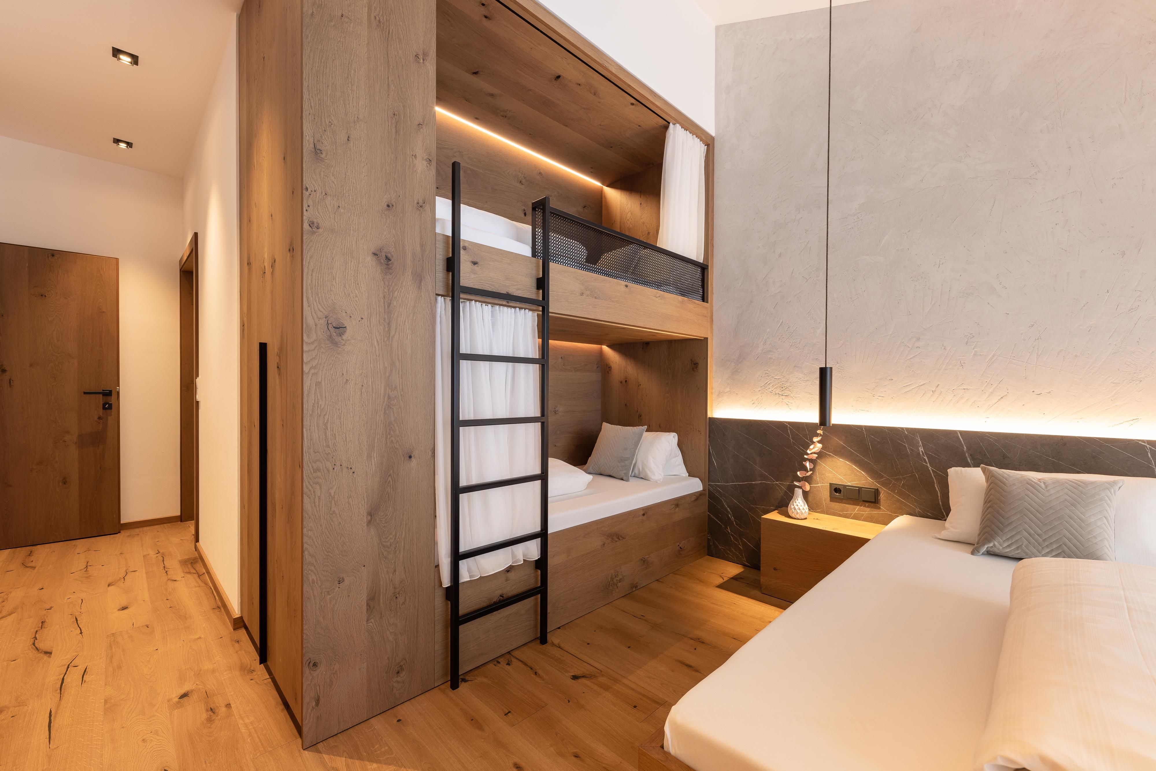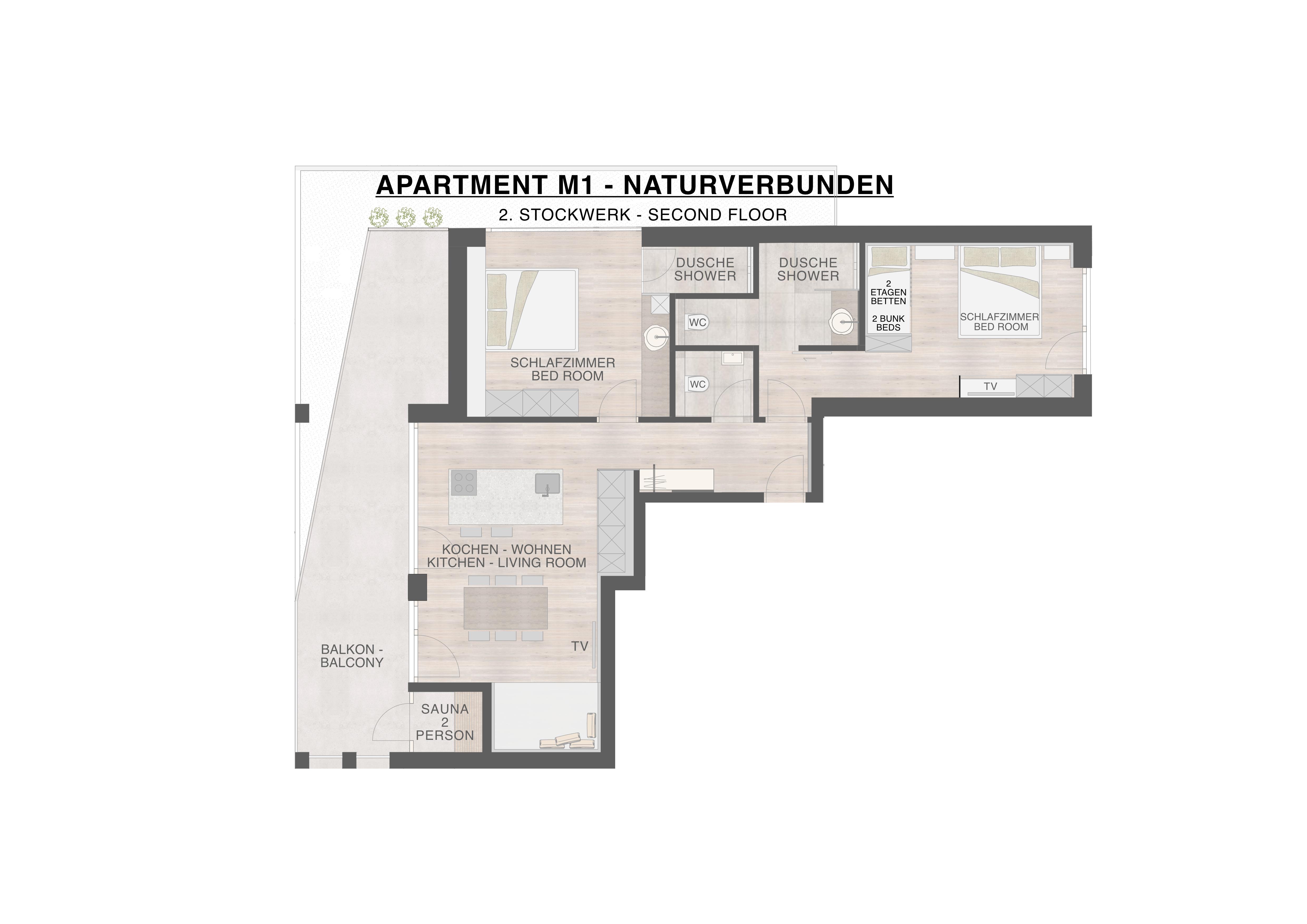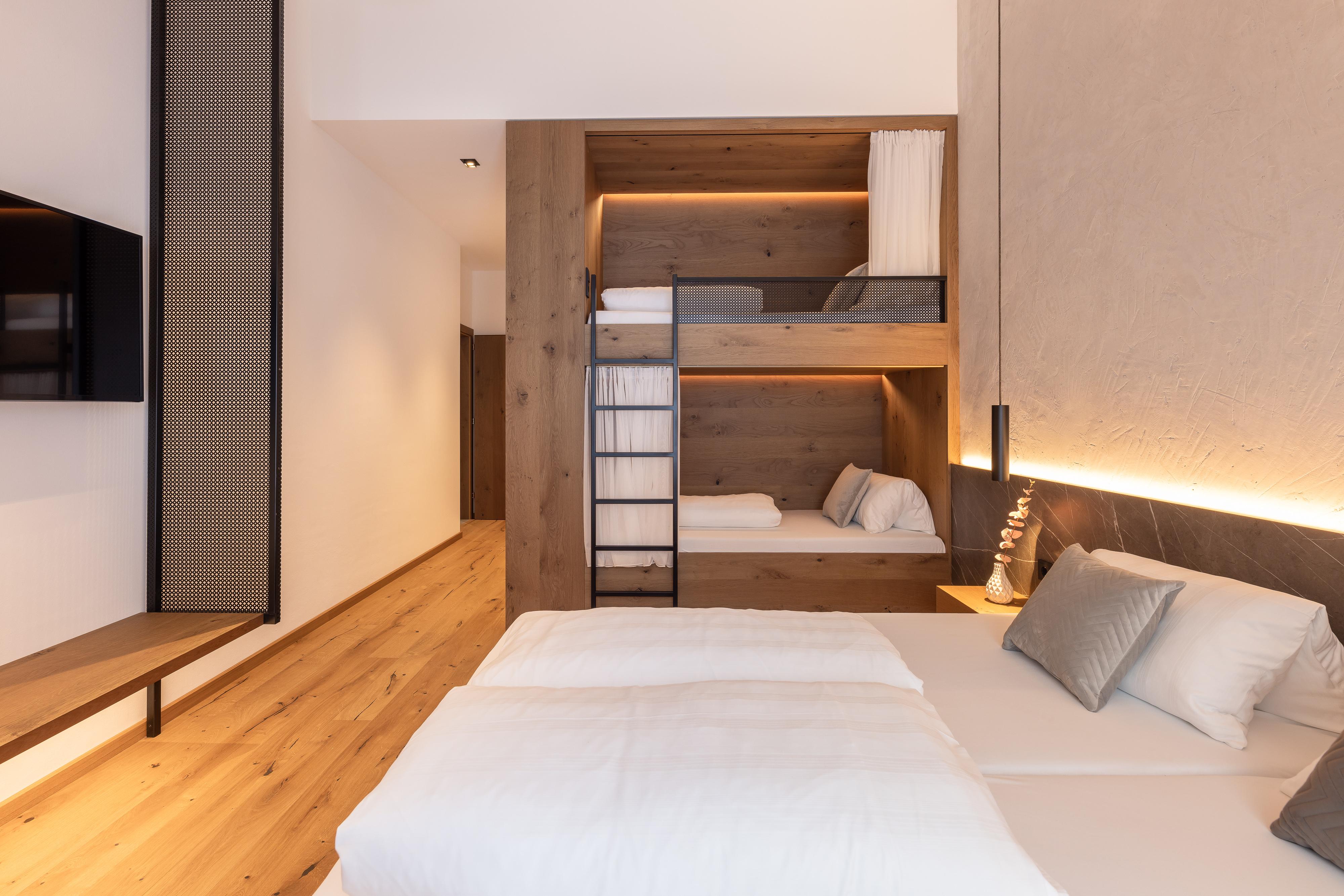 • Zwei Schlafzimmer, eines davon mit eigener Dusche und Waschtisch, das andere mit Badezimmer, WC, Doppel- und Stockbett