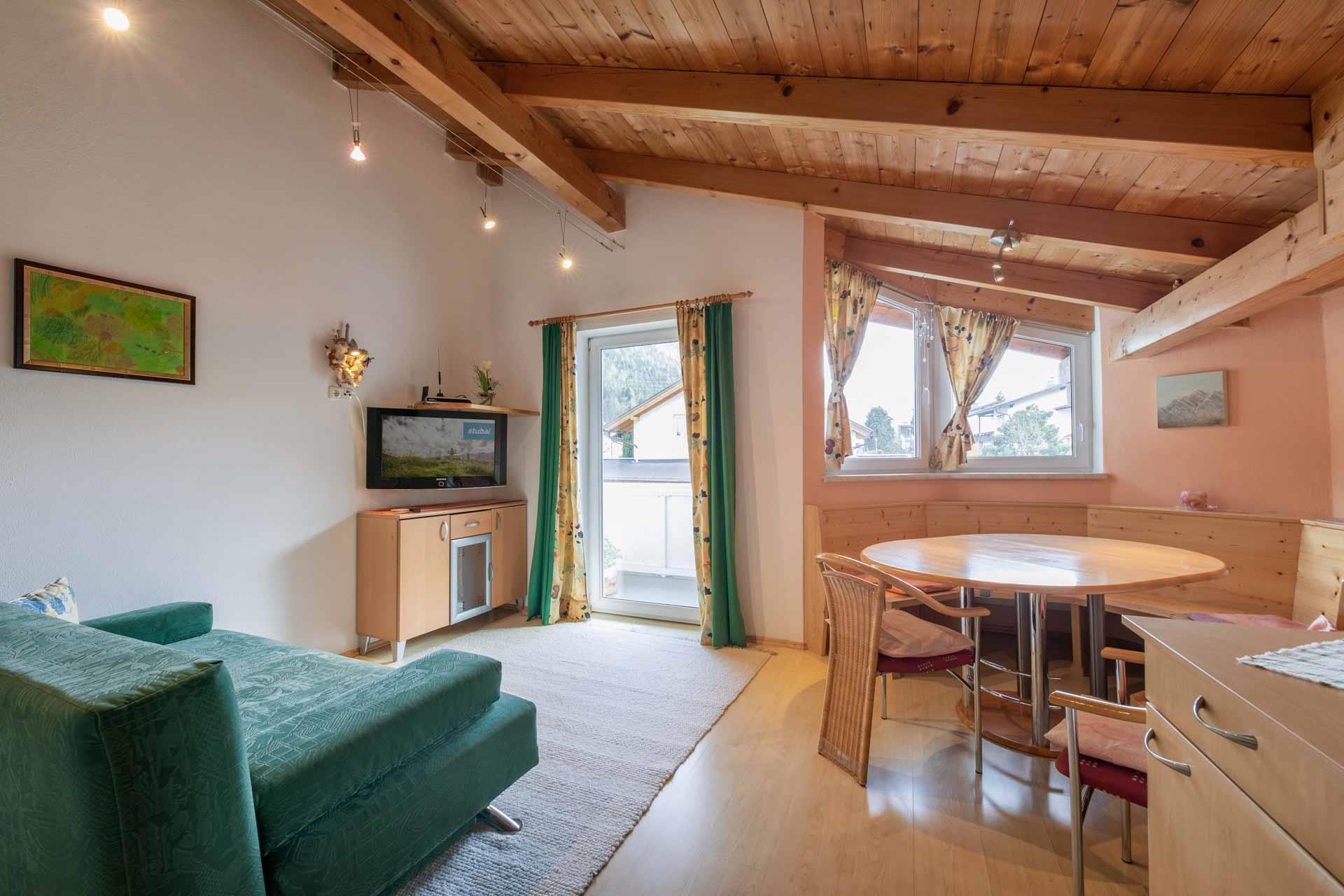 Der Gast soll sich wie zu Hause fühlen und in seinen Ferien die Möglichkeit haben, so richtig die Seele baumeln zu lassen. Unser Appartement 2 ist ideal dafür – es ist eine wahre Höhle zum Träumen! Die Ferienwohnung besteht aus 1 Schlafzimmer, Bad mit Dusche und WC, vollständig eingerichtete Küche mit Kaffeemaschine, Geschirrspüler, Wasserkocher, Micro, Herd (4 Kochplatten und Backrohr), separates Wohnschlafzimmer mit ausziehbarer Couch und TV. Die gemütliche Buchenholz Sitzecke in der Küche bietet Platz bis zur 6 Personen.