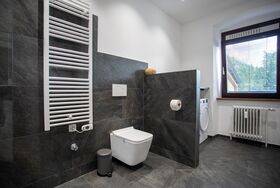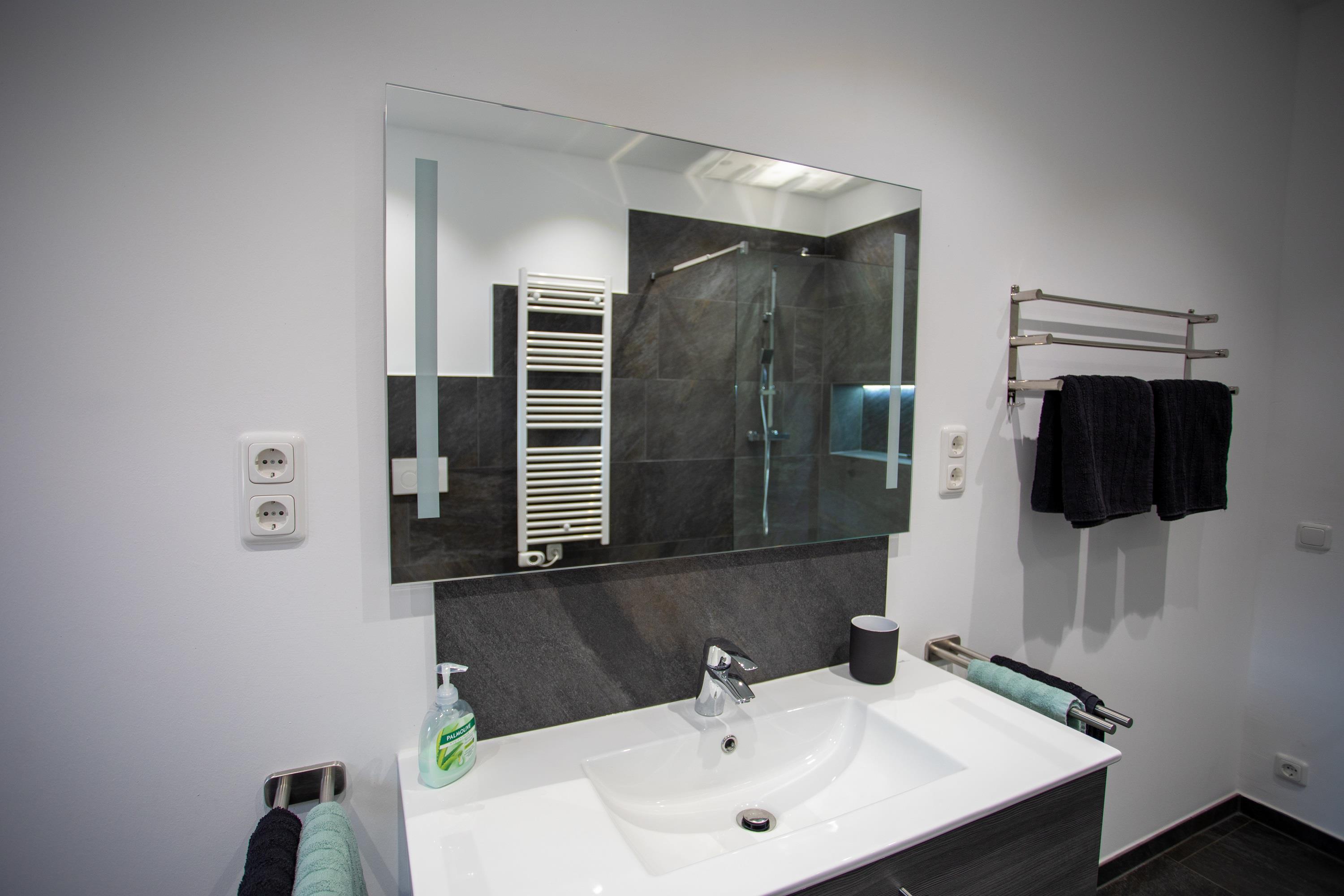 modernes Bad mit begehbarer Regendusche, Handtuchtrockner, WC