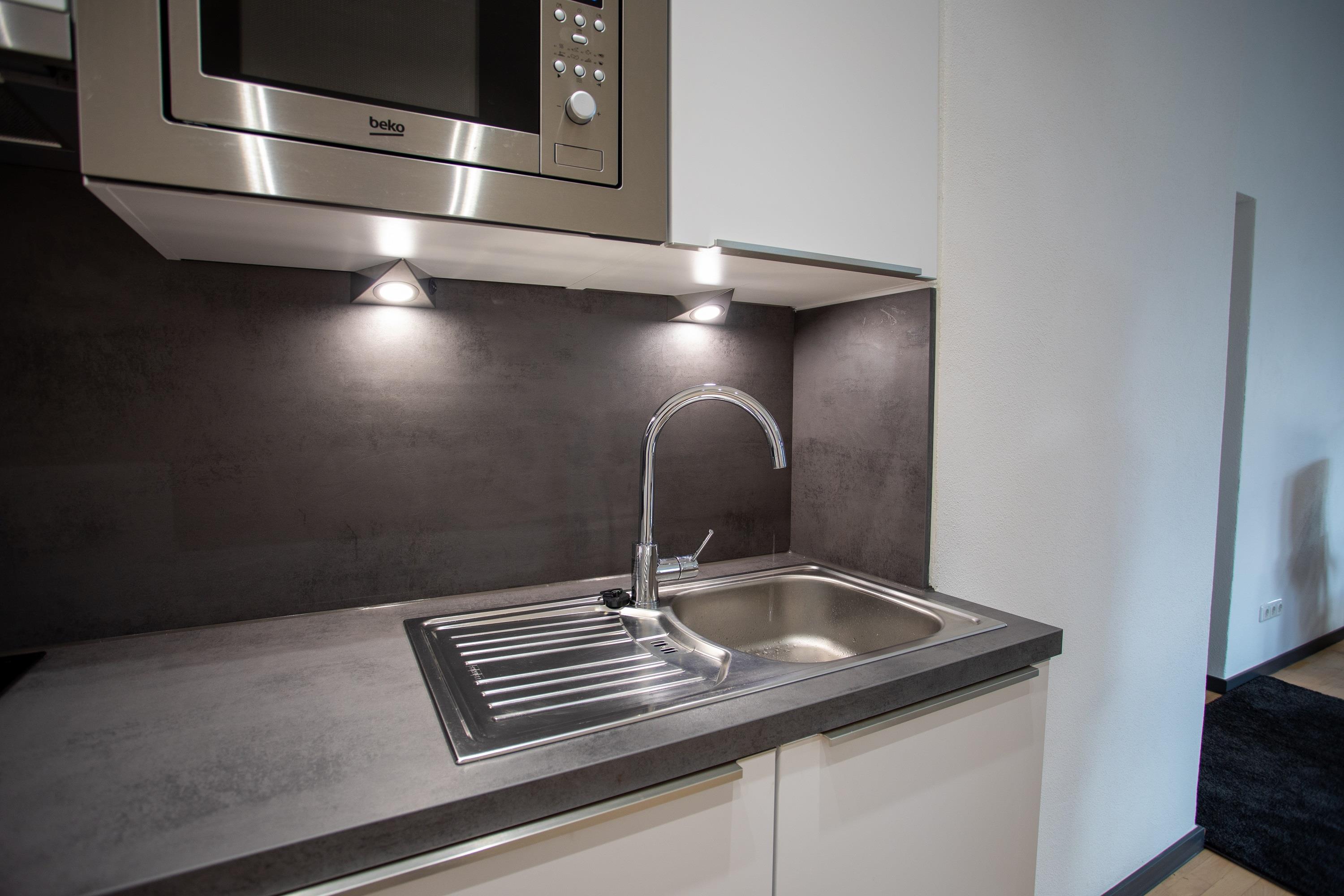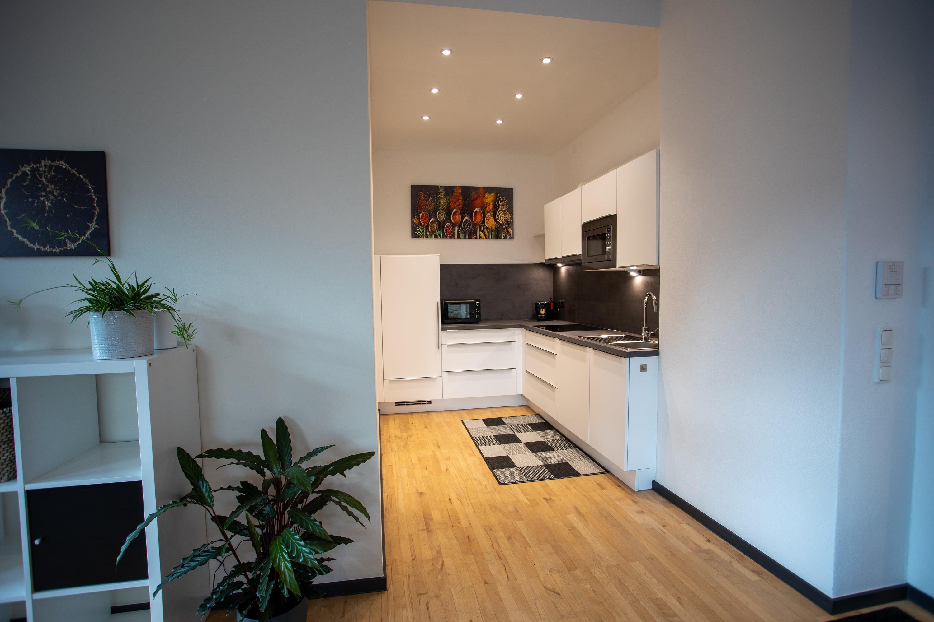 moderne Küche (kleiner Backofen und Ceranfeld, Mikrowelle, Geschirrspüler, Kühlschrank mit Gefrierfach, Kaffeemaschine, Toaster, Wasserkocher, Kochgeschirr u.v.m),