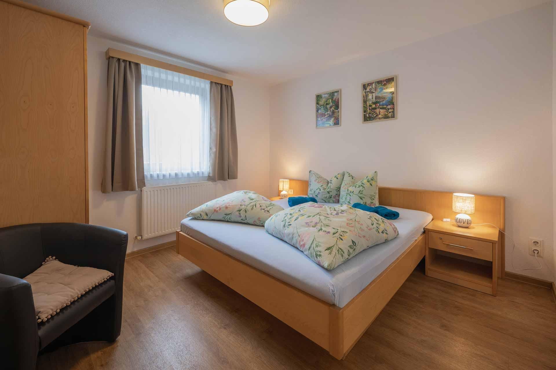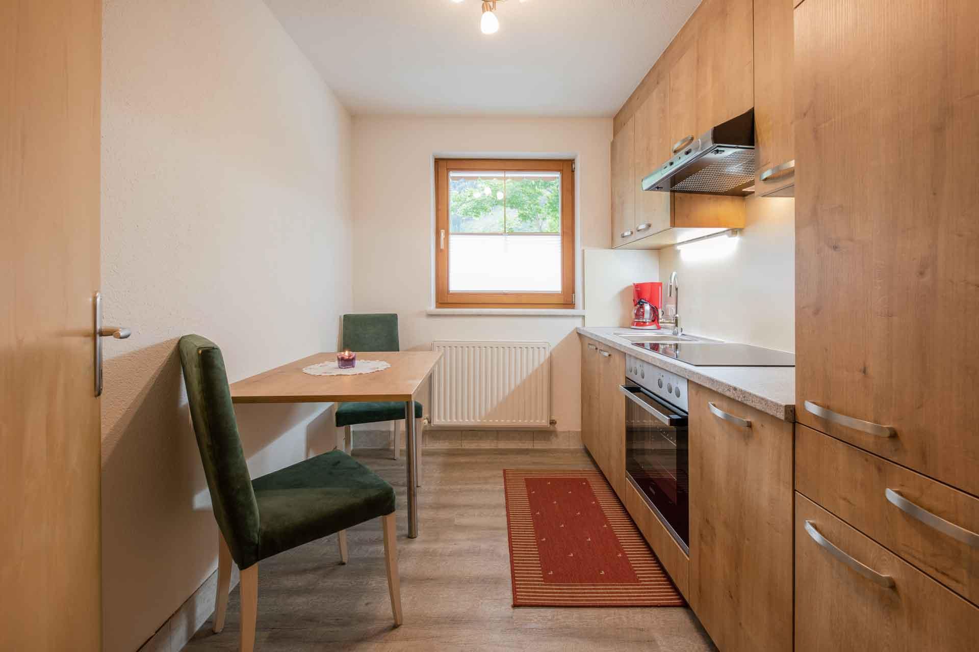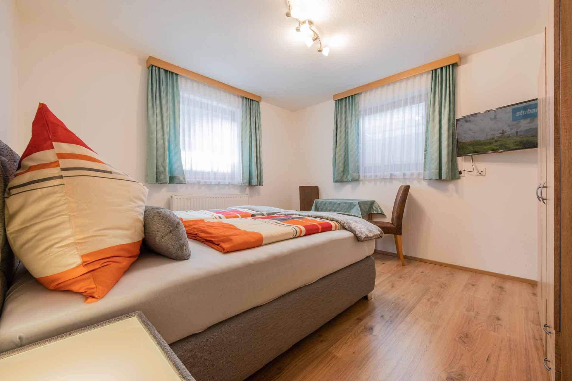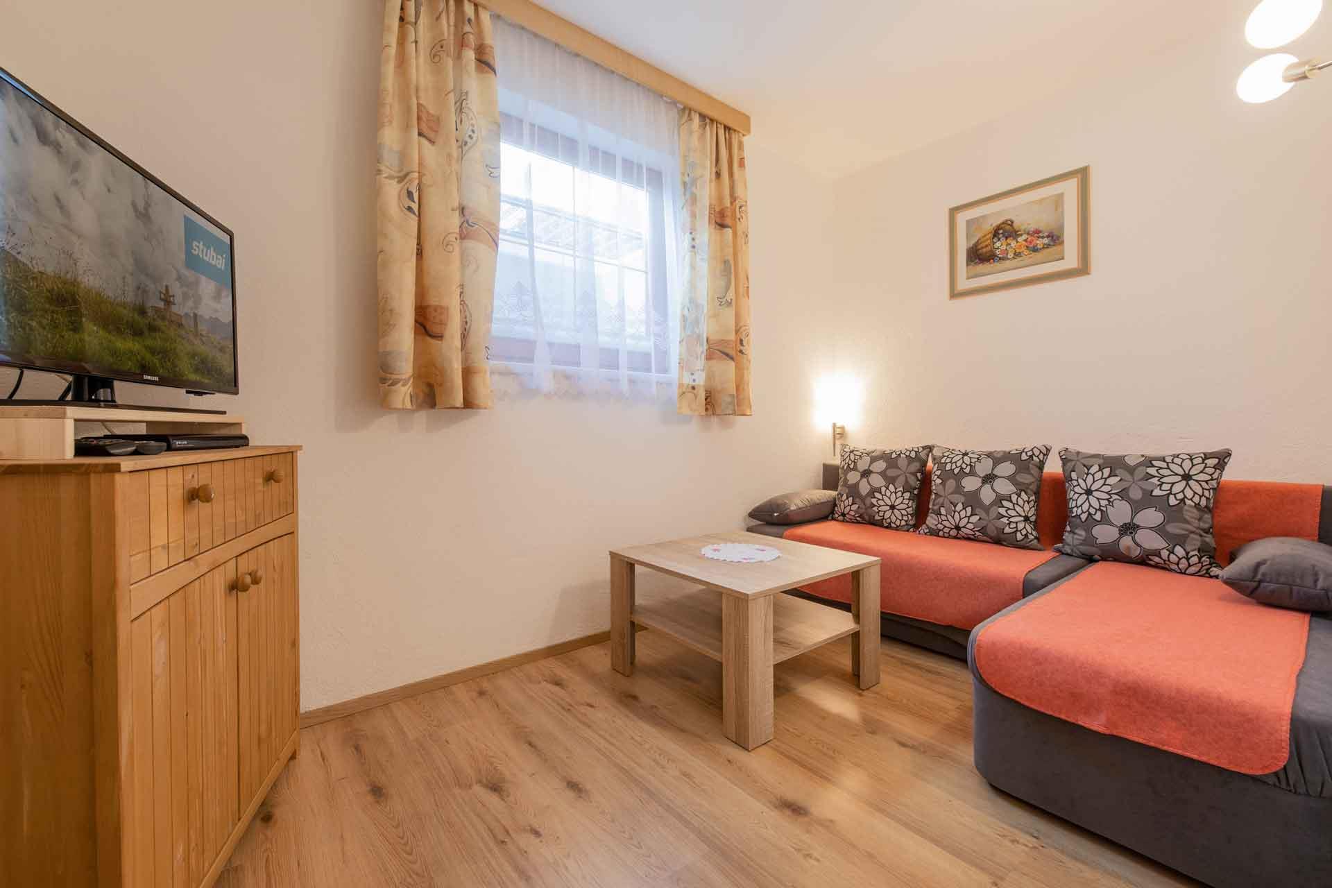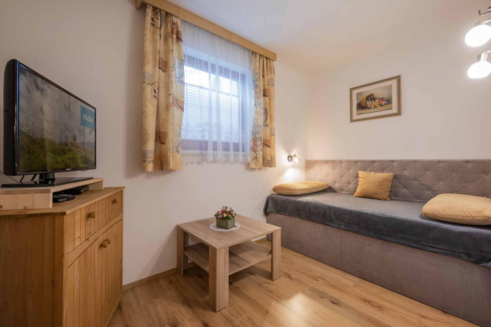 Die Ferienwohnungen sind gemütlich im Tiroler Stil mit Holzmöbeln eingerichtet. Viele Fenster sorgen für lichtdurchflutete Räume und bieten einen herrlichen Ausblick auf den imposanten Stubaier Gletscher.