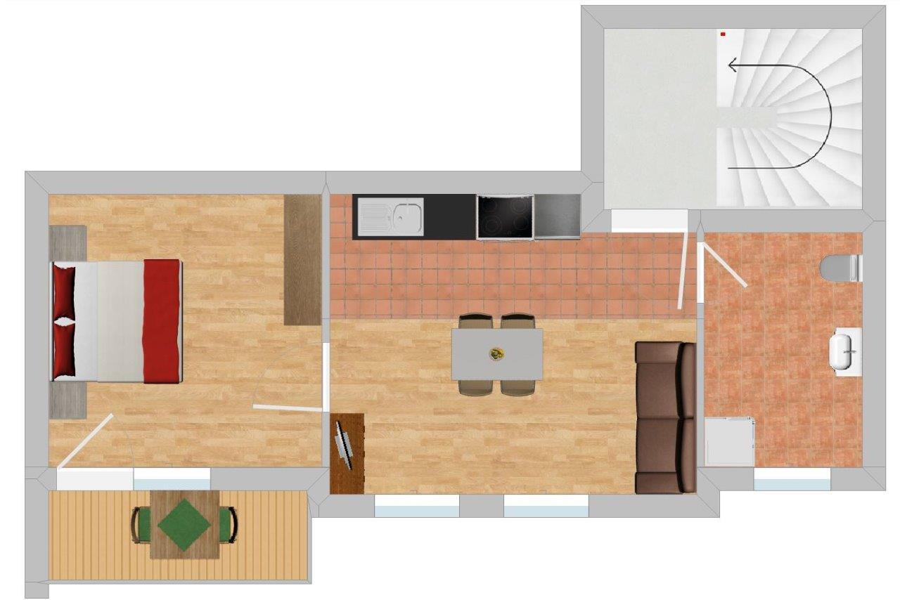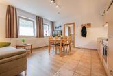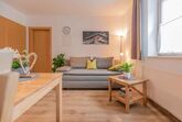 • Ein offener Wohnbereich mit einer voll ausgestatteten Küche und einem gemütlichen ausziehbarem Boxspringsofa (Schlafplatz für 3. und 4. Person).