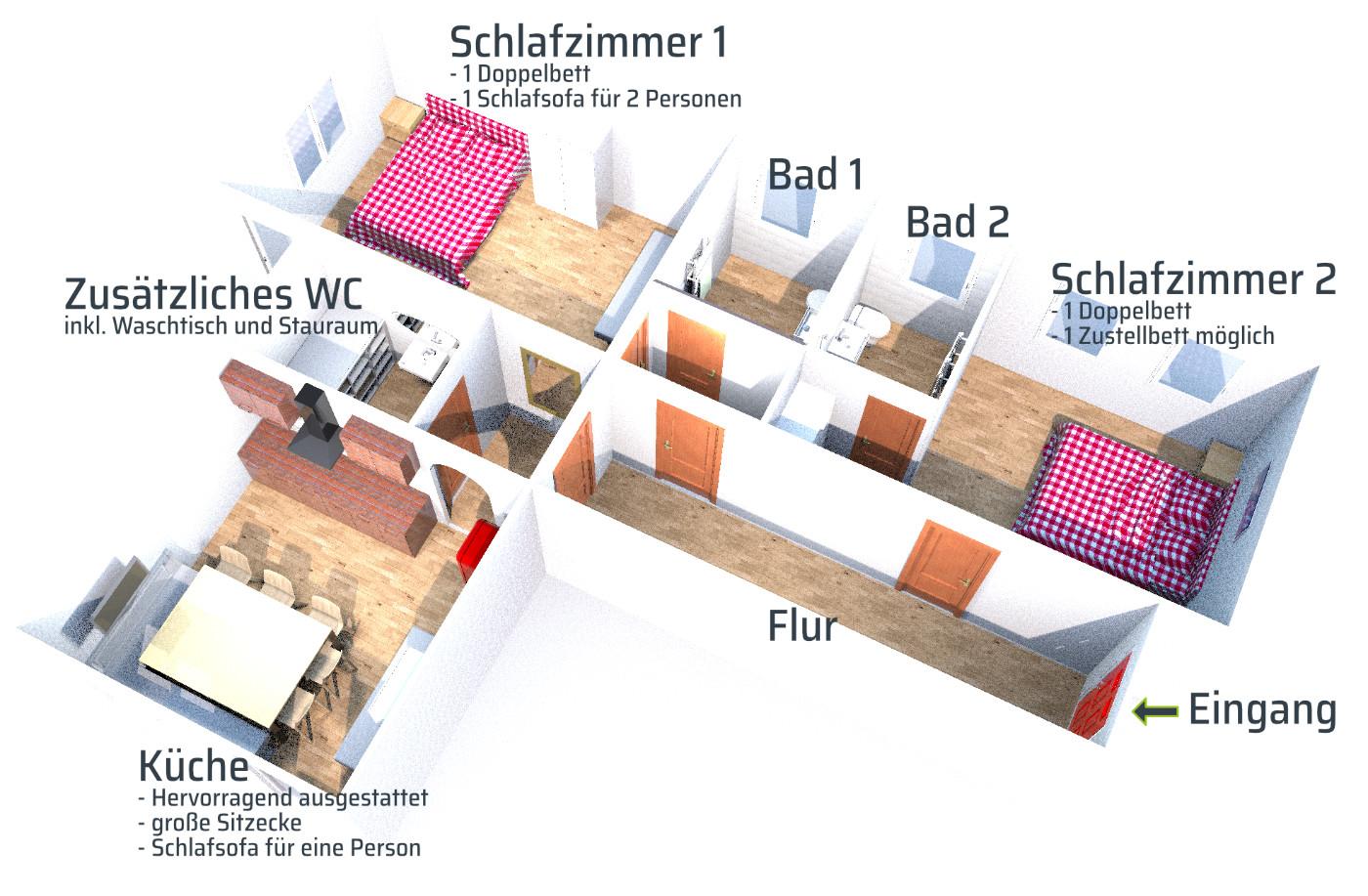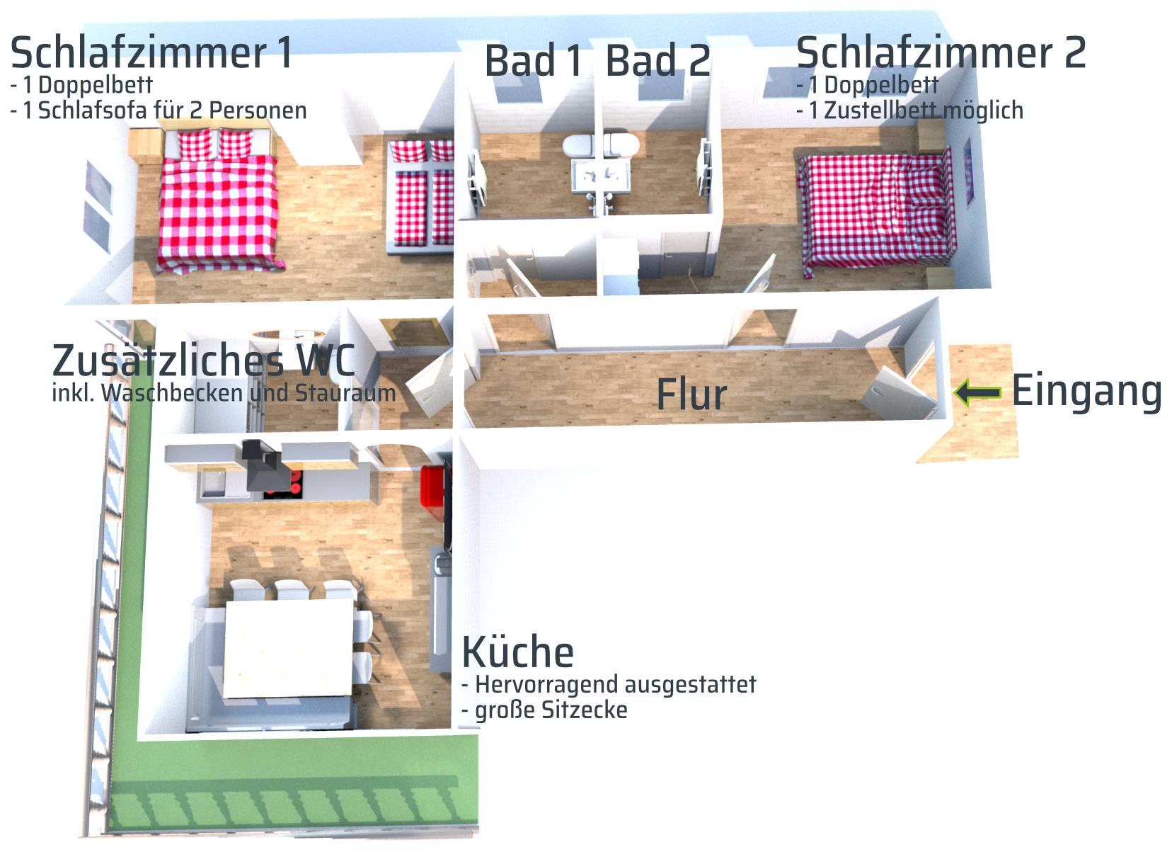 Familie oder Reisegruppe - hier findet jeder auf 63 qm seinen ganz persönlichen Wohlfühlplatz. Hunde sind gern gesehene Gäste. Zwei Schlafzimmer, jeweils mit privaten Badezimmern, private Infrarotsauna, Sonnenbalkon mit Gletscher- und Wasserfallblick. Entspannung und Ausgeglichenheit erhalten Einzug. Am großen Esstisch in der der hervorragend ausgestatteten Wohnküche trifft alpine Einrichtung auf gesellige Gemütlichkeit.