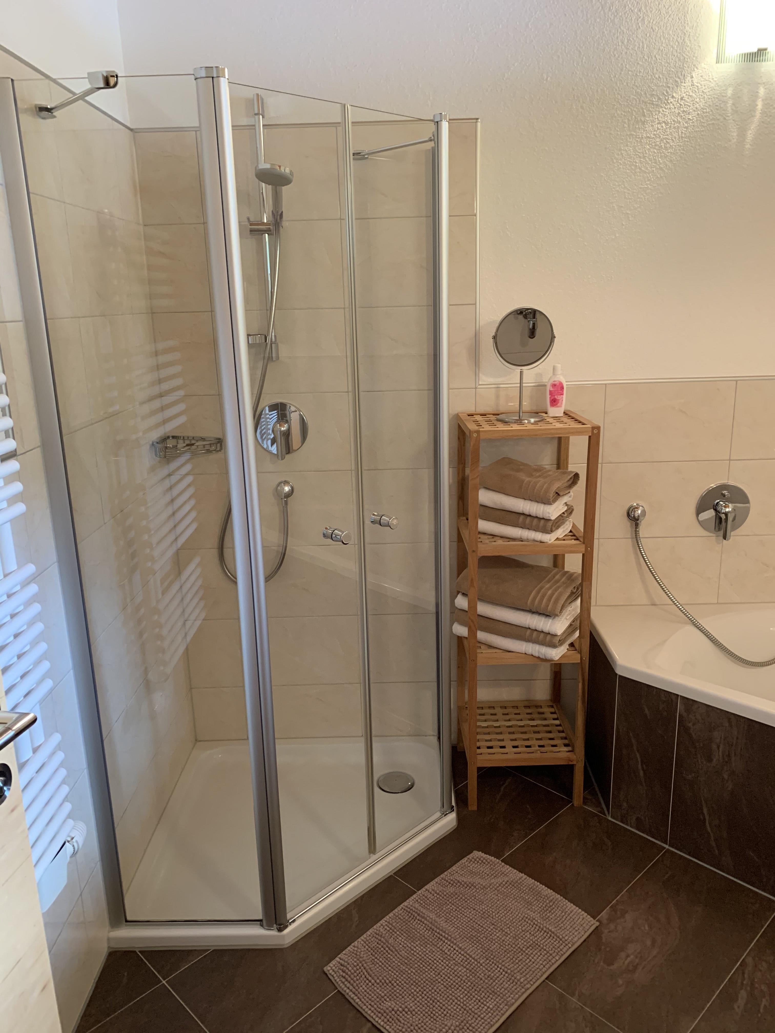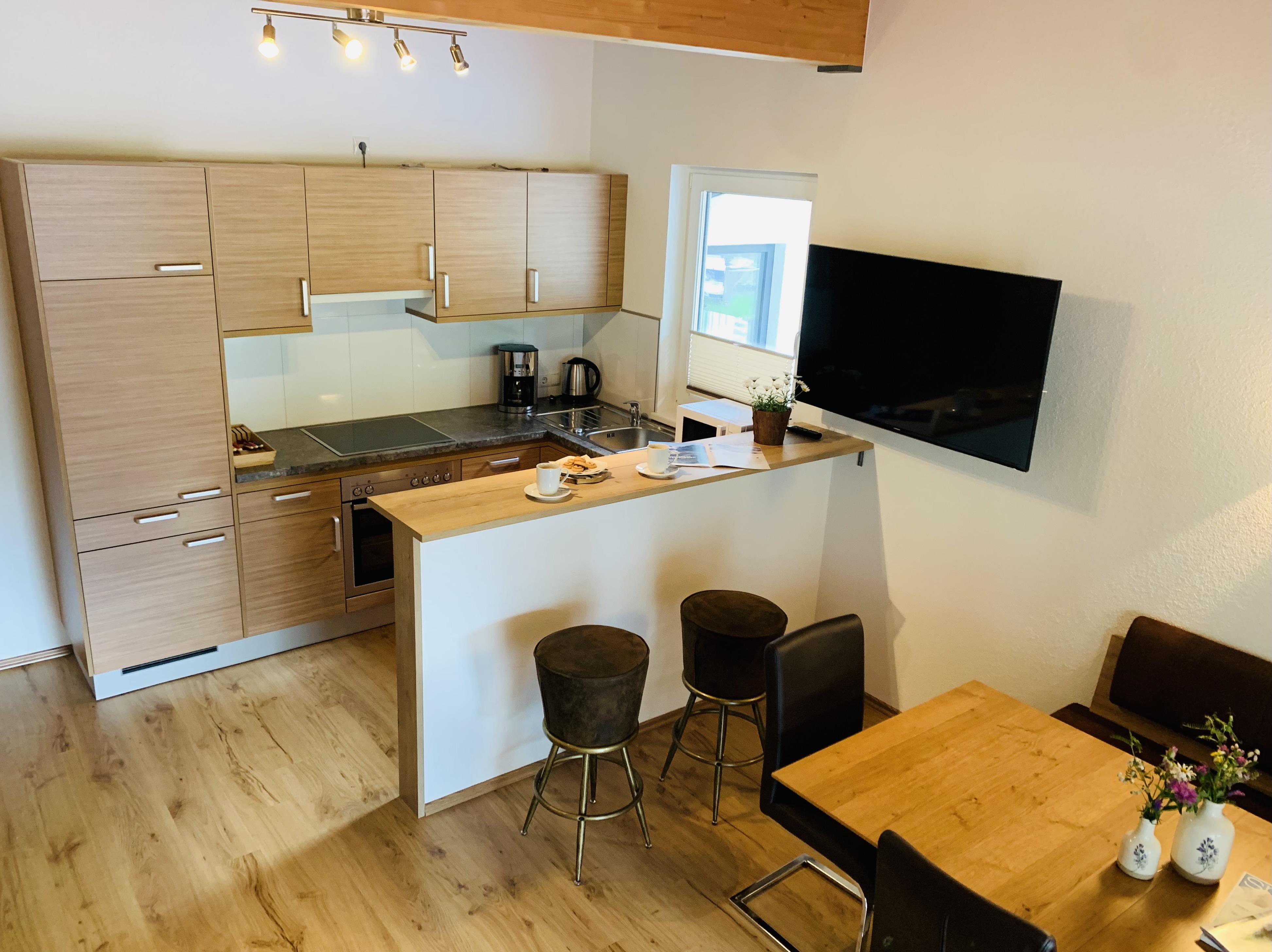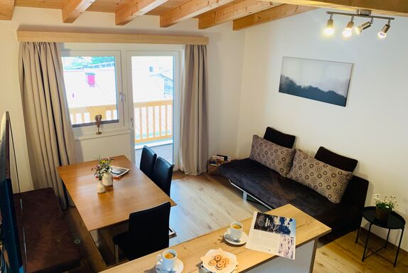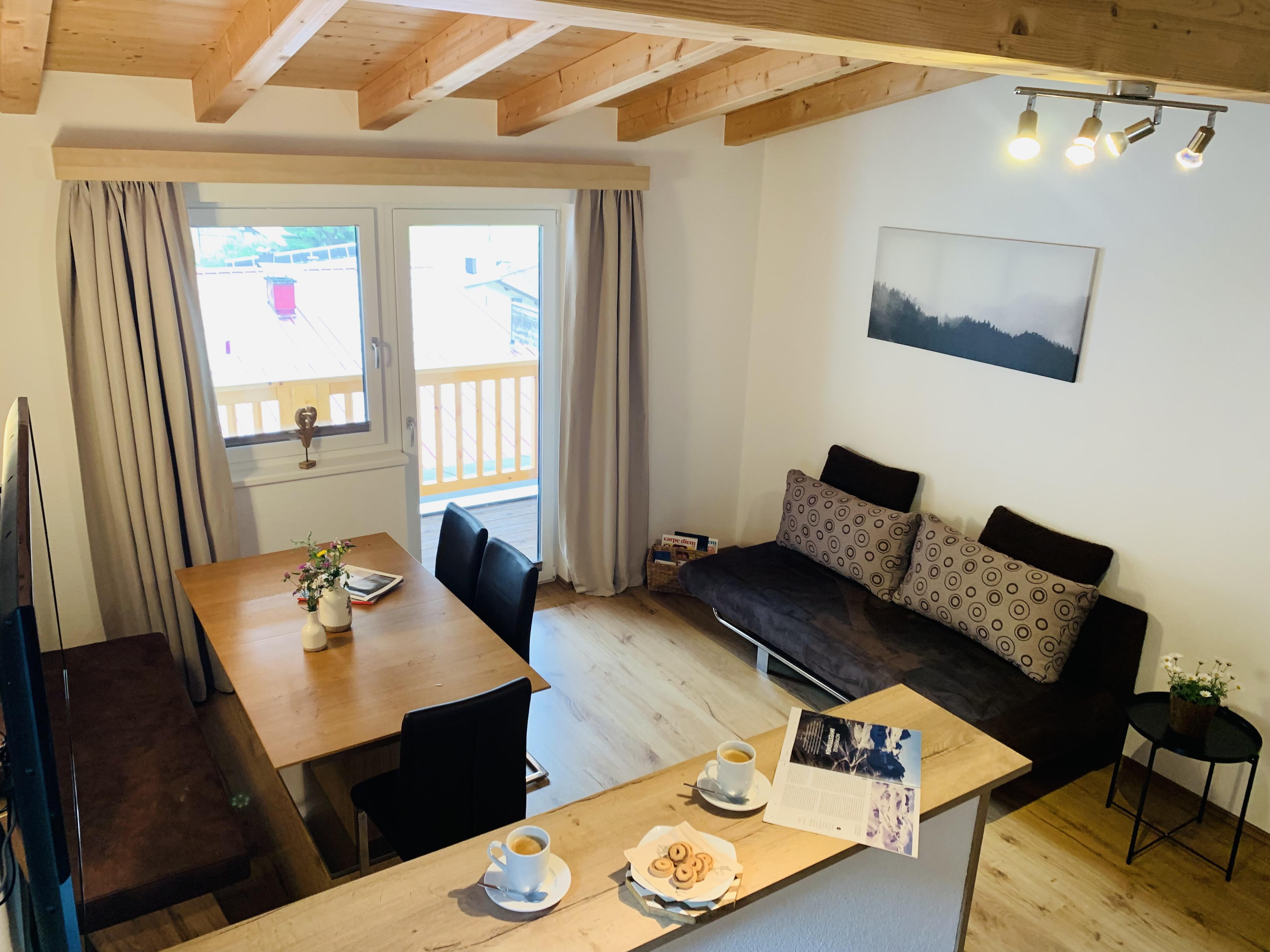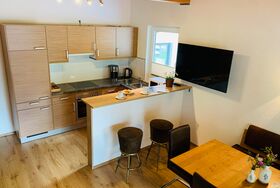Appartement mit ca. 75 m² und Balkon mit gemütlichen Sitzmöbeln: 2 Doppelzimmer mit Flat-TV, 1 Badezimmer mit Badewann und Dusche, Haarföhn und Kosmetikspiegel; 1 separates WC; vollausgestattete Wohnküche mit gemütliche Essecke, Sofa und Flat-TV, Geschirrspüler, Cerankochfeld, Backofen, Gefrierfach, Toaster, Wasserkocher, Kaffeemaschine und Mikrowelle.
