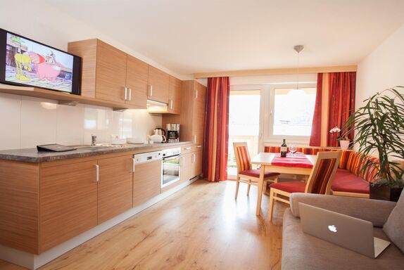 Die Wohnung besteht aus 1 Doppelzimmer mit Flat-TV, 1 Schlafzimmer mit Etagenbetten und eigenem Flat-TV, 1 Badezimmer mit Dusche/WC, Haarföhn und Kosmetikspiegel. Die Wohnküche verfügt über eine gemütliche Essecke, Sofa und Flat-TV und ist mit Geschirrspüler, Cerankochfeld, Backofen, Gefrierfach, Toaster, Wasserkocher, Kaffeemaschine und Mikrowelle ausgestattet sowie Balkon mit gemütlichen Sitzmöbeln.