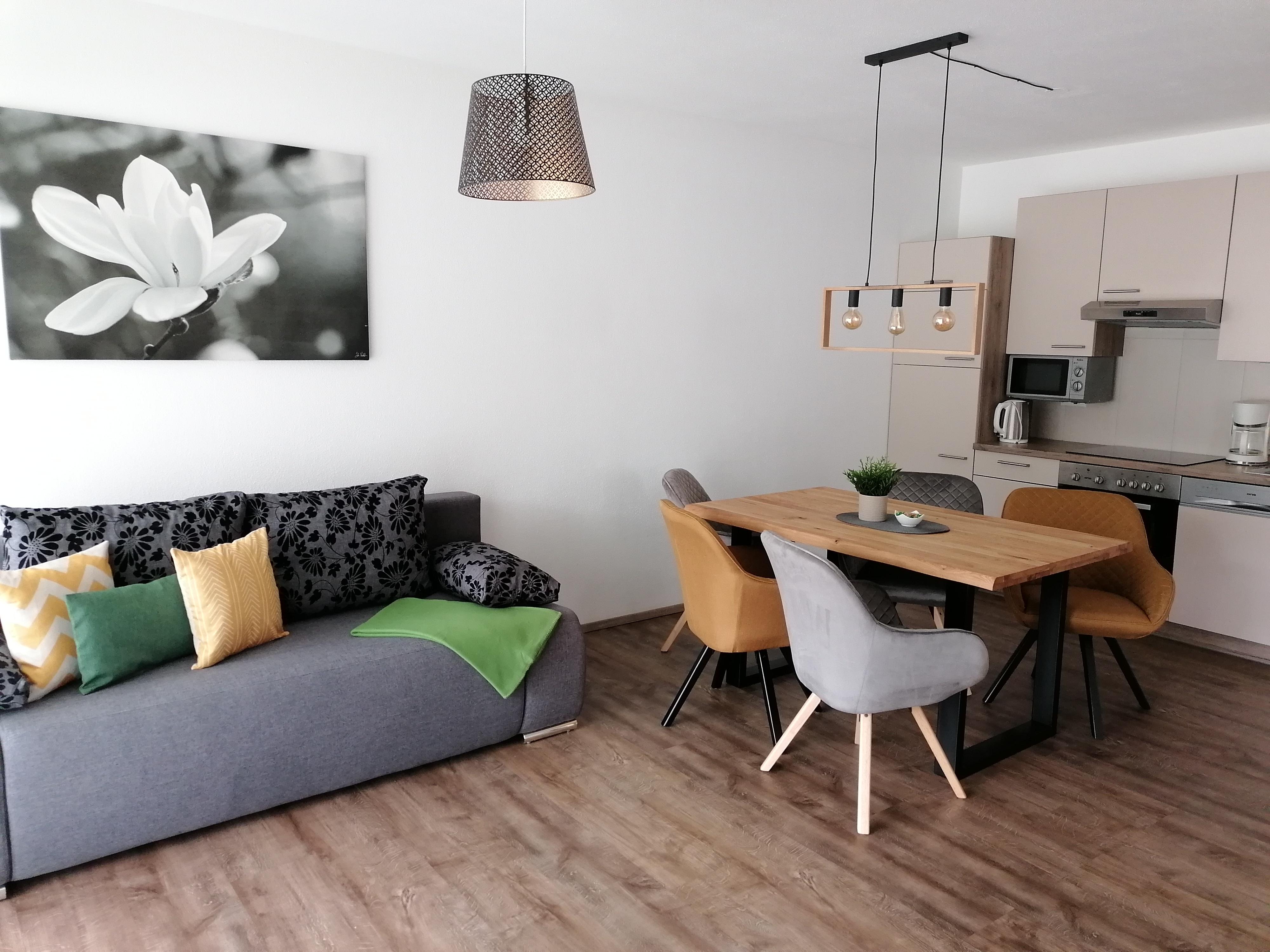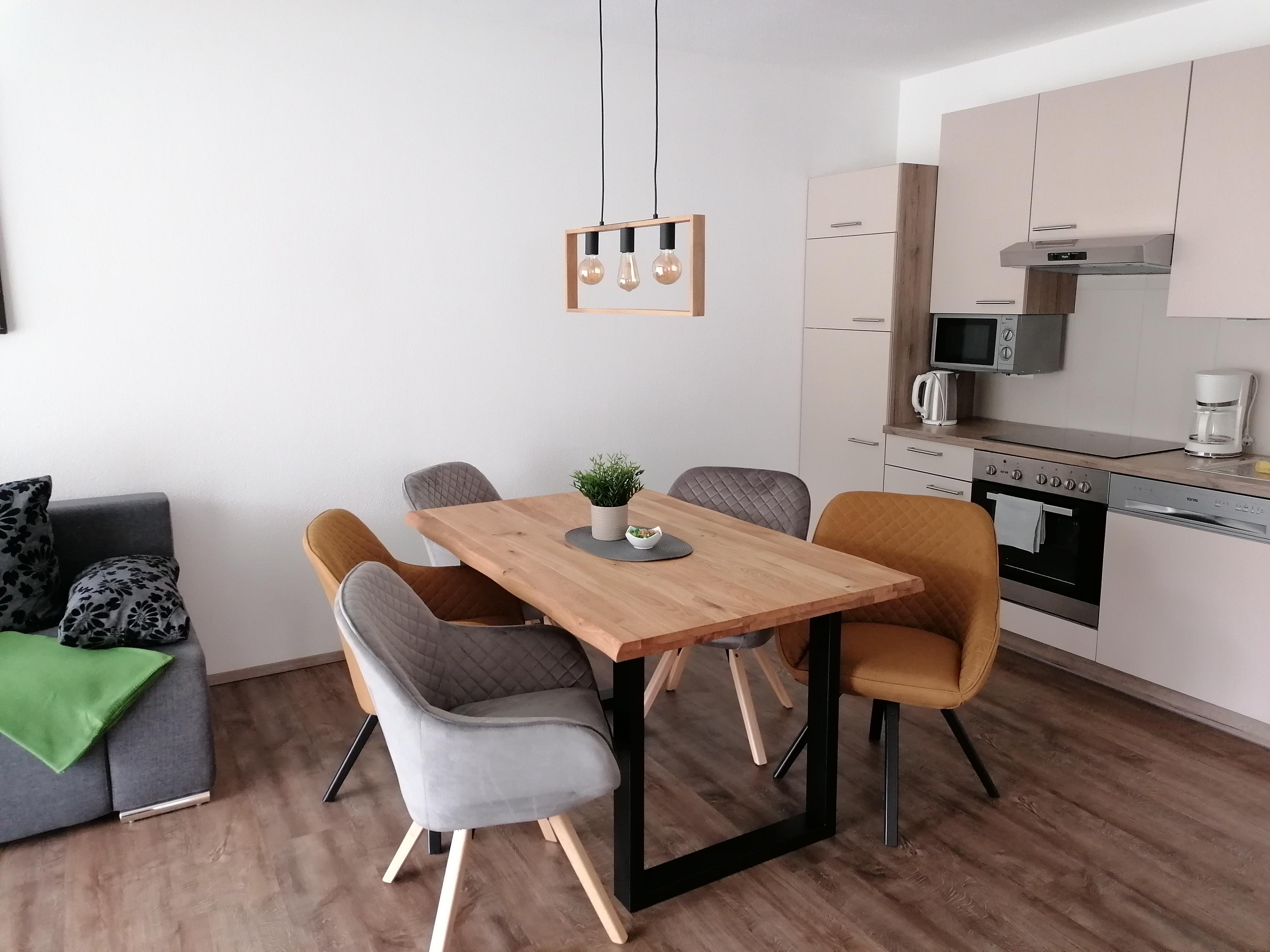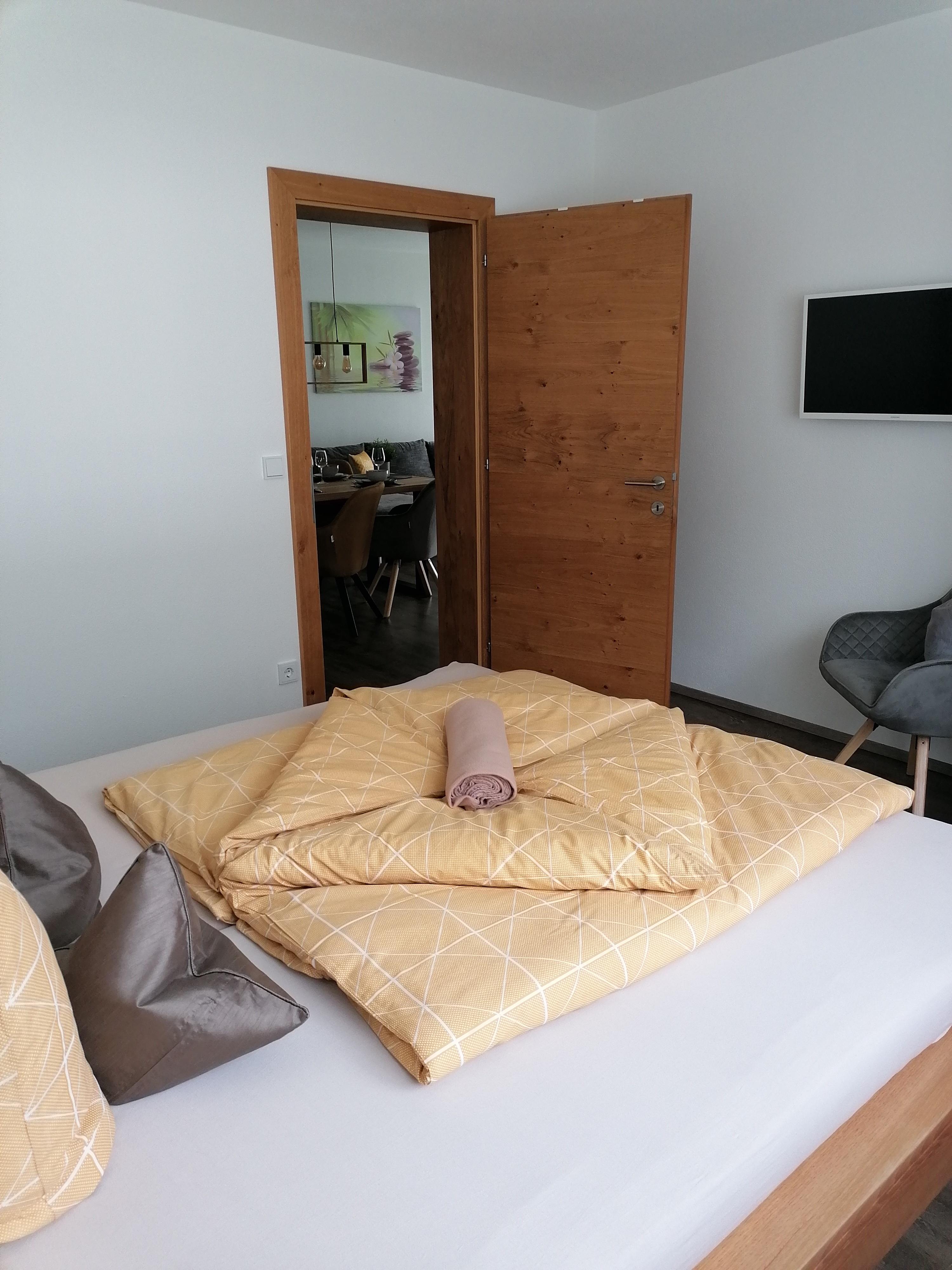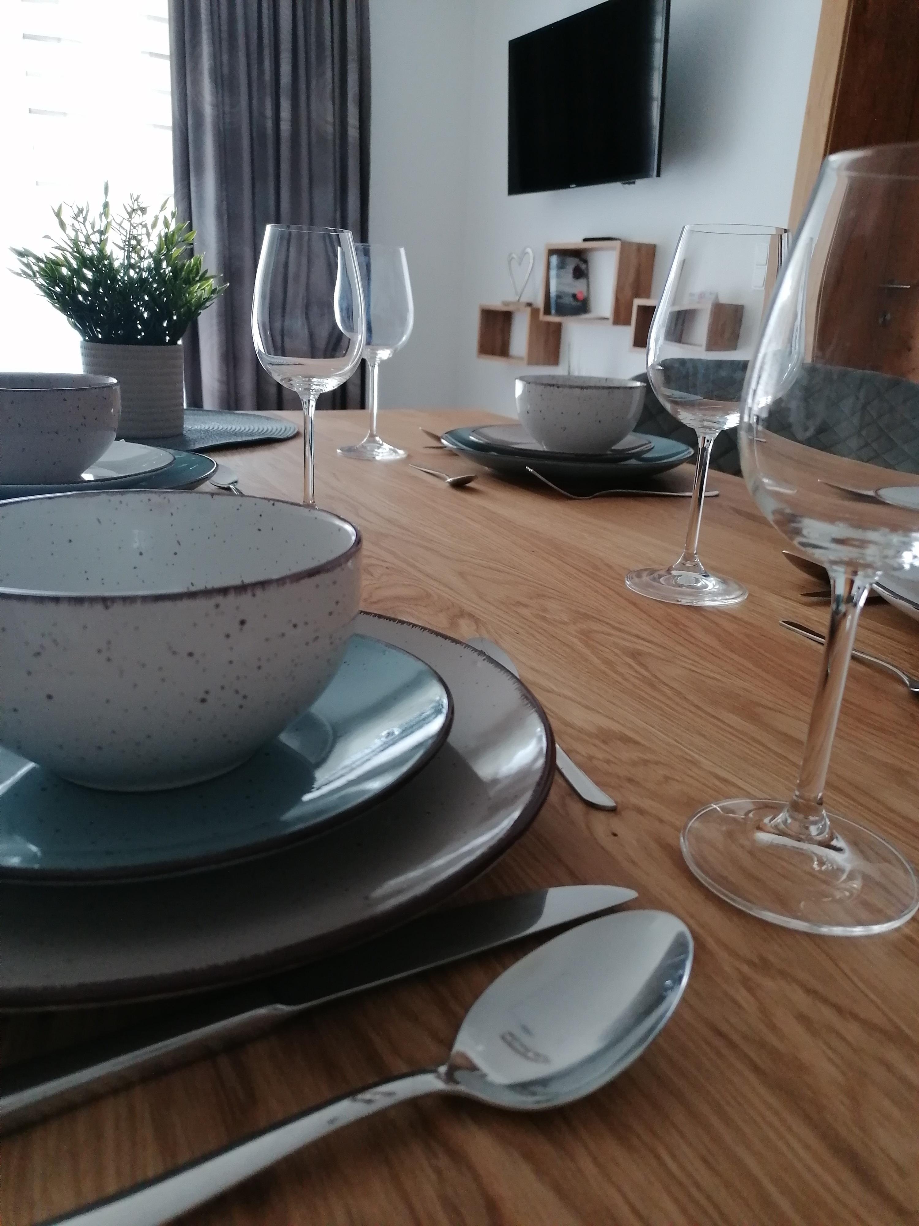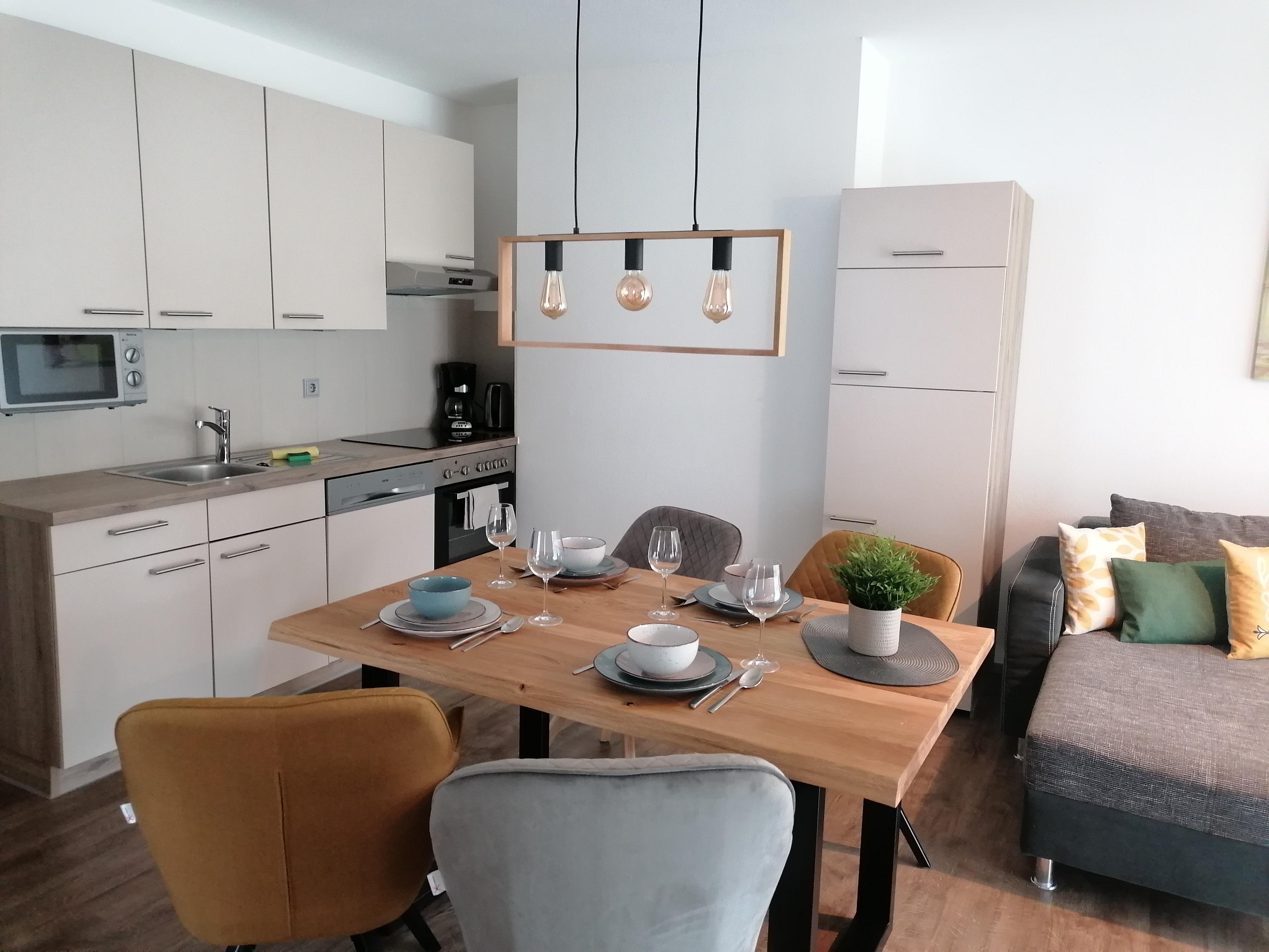 je 66 m², für 2 bis 4 bzw. 6 Personen. Garderobe, zwei separate Schlafzimmer mit Doppelbett aus Eiche-Massivholz (Bettwäsche aus Bio-Baumwolle vorhanden) und je eigenem Flat-TV, Spiegel-Schwebetürschrank, Steckdose mit integriertem USB-Anschluss, Wohnraum mit ausziehbarer Couch (140x200 cm), Flat-TV in HD, Vileda Saugroboter, neuer gemütlicher Essgruppe und voll ausgestatteter Küchenzeile inklusive Mikrowelle, Geschirrspüler, Backofen und Kühlschrank mit Gefrierfach, Filterkaffeemaschine, Wasserkocher, Toaster, Badezimmer mit großzügiger Dusche und Toilette, Doppelwaschbecken und Spiegel inklusive Led-Beleuchtung, Haarfön, Kosmetikspiegel, Handtuchtrockner (Handtücher stehen zur Verfügung), zusätzliche separate Toilette, überdachte Terrasse mit gemütlicher Sitzgelegenheit und gemeinsamer Gartennutzung