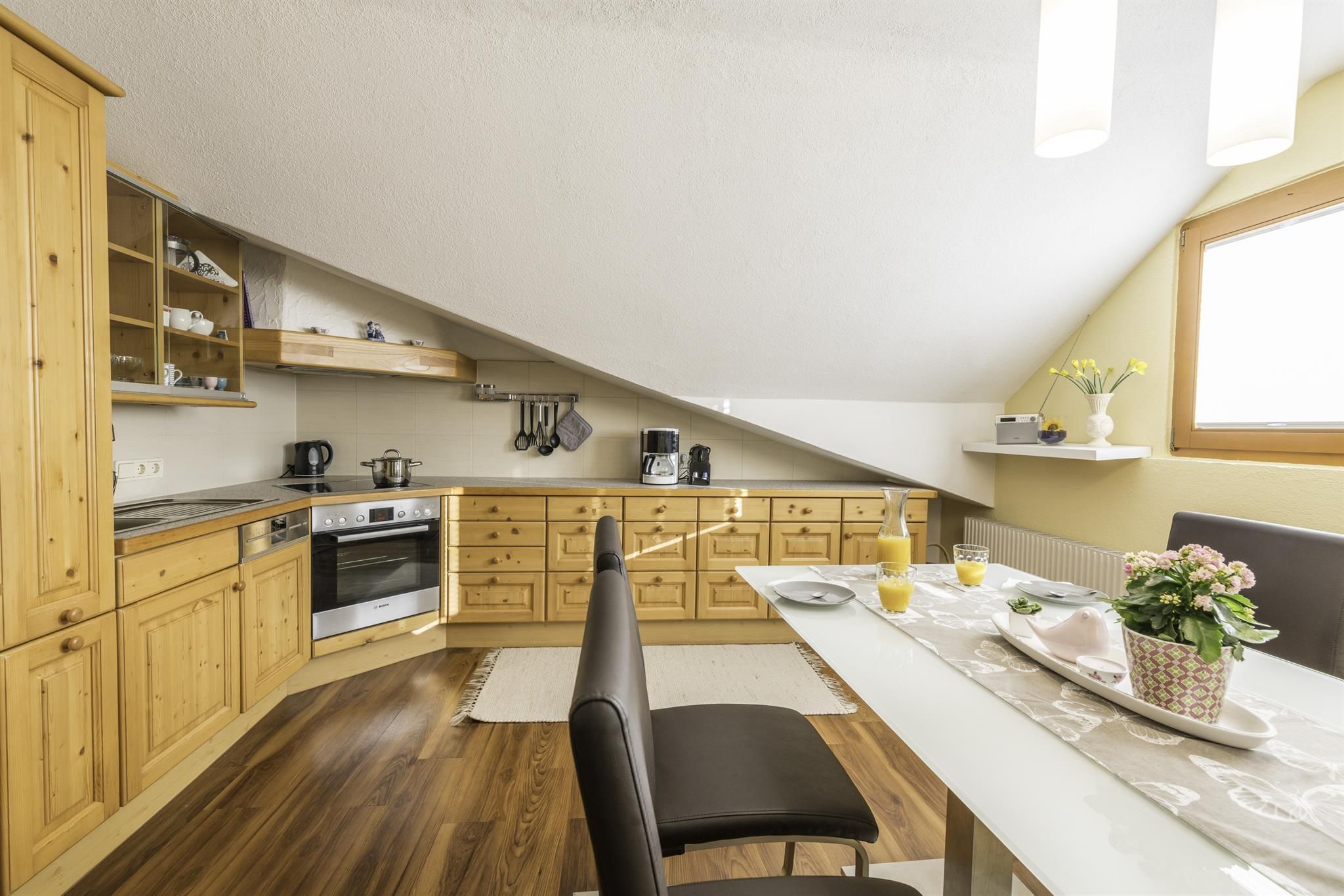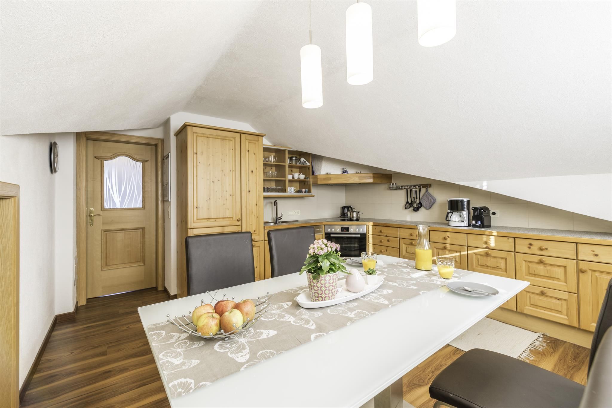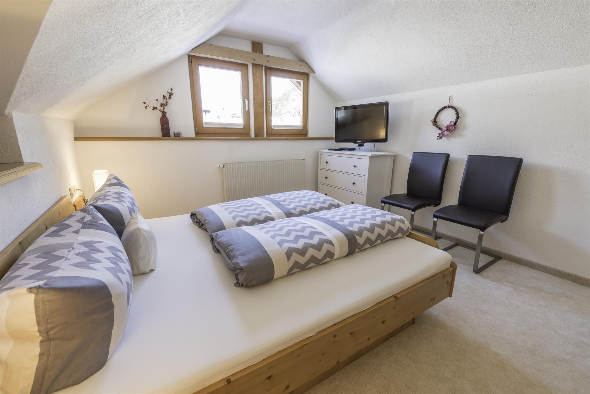 Ca. 73 m2 große, komfortable Ferienwohnung für 2-3 Personen (Dachgeschoßausbau) mit Balkon (herrliche Aussicht, letzte Abendsonne). Die Ferienwohnung besteht aus: 1 Doppelbettzimmer, 1 Wohnzimmer (zusätzl. gute Schlafmöglichkeit für 1 Person) mit Kabel-TV, Internetanschluss (W-Lan), eigener Küche (großer Eßtisch, E-Herd m. Backrohr, Mikrowelle, Geschirrspüler etc.), Badezimmer mit Badewanne, Dusche und WC.