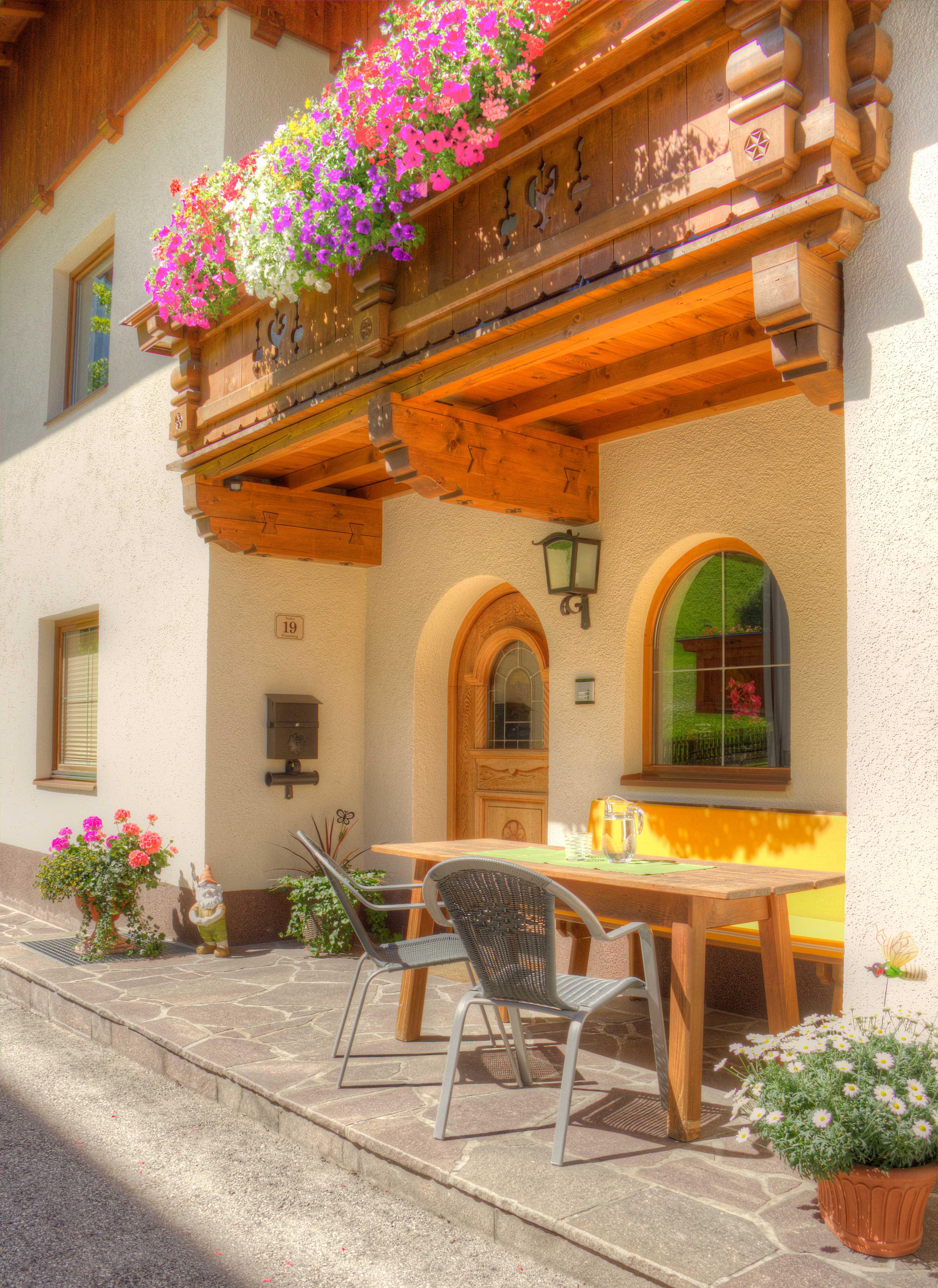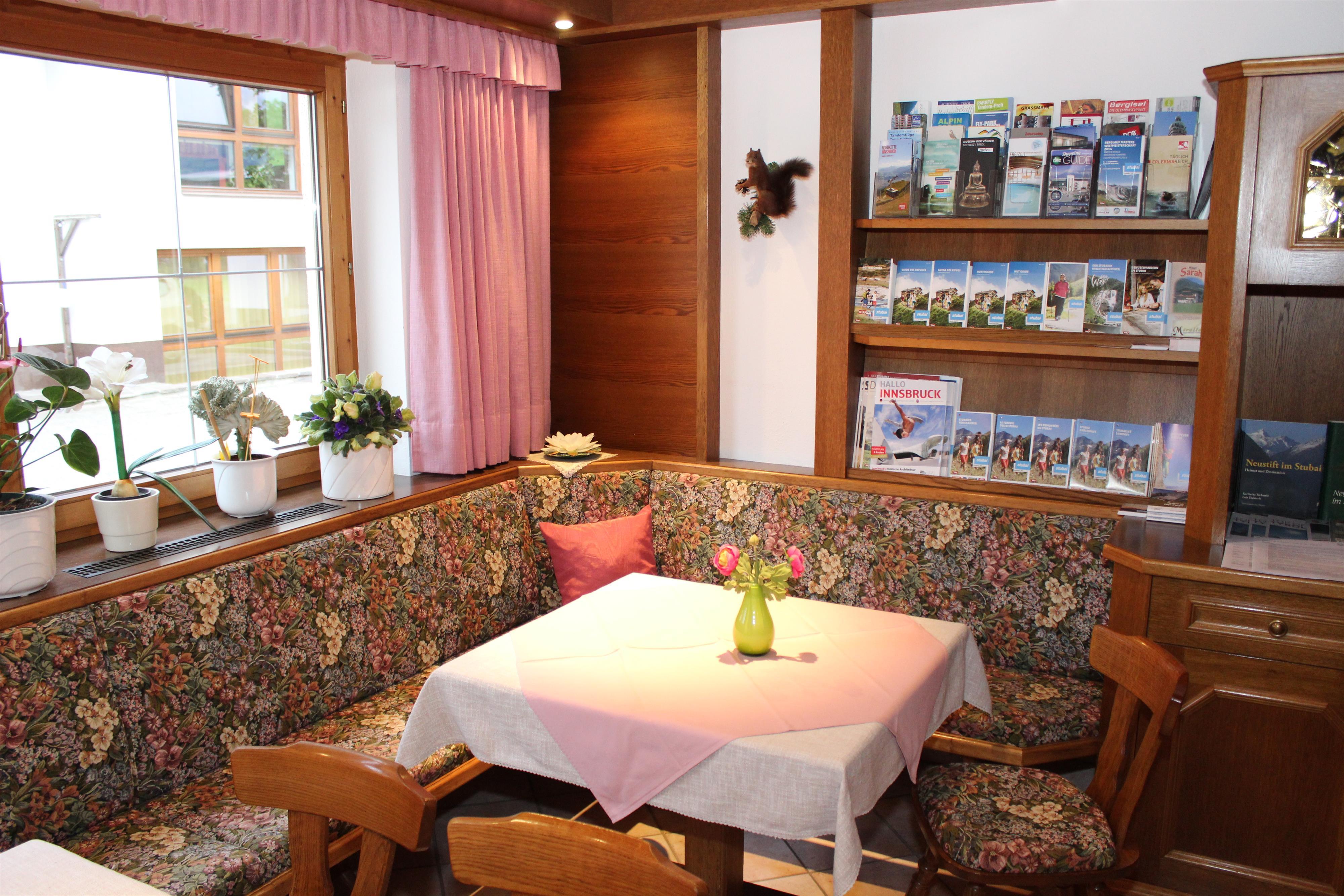 Unser Aufenthalts-/Frühstücksraum lädt dazu ein, in gemütlicher Atmosphäre Ihre mitgebrachte Jause zu verzehren oder gesellige Abende mit Familie und Freunden zu verbringen. Südseitig an unserem Haus Sarah liegt unsere herrliche Sonnenterrasse mit rustikalen Sitzbänken und die Liegewiese mit bequemen Sonnenstühlen, auf der Sie nach einer erlebnisreichen Wanderung die unvergleichliche Natur im Stubaital genießen.