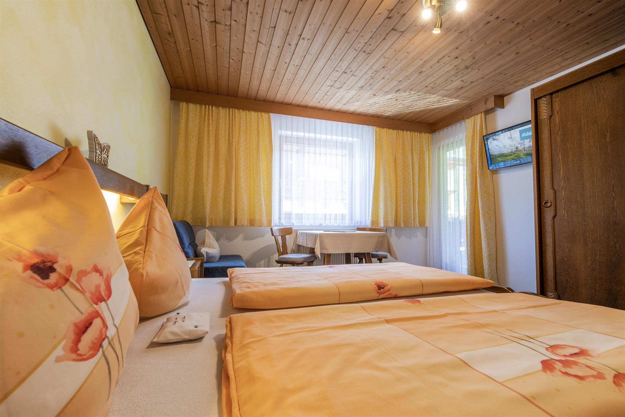 Zimmer: ca. 16 m² *** Doppelbett (1 Bett/2 Matratzen mit jeweils 200x90 cm), ausgestattet mit Sleeptex-Lattenrosten mit Härtegradverstellung im Beckenbereich, Sleeptex 7-Zonen-Kaltschaummatratzen mit Frotteebezug (für Allergiker geeignet) *** Wolldecken *** auf Wunsch Zusatzkissen *** Tisch mit 2 Stühlen *** Schranktresor *** Außenthermometer *** 26 Samsung LCD-TV mit etlichen SAT-Programmen *** ausziehbare Schlafcouch *** gratis Kinderbett bei Bedarf *** gratis WLAN (WiFi)