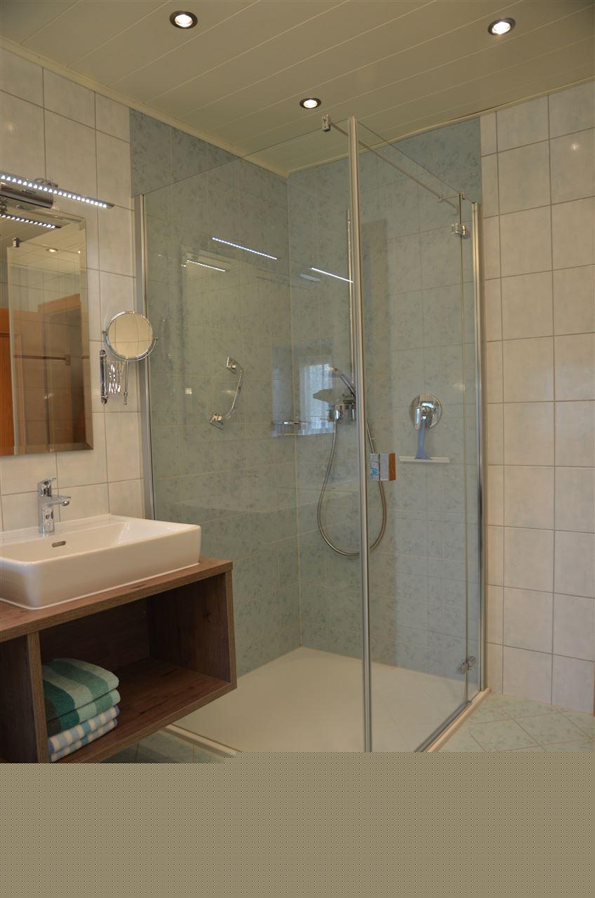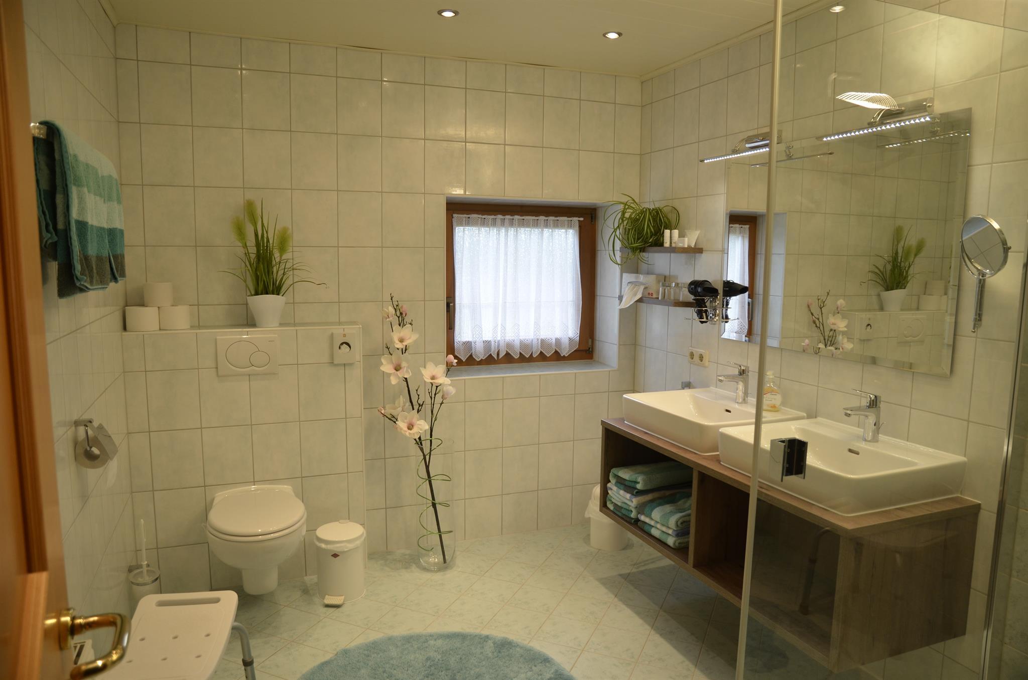 1 Badezimmer - WC, Dusche mit Glasabtrennung, Doppelwaschbecken, Haartrockner, Duschgel und Seife