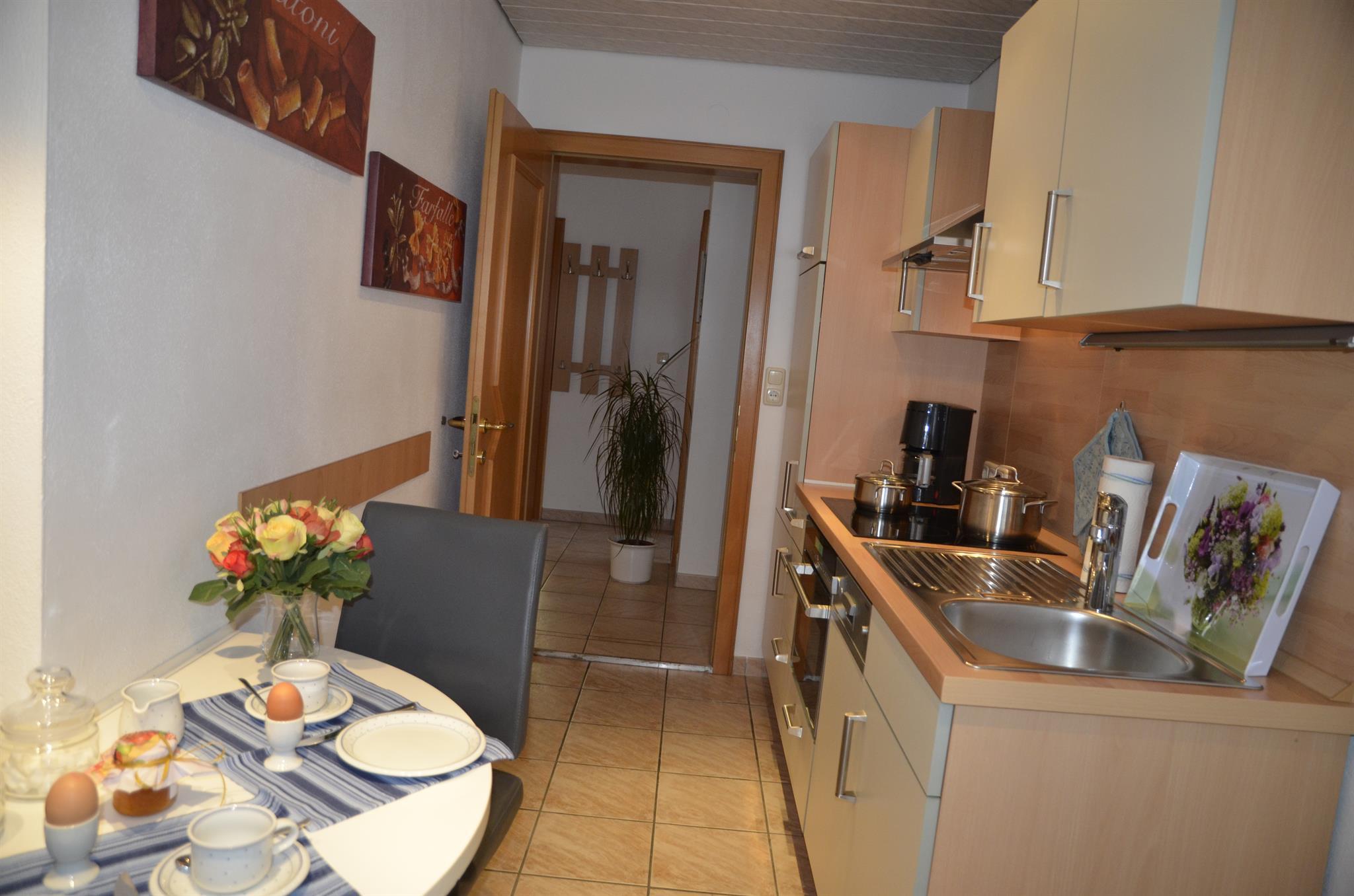 Kühlschrank + Tiefkühlfach, Backofen mit Mikrowelle, Kaffeemaschine, Wasserkocher, Toaster, Eierkocher