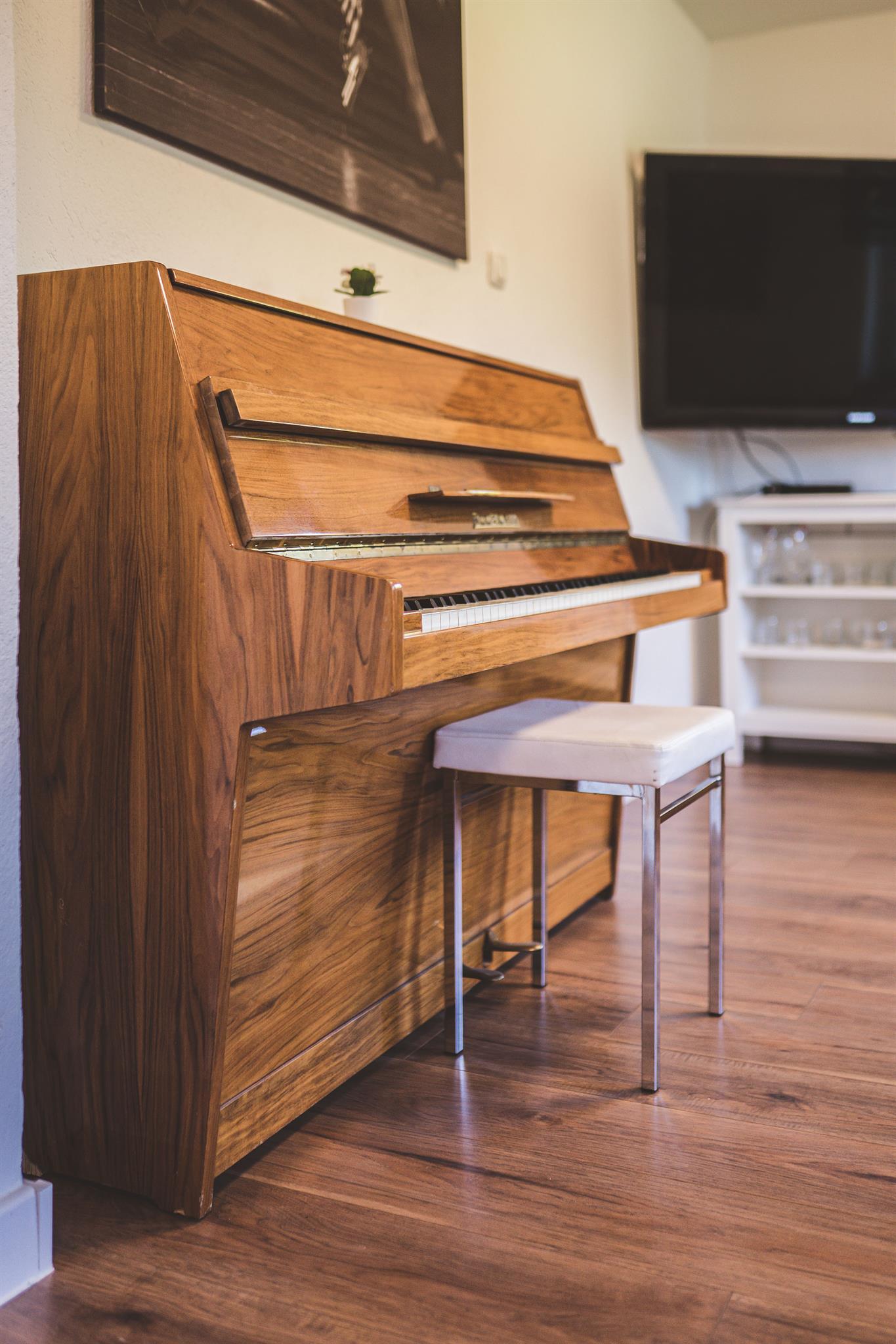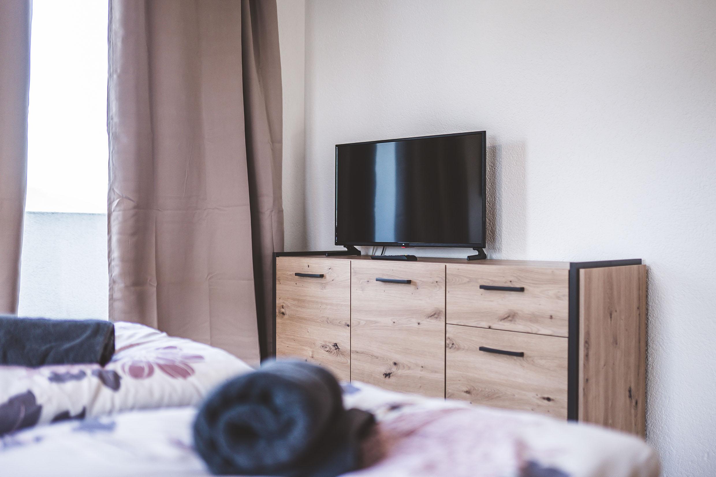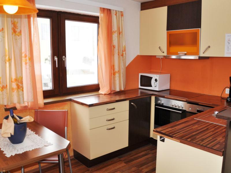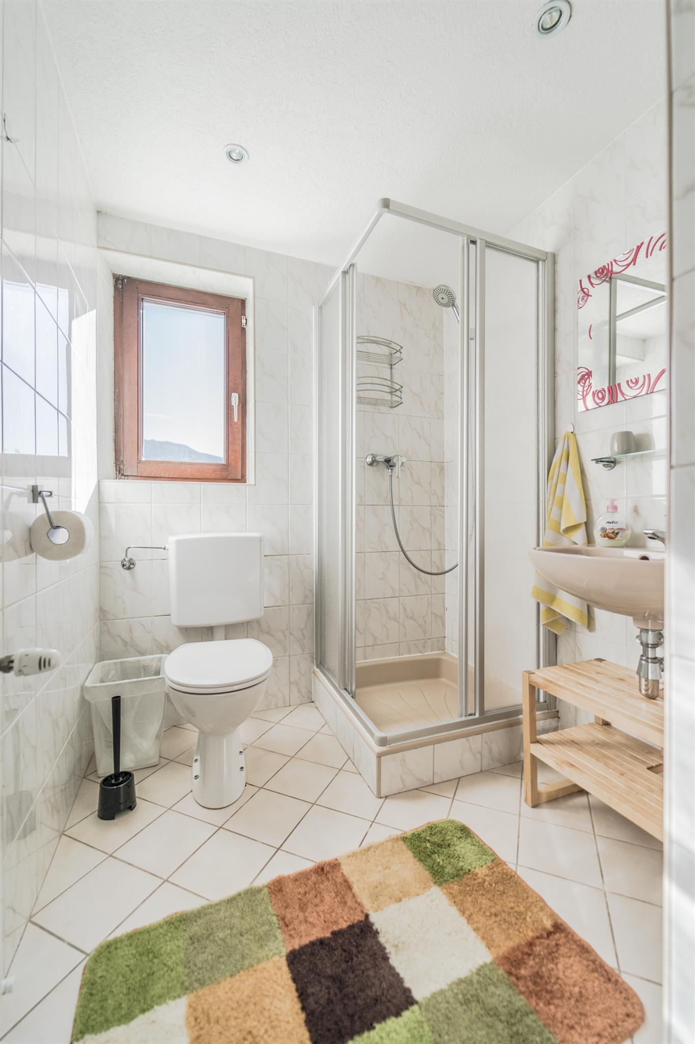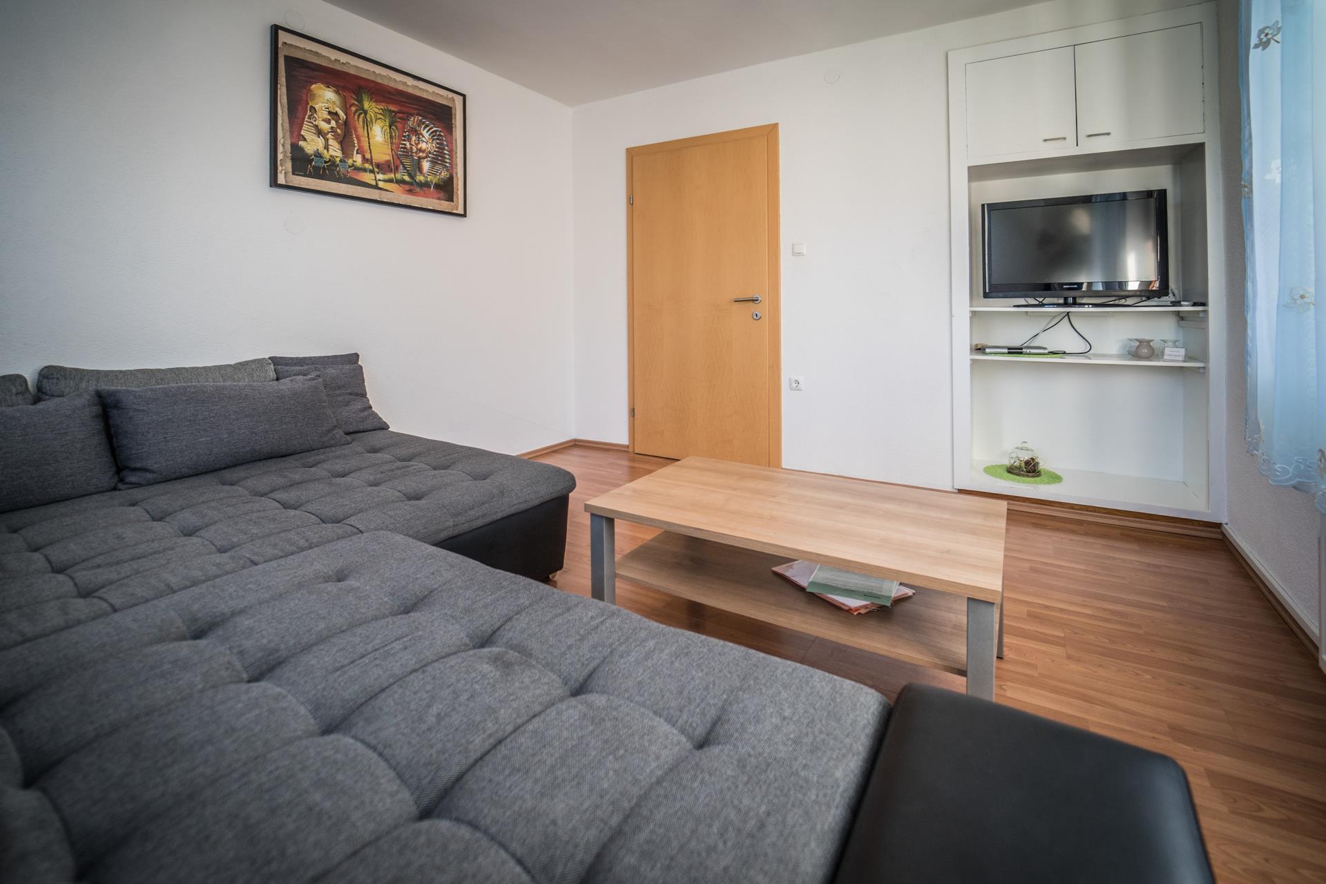 Wohnzimmer mit SAT-TV, Sitzgruppe. Esszimmer mit SAT-TV, Essecke. 3 Schlafzimmer im Obergeschoß (1x mit SAT-TV). Schlafzimmer (klein - 1 Bett). 2 Schlafzimmer im Untergeschoß (durch Hanglage fast ebenerdig) mit je (1 Doppelbett). Küche mit E-Kochplatten, Backofen, Dunstabzug, Mikrowelle, Kühlschrank, Geschirrspüler, Tiefkühler. Dusche/WC im Erdgeschoß, Balkon und Terrasse. Dusche/WC im Obergeschoß. Gäste-WC im Untergeschoß. Diele. Abstellraum.