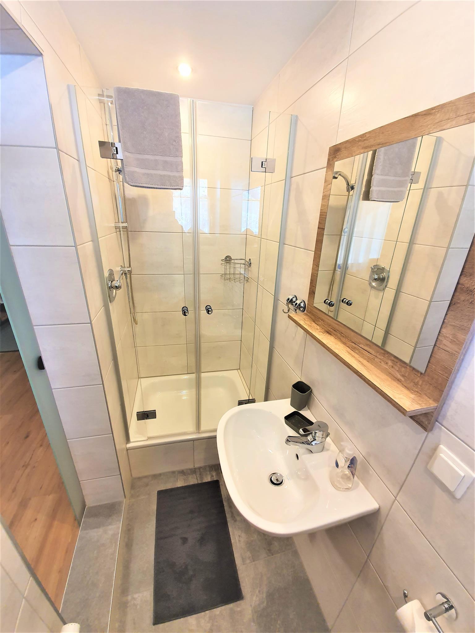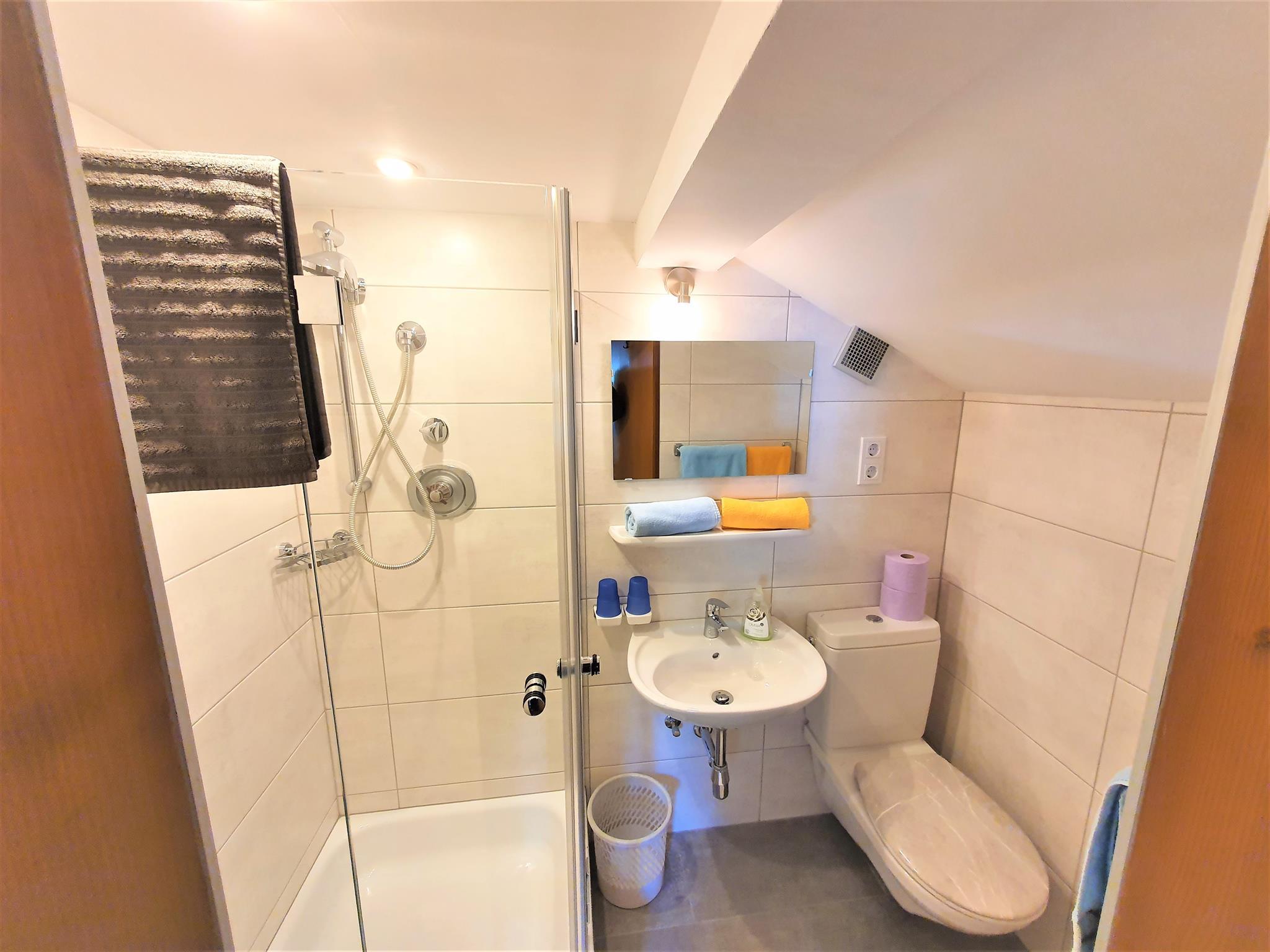 Sanitär: Dusche, Fön, Handtücher, warmes Wasser, Waschbecken, Waschmaschine (gegen Gebühr), Wäscheständer