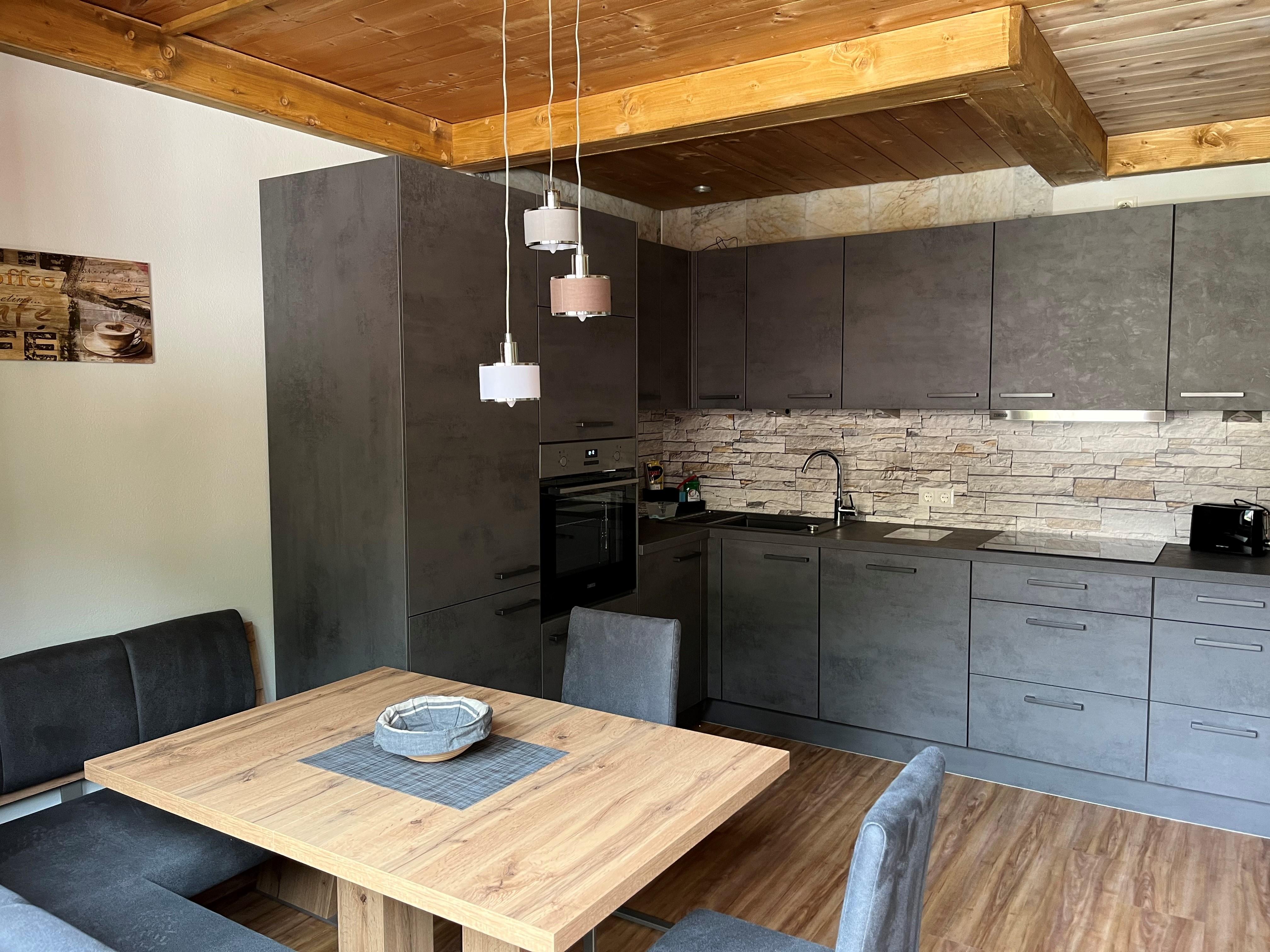• Vollausgestattete Wohnküche mit Küchenzeile, integriertem Dunstabszugsystem, Kühlschrank, Herd, Mikrowelle, Spülmaschine, Kaffeemaschine, Sitzecke und Couch, eigener Balkonzugang