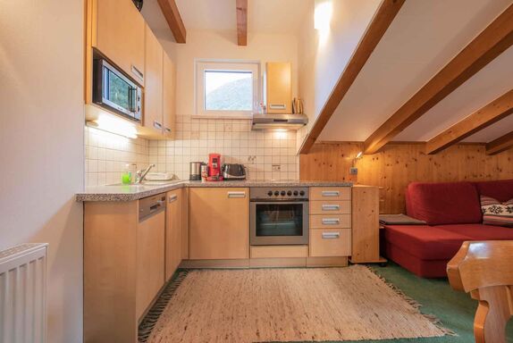 Die Küchenecke ist komplett ausgestattet mit Geschirrspüler, Mikrowelle, Backrohr, Toaster, Wasserkocher und Kaffeemaschine inkl. Pads.