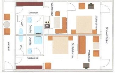 Ferienwohnung Brunelle Für 2 – 5 Personen ca 65 m2 Unsere sonnige und gemütliche Ferienwohnung Brunelle 2 Schlafzimmer, eines davon mit Doppelbett, eines mit Doppelbett und Wohnecke gemütliche und gut eingerichtete Küche mit Eßecke, Vorraum und Balkon 2 mal Dusche und separatem WC Sat-tv, Radio und gratis W-lan Internet