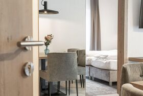 Appartement mit 1 Doppelzimmer, Wohnraum mit Schlafsofa für 1 Person, komplett eingerichtete Kochnische mit 2-Platten-Herd, 1 Badezimmer mit Badewanne mit Duschwand, WC und Fön, Kabelfernsehen, Zimmersafe. Größe: ca. 32 m²
