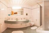 • Badezimmer mit Dusche, WC und Doppelwaschbecken