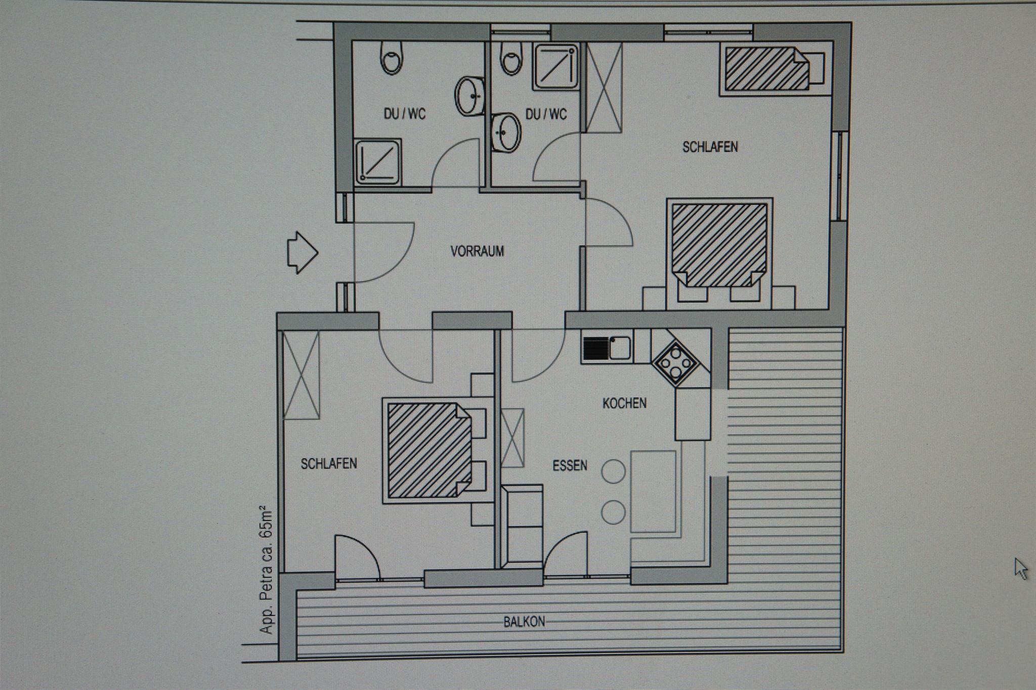 Wohnung Petra ca. 65m² mit 2 getrennten Schlafzimmern, 2x DU/WC, Balkon und Wohnküche, bis 6 Personen, beide Zimmer sowohl auch die Küche verfügen über Sat.TV
