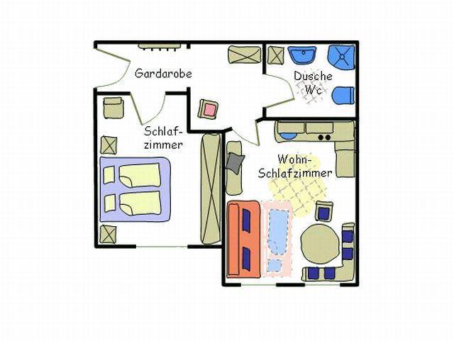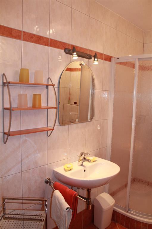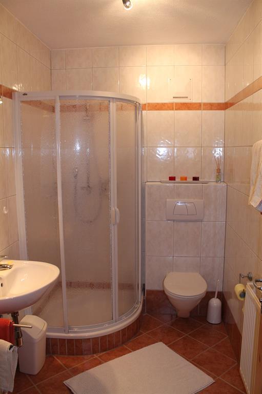 Apartment mit ca. 45 m² mit 1 Schlafzimmer, voll ausgestattete Wohnküche (Backrohr, Mikrowelle, Kaffeemaschine, Toaster usw.) mit ausziehbarer Doppelcouch, Sat-TV, W-Lan, Dusche/WC, kleine Terasse und Liegewiese; auf Wunsch Brötchenservice;