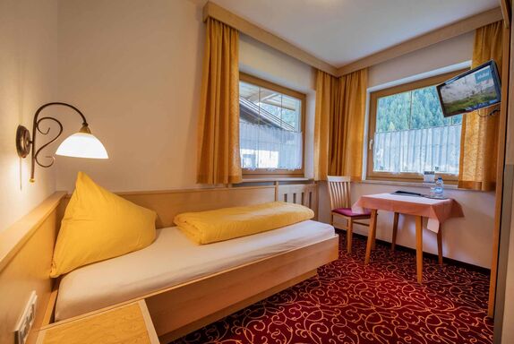 Unser gemütliches Einbettzimmer befindet sich im Parterre und ist mit Dusche/WC, Haarfön, Sat-TV und Radio ausgestattet.