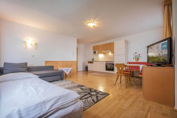 1 Schlafzimmer, Bad mit Dusche/WC, 1 Wohnküche mit ausziehbarer Doppelcouch, Kabel-TV, Balkon oder Terasse.