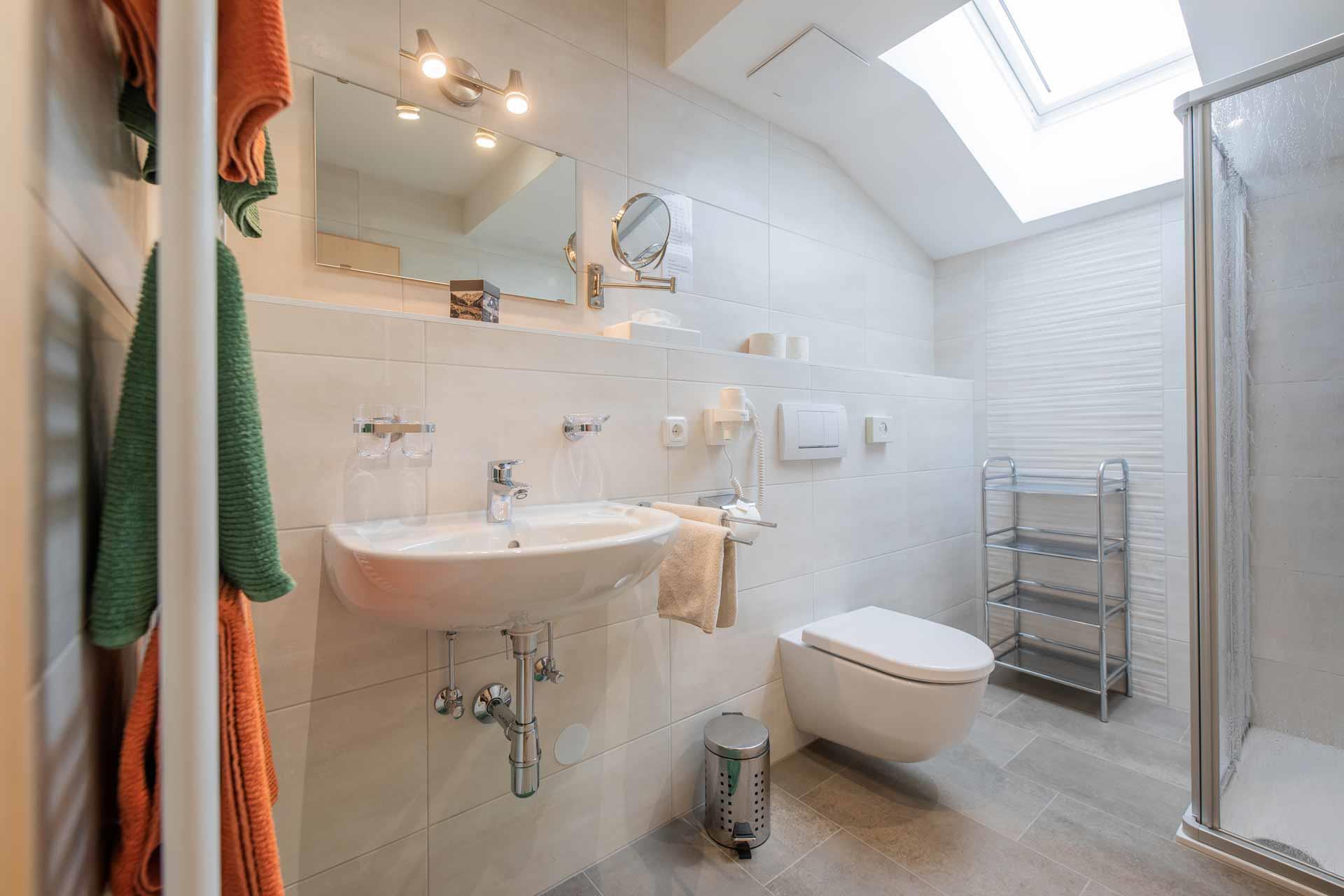 Dusche und WC ,Fön,Kosmetikspiegel, Badeutensilien.