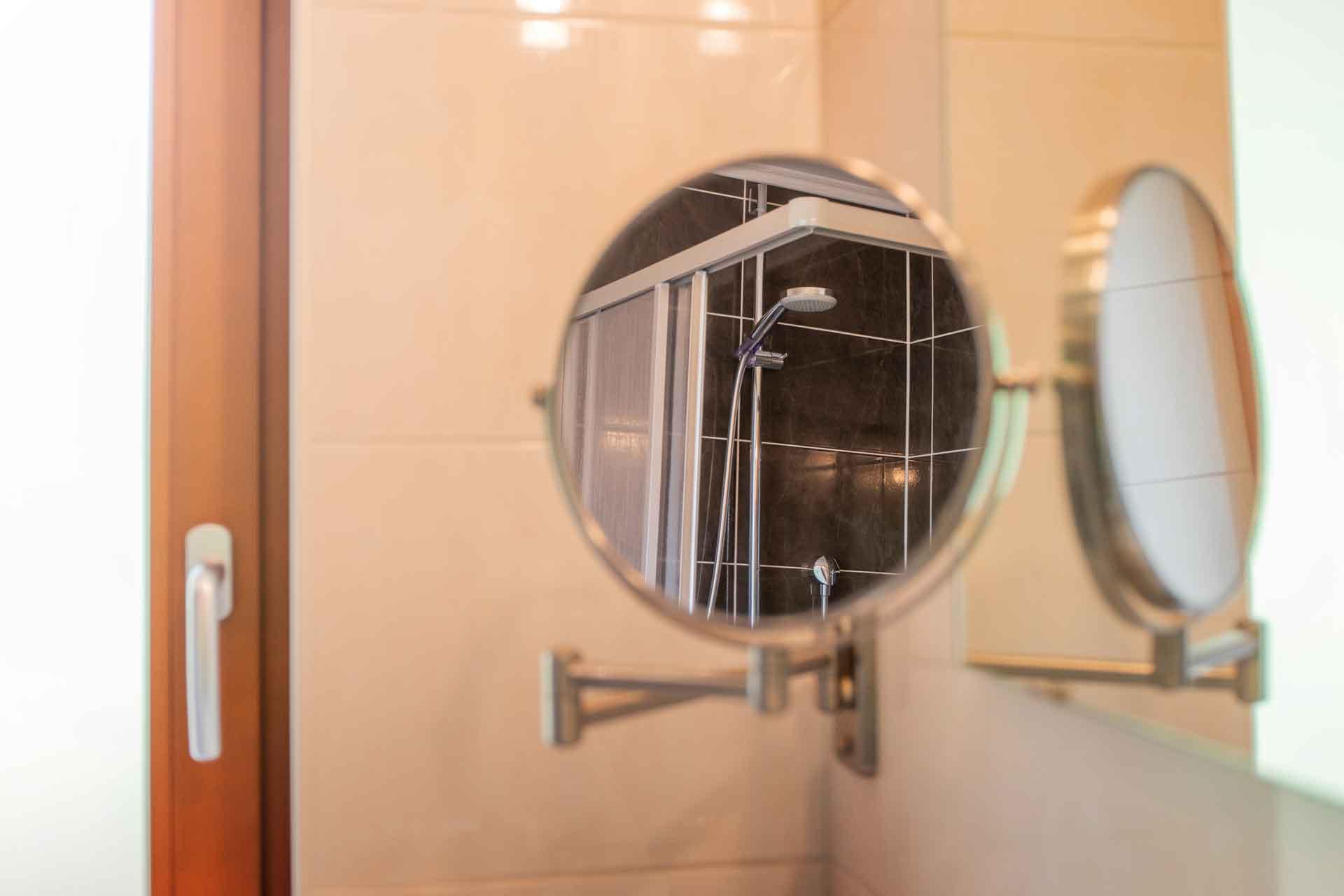 Ein Schlafzimmer einem Doppel- und einem Einzelbett, Balkon,Dusche und WC getrennt und vom Wohnraum aus begehbar,Fön,Kosmetikspiegel, Badeutensilien.