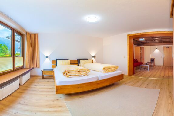 Großes Dreibettzimmer mit viel Platz – Nichtraucher - ca.42 m², mit großem Doppelbett, Bettengröße 2,00 m x 2,00 m und einem Einzelbett, Bettengröße 0,90 m x 1,90 m Großes Wohlfühlzimmer mit Panoramafenstern ohne Balkon, großes Doppelbett, kleine Tee/Kaffeeküche, Kühlschrank, Wohnzimmer mit gemütliche Sitzecke, Flachbildschirm mit Sat-TV, integriertem Radio und Info Kanal, Safe, kostenloses W-LAN, Einzelbett; Badezimmer mit Dusche, WC, Föhn, Pflegeprodukten, Kosmetikspiegel! Ideal für ° Familien, die so viele Sachen dabei haben ° Familien, die abends noch in der Sitzecke gemeinsam spielen ° Paare, wo einer immer etwas länger fern sieht während der andere schon schläft ° Freunde, die zwar im selben Zimmer, aber in getrennten Betten übernachten möchten