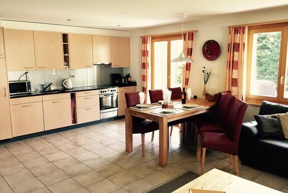 Sehr schöne 3.5-Zimmerwohnung im Erdgeschoss (87 m2) von einem Mehrfamilienhaus. Wohn-Esszimmer mit Backofen, Kühlschrank, Geschirrspüler, Kaffeemaschine, Fondue-Set, Wasserkocher und Küchentücher. Wohn-Esszimmer mit Kabelfernseher, DVD-Player, Radio sowie CD-Player. Schlafzimmer mit Doppelbett sowie Schlafzimmer mit 2 Einzelbetten. Duvets synthetisch. Bad/WC, separates WC. Terrasse, Garten zur Mitbenützung, Gartenmöbel, Grill, Einstellhalle, Mitbenützung Waschmaschine und Tumbler, Abstellraum, Zentralheizung. Nichtraucherwohnung.