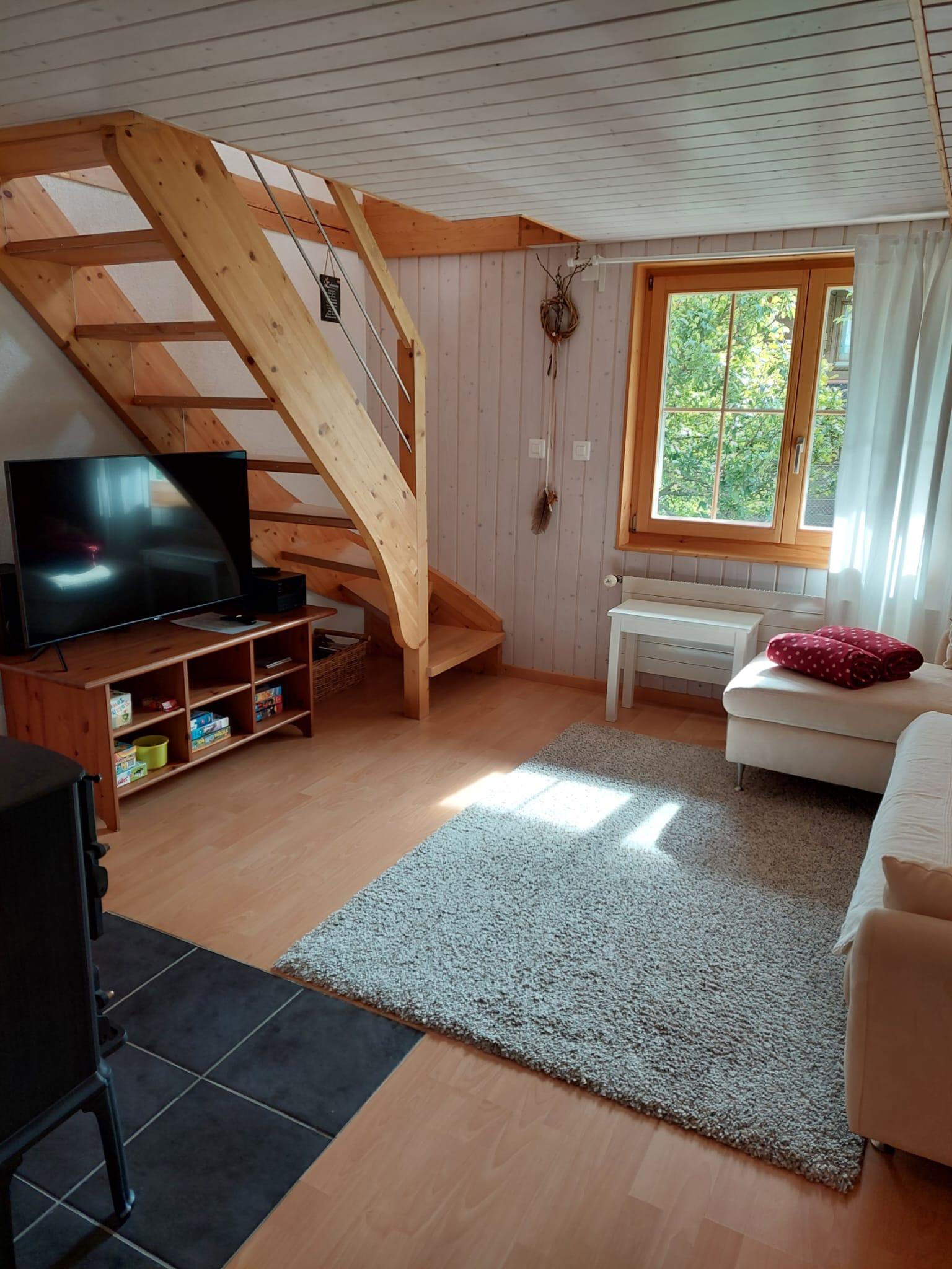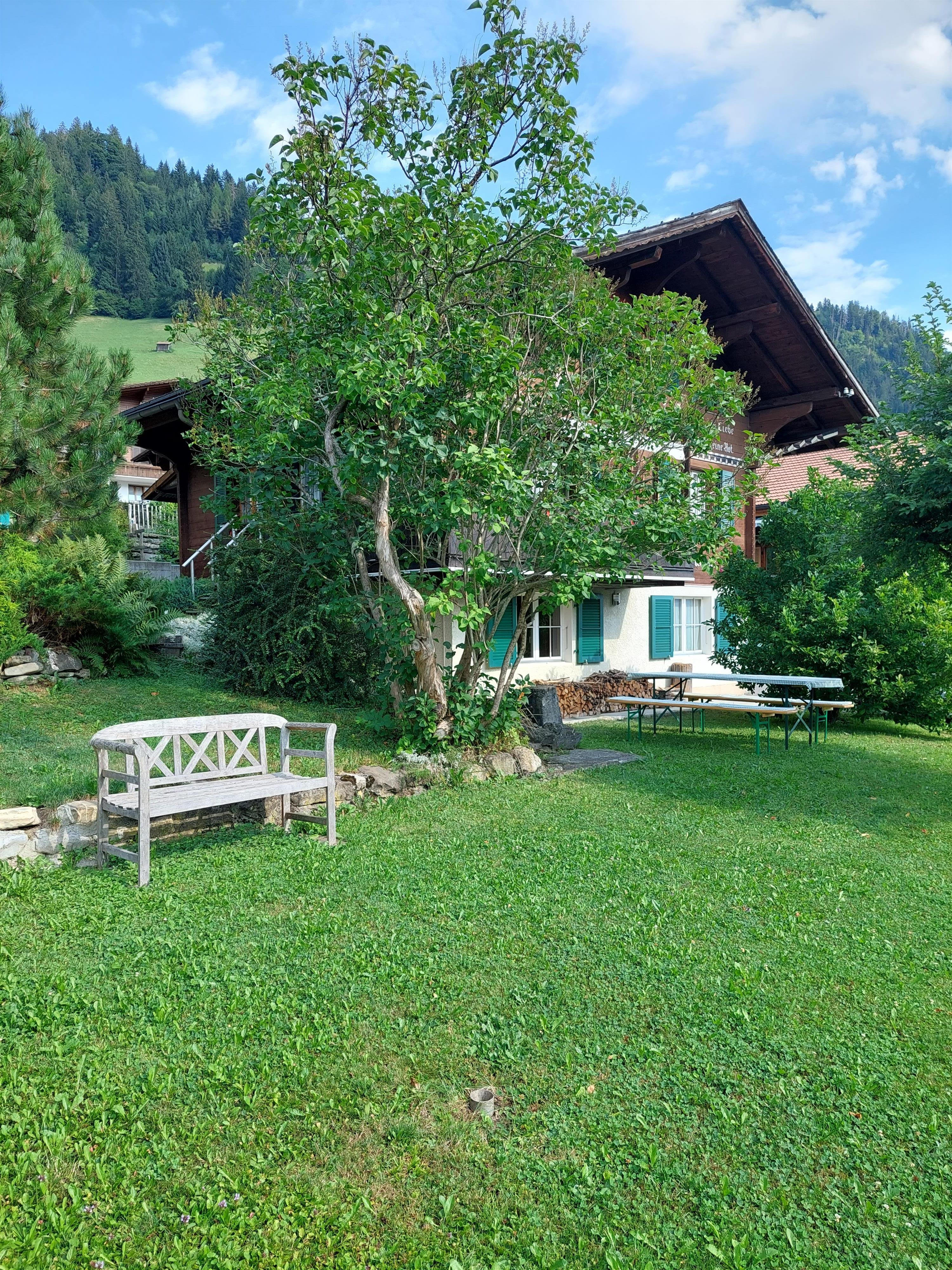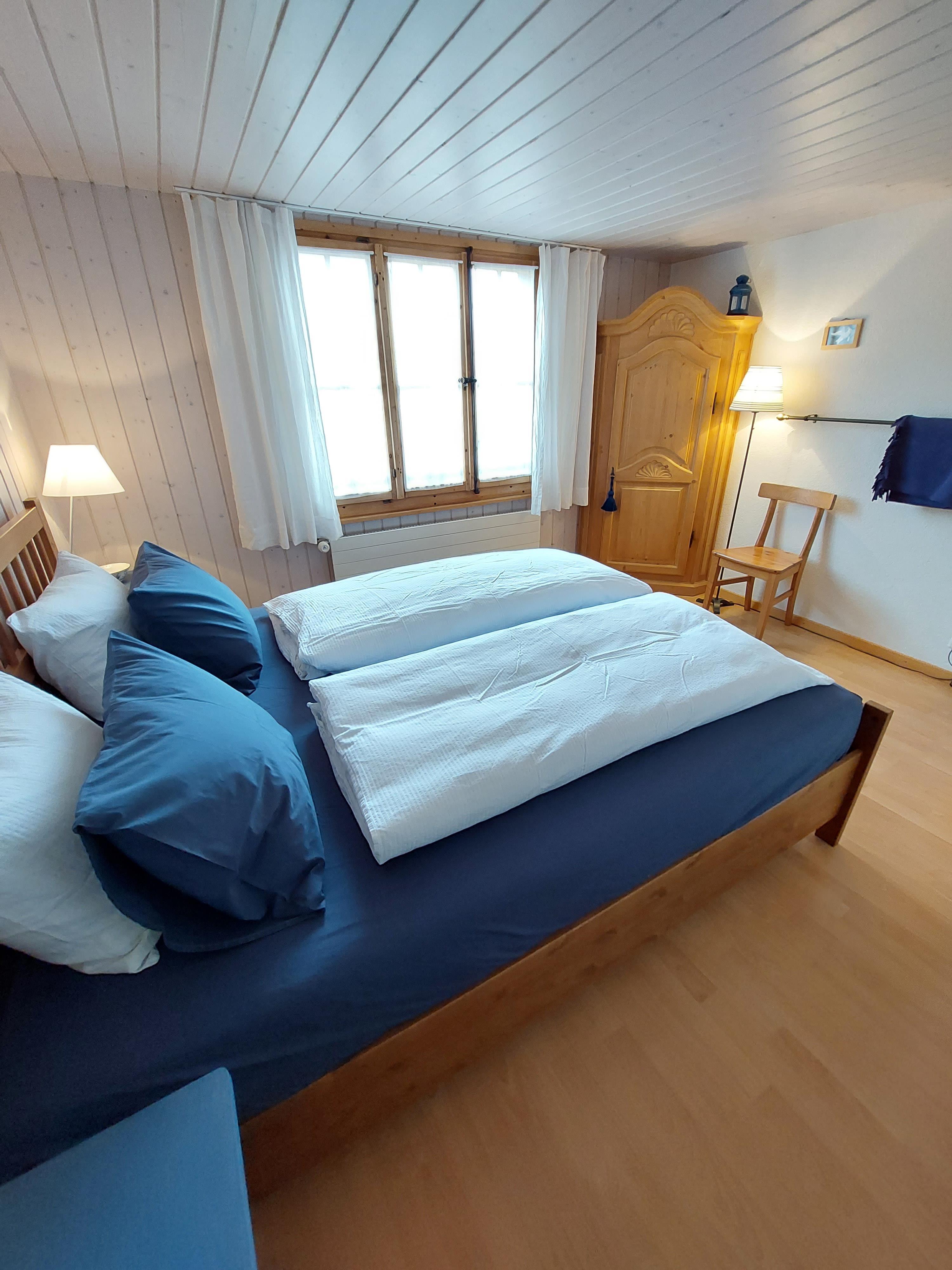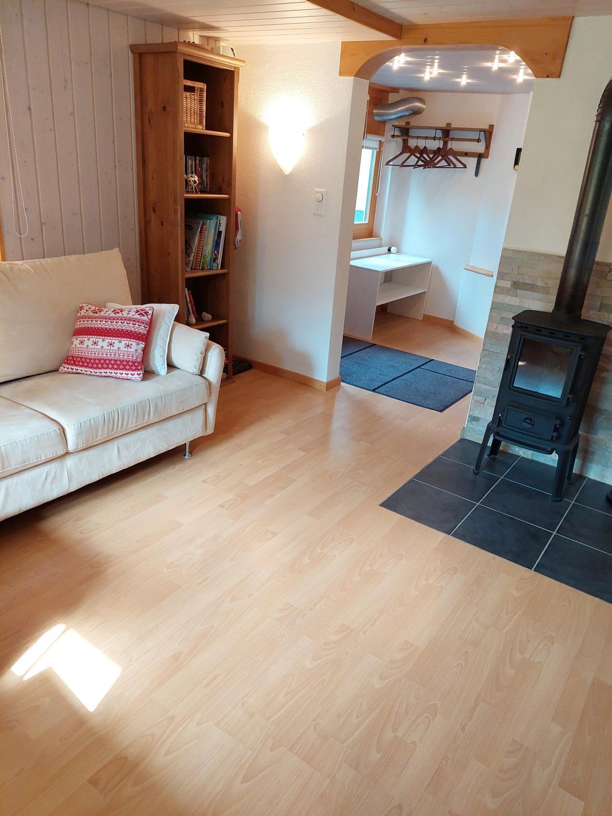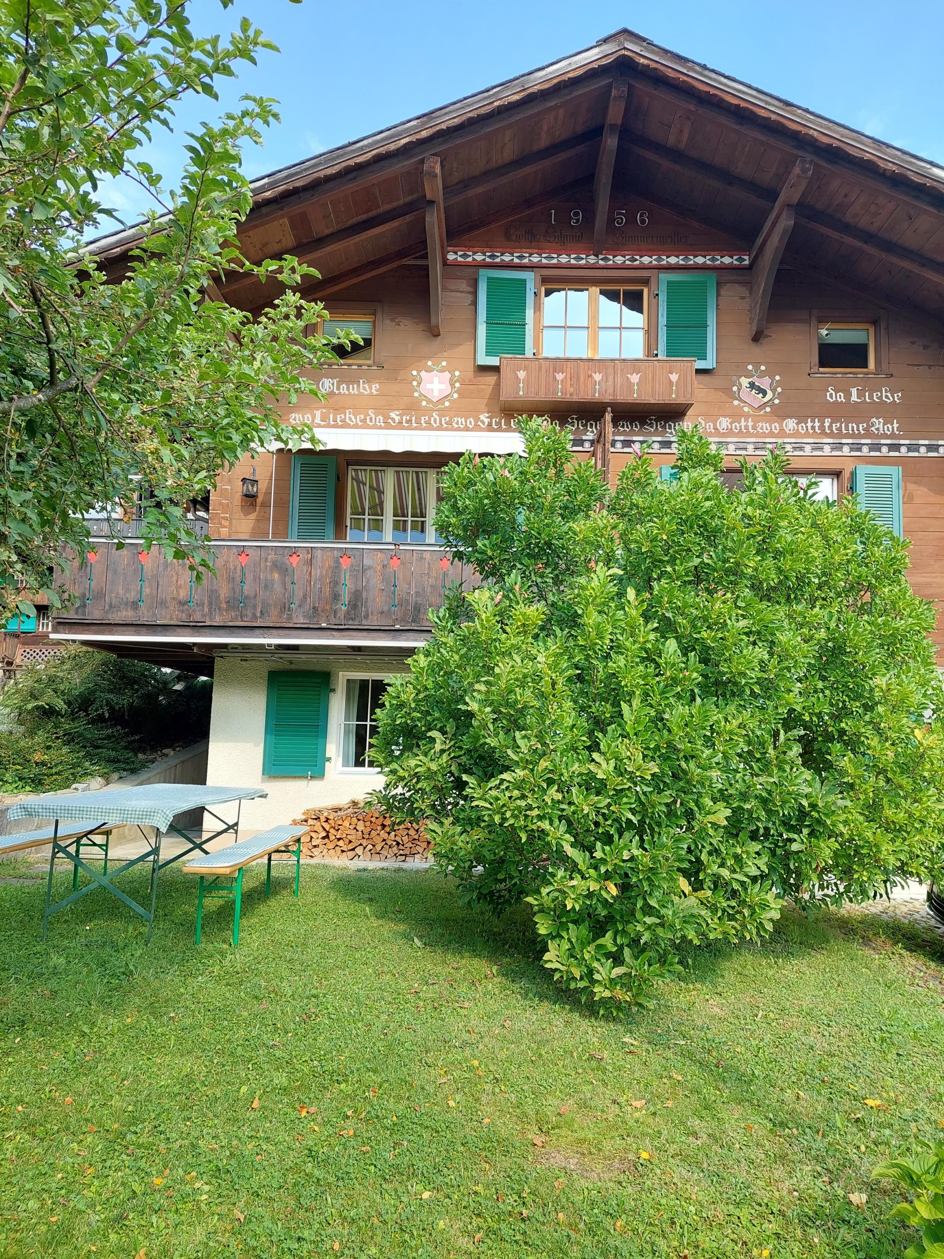 Schöne 3-Zimmer-Maisonette Wohnung (65m2) im Parterre und 1. Stock in einem Chalet mit 2 Wohnungen. Das Chalet liegt an erhöhter und ruhiger Lage unweit vom Dorfzentrum entfernt. Der Balkon mit schöner Bergsicht und der idyllische Garten laden zum verweilen ein. Eingangsbereich mit Garderobe und Schuhablage. 1 Schlafzimmer mit Doppelbett (160x200cm) im Partette, 1 Schlafzimmer mit Doppelbett (160x200m) im ersten Stock. Wohnzimmer mit Sitzecke, Kabel-TV/Radio. Gratis WiFi. 1 Badezimmer mit Dusche/WC. Gut ausgestattete Wohnküche mit separatem TV, Glaskeramikkochfeld, Backofen, Kühlschrank inkl. Gefrierfach, Filter-Kaffeemaschine, Racelette- und Fondueset, Wasserkocher, Toaster. Die Wohnung verfügt über eine Zentralheizung. Zusätzlich gibt es im Wohnzimmer einen Kaminofen. Die Parkplätze befinden sich direkt beim Haus. Haustiere sind nicht erlaubt. Nichtraucher Wohnung. Wie oftmals in älteren Chalets üblich, ist die Raumhöhe niedriger als gewohnt (ca. 2.00 Meter). Bettwäsche, Frotteewäsche sowie Küchentücher sind vorhanden.