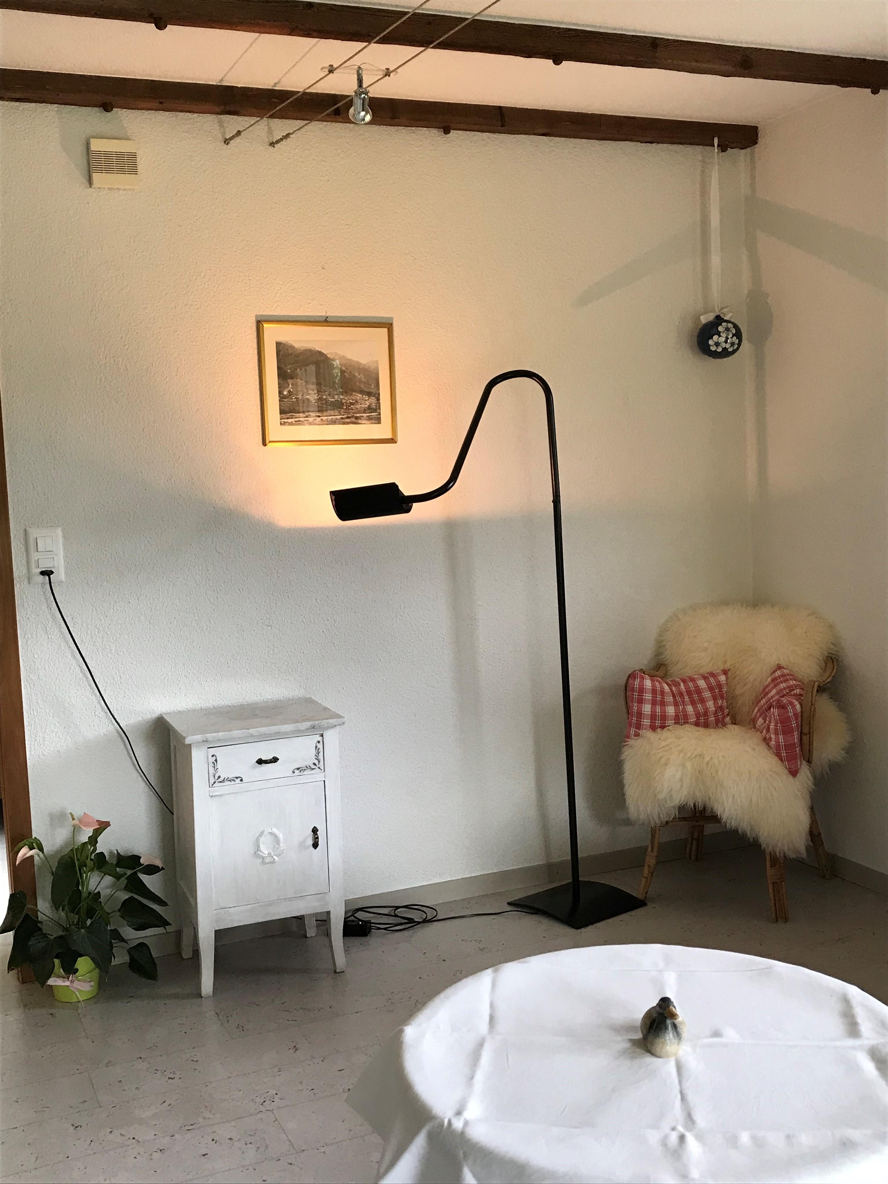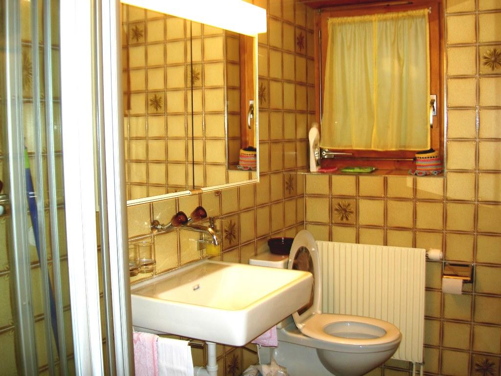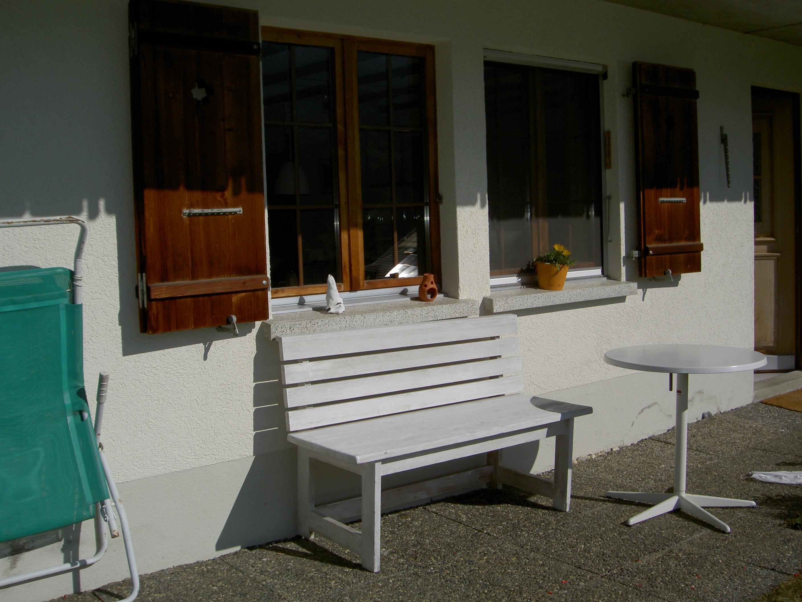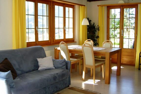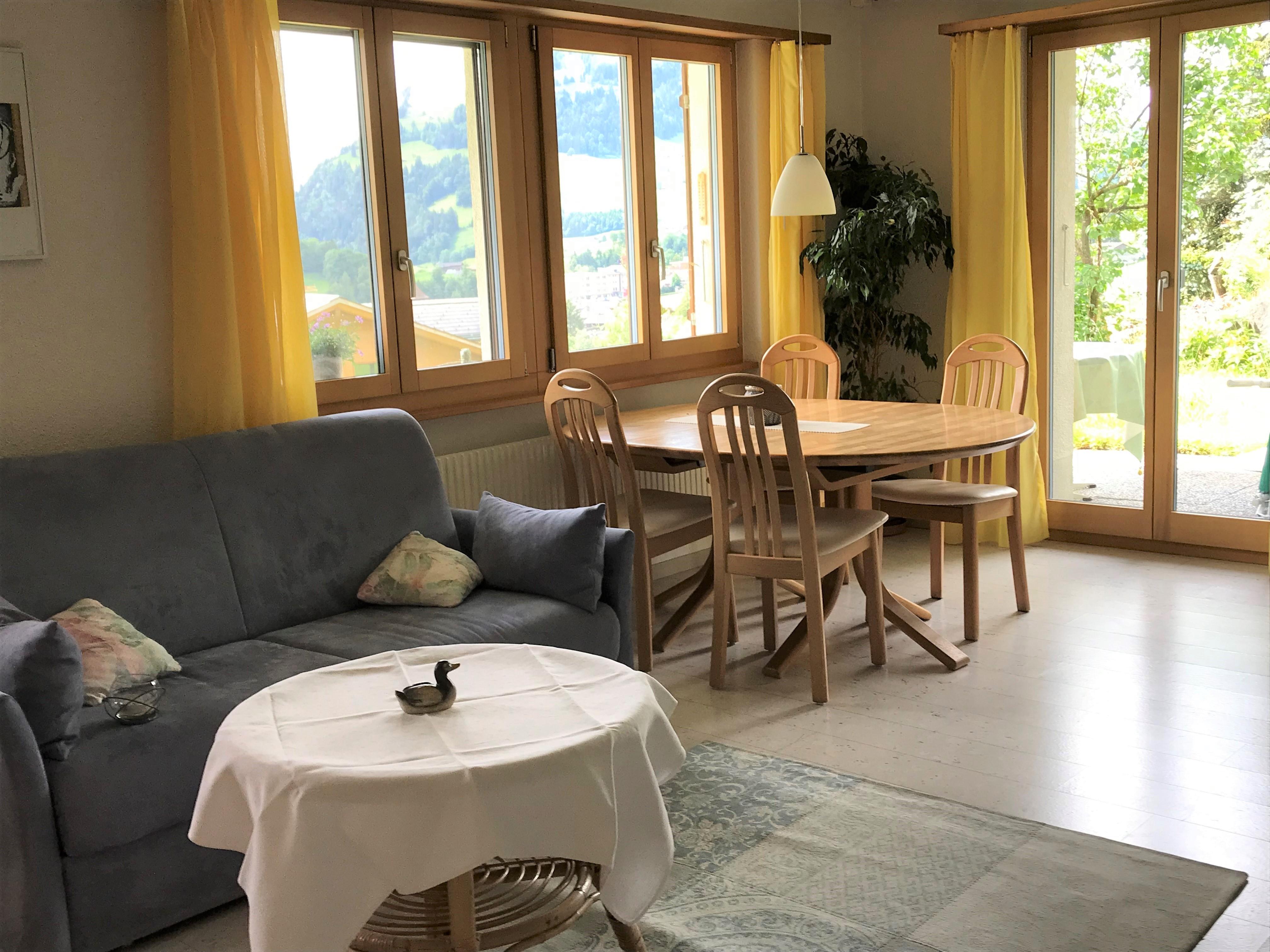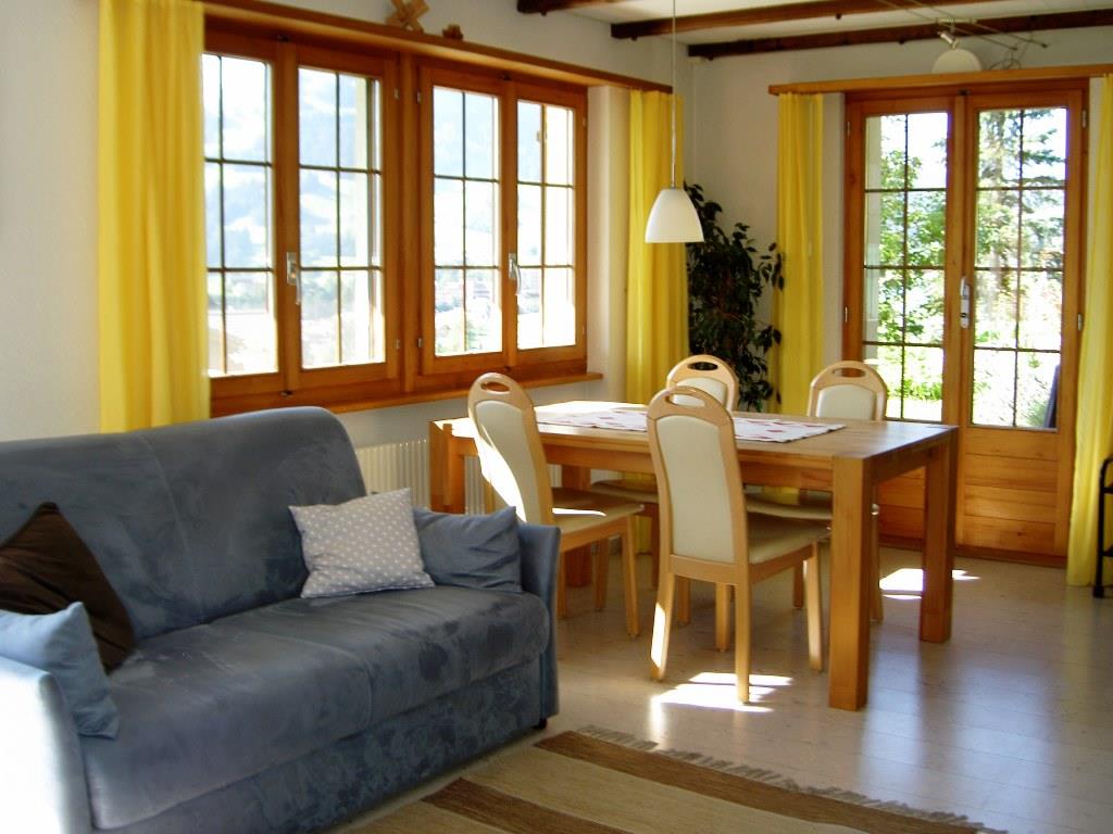 2-Zimmerwohnung im Parterre (45 m2) eines Einfamilienhauses. An erhöhter Lage, sonnig und ruhig, mit schöner Aussicht auf das Dorf und die Berge. 2 Autominuten oder 10 Gehminuten zu Fuss vom Dorfzentrum entfernt. 1 Schlafzimmer mit Doppelbett. (Zusätzliche Betten für 3./4. Person auf Ausziehsofa im Wohnzimmer, sowie Kinderbett auf Anfrage.) Dusch, WC, Nespresso, od. Filter-Kaffeemaschine, Wasserkocher, neue Küche mit Abwaschmaschine, Glaskeramikkochherd, Backofen, Kühlschrank mit Gefrierfach, Raclette- und Fondueset zum Benutzen. TV, Radio, Internetanschluss WLAN, Waschmaschinen-Mitbenützung, Heizung. Gartenmöbel und Grill, Sonnenterrasse, Parkplatz, Skiraum. Haustiere sind nicht erlaubt. Nichtraucherwohnung. Zentrale Lage für Ausflüge ins Ski- und Langlaufgebiet, für Wanderungen, schöne Biketouren/E-Bike. Öffentliches Hallen- und Schwimmbad mit Fitnessanlage!