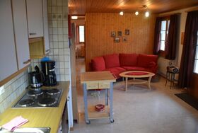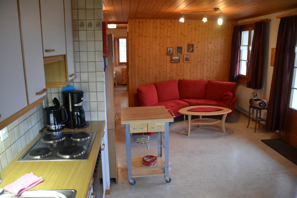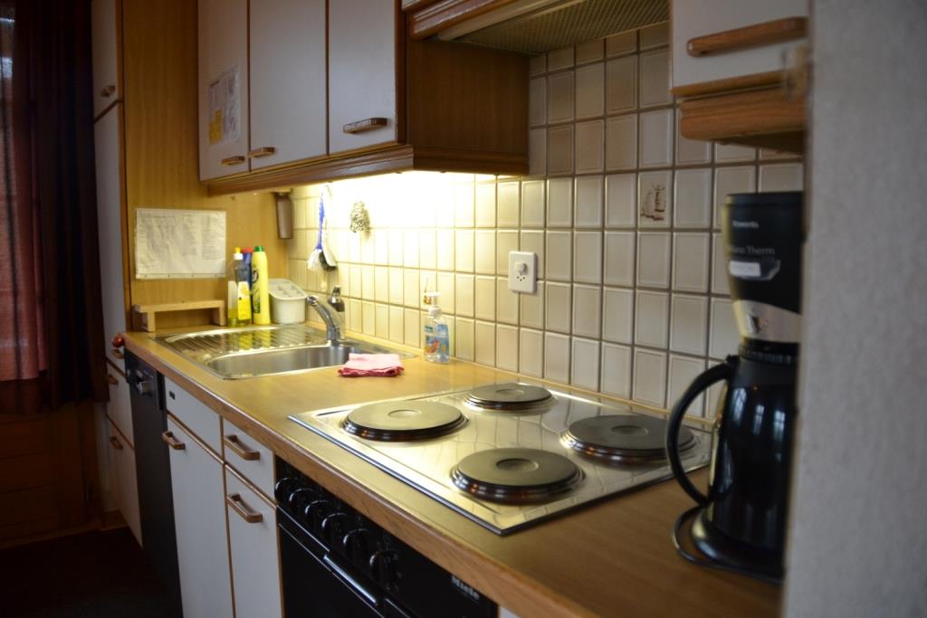 Wohnessküche, Tisch mit Eckbank, Spühlmaschine, Kühlschrank, diverses Küchenmaterial (Raclett, Fondue).